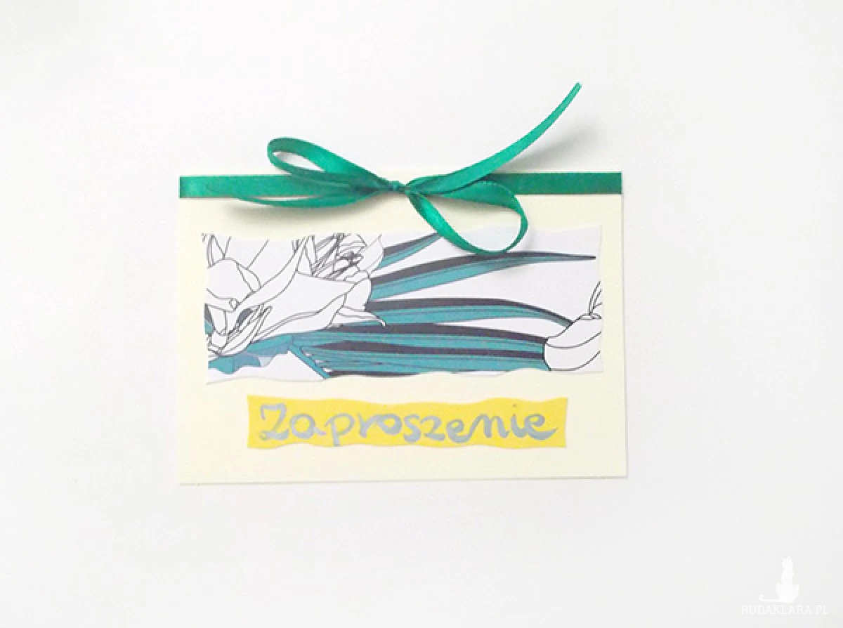 Uniwersalne, otwierane  zaproszenie  bez tekstu, kremowy kartonik, zielona wstążeczka. Dołączona biała koperta. Zaproszenie na dowolne wydarzenie, imprezę, okazję, uroczystość.