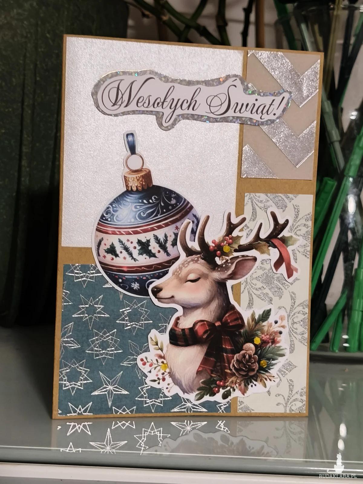 Kartka przedstawiająca choinkę i głowę renifera z ozdobami świątecznymi. Tło w tonacji zieleni z oraz srebrnymi geometrycznymi wzorami. Napis „Wesołych Świąt!” na górze.