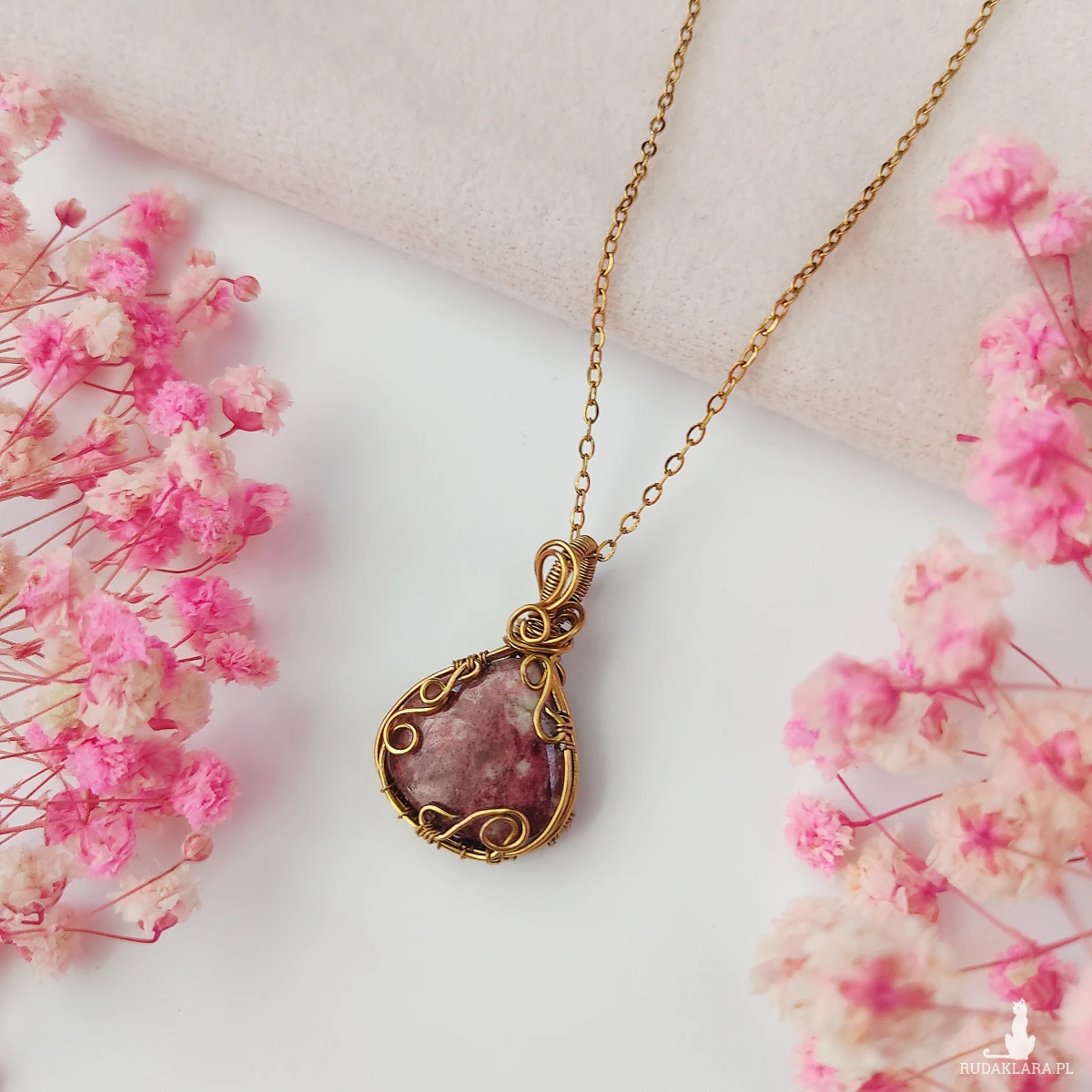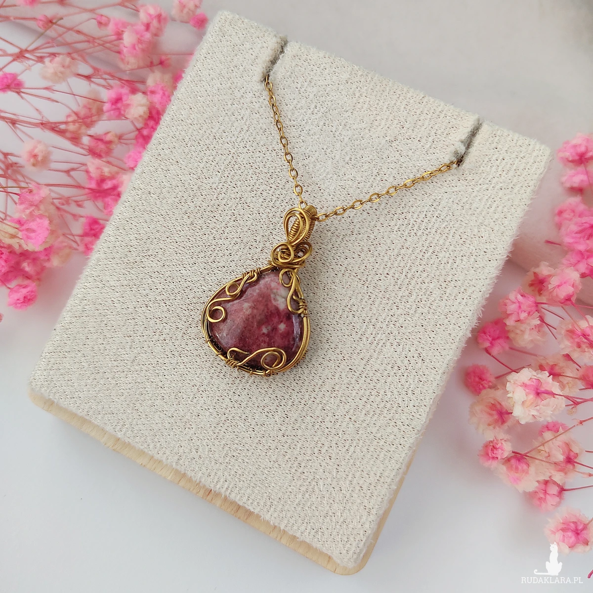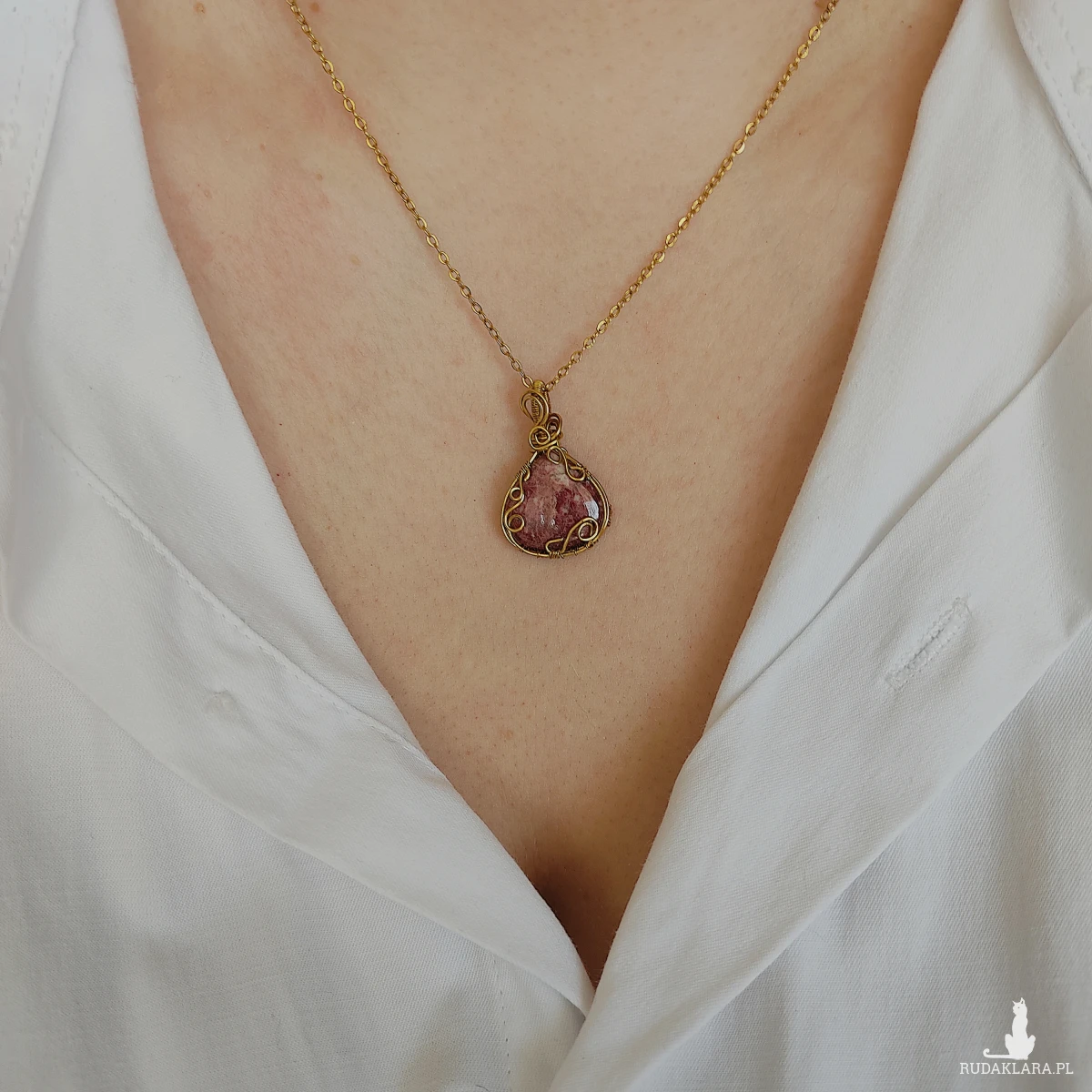 Naszyjnik z thulitem to wyjątkowy dodatek, który łączy w sobie elegancję, symbolikę i rękodzielniczą precyzję. Wykonany metodą wire wrapping, wyróżnia się misternym oplataniem naturalnego kamienia cienkim drutem. To podkreśla jego piękno i unikalny charakter. Użyta stal chirurgiczna została pozłacana 18-karatowym złotem, dzięki czemu biżuteria jest nie tylko trwała, ale także odporna na działanie czynników zewnętrznych.