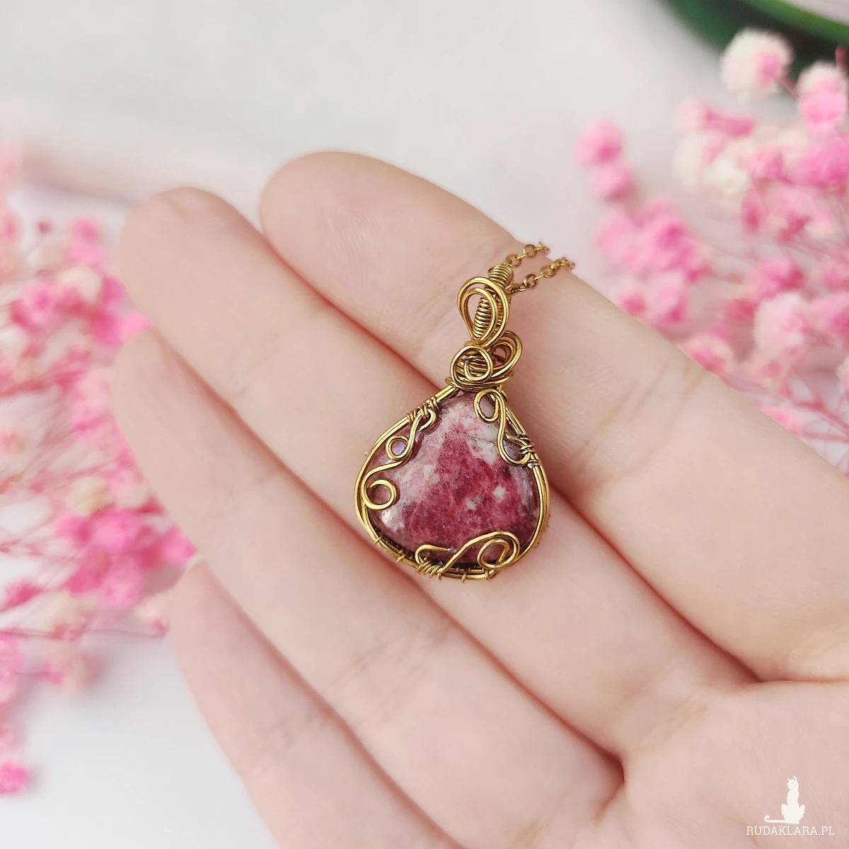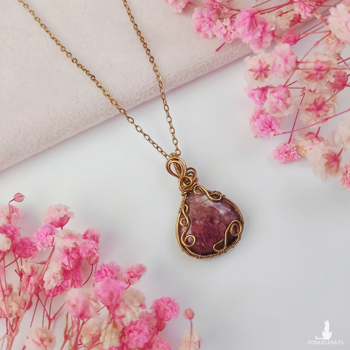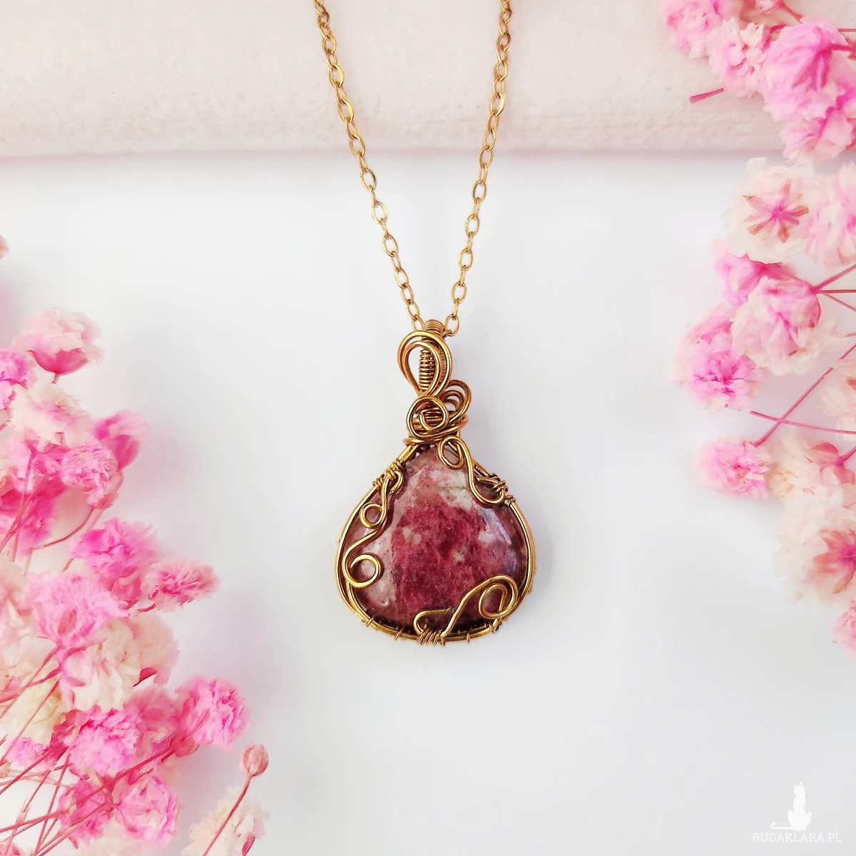 Naszyjnik z thulitem to wyjątkowy dodatek, który łączy w sobie elegancję, symbolikę i rękodzielniczą precyzję. Wykonany metodą wire wrapping, wyróżnia się misternym oplataniem naturalnego kamienia cienkim drutem. To podkreśla jego piękno i unikalny charakter. Użyta stal chirurgiczna została pozłacana 18-karatowym złotem, dzięki czemu biżuteria jest nie tylko trwała, ale także odporna na działanie czynników zewnętrznych.