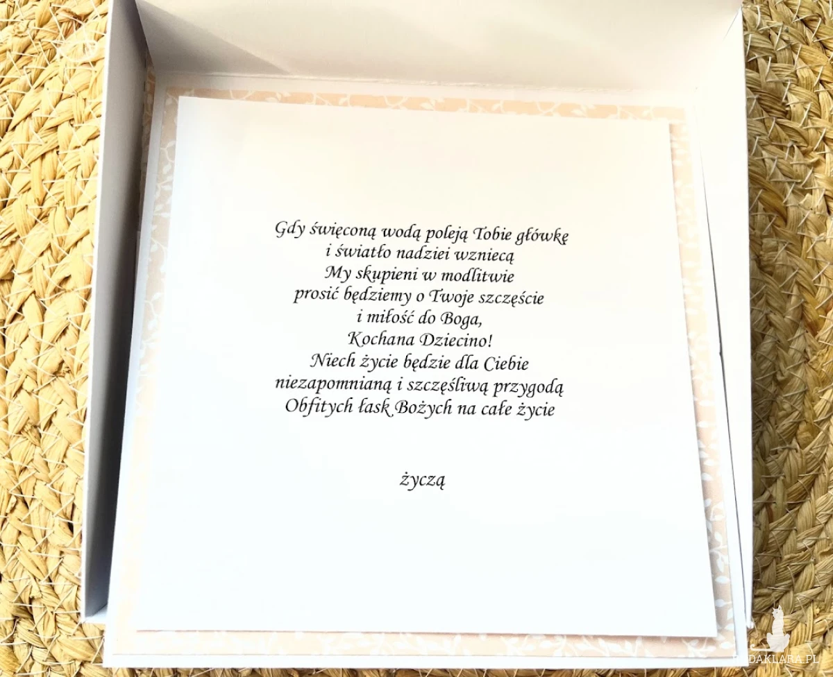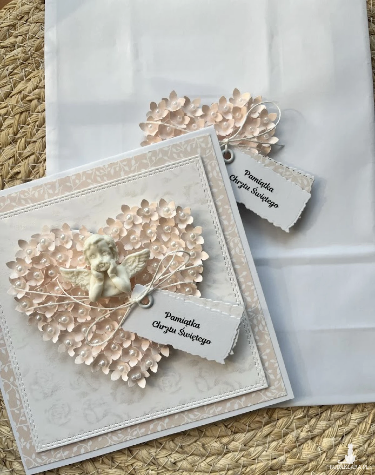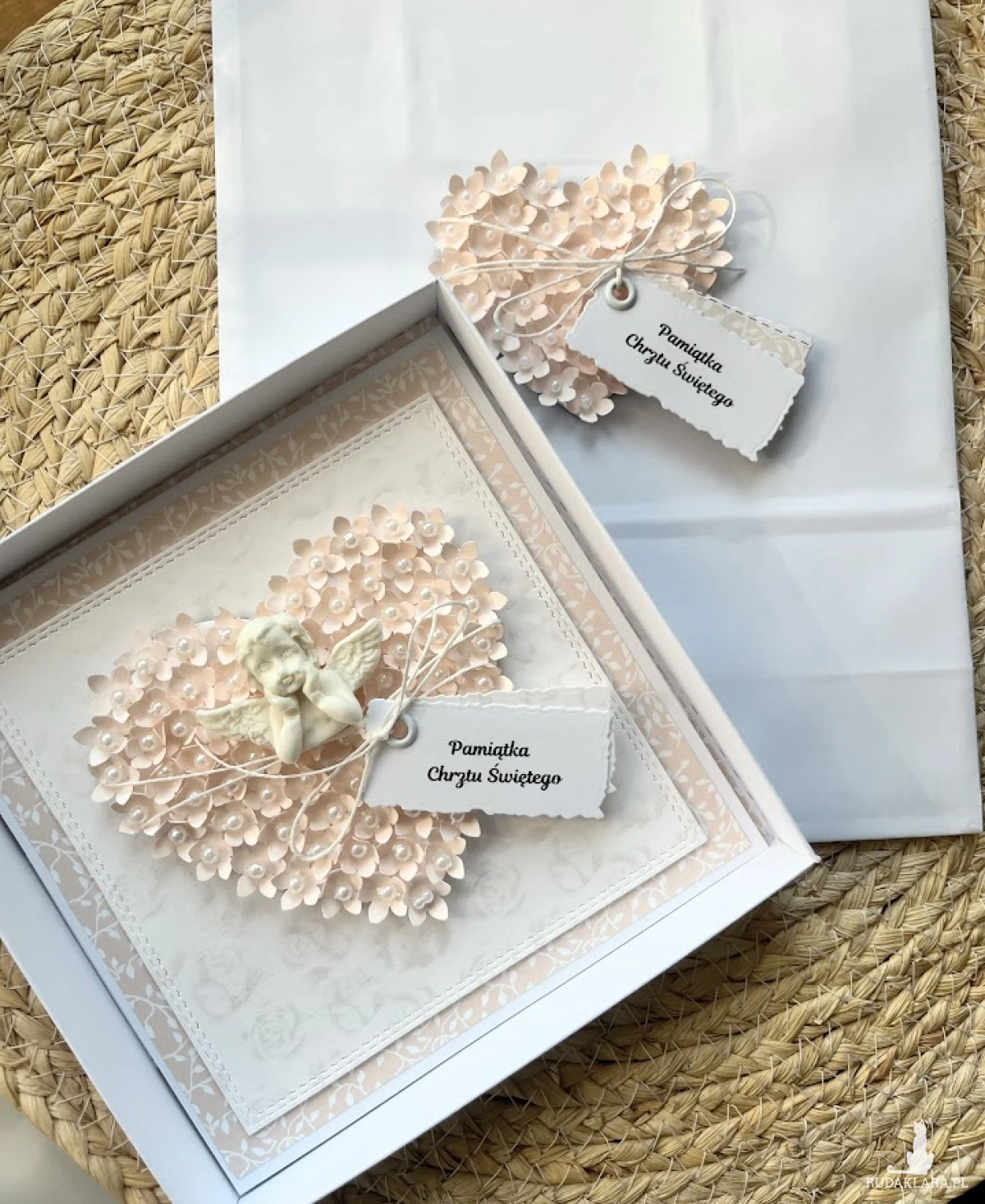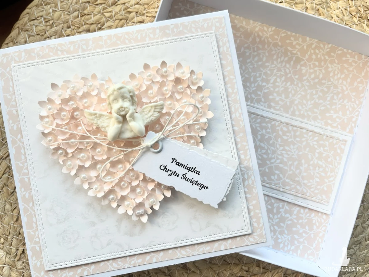 Kartka wykonana metodą scrapbookingu z najwyższej jakości materiałów.Kartka warstwowa z urokliwym sercem stworzonym z kwiatów, ręcznie stworzonych. Wykonane na białej bazie w z dodatkiem morelowego koloru.Wielkość kartki to 14,5 x 14,5 ,a pudełka z transparentnym wieczkiem to 15 x 15. Do kompletu dołączono białą torebkę ma wym. 21x18x8. Wewnątrz pudełka umieszczono kieszonkę na małe co nieco a wewnątrz kartki umieszczono gotowe życzenia. Jest możliwość dodania imienia Dziecka .Podczas zamówienia w uwagach proszę wpisać imię.