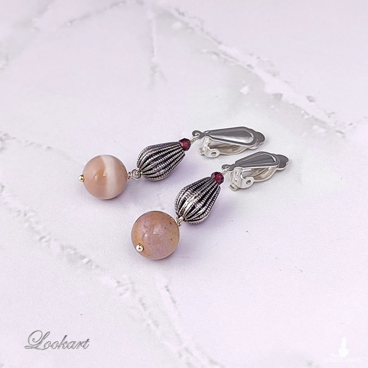 Klipsy są wykonane ze srebra próby 925, zawieszone kule Mokaitu (10 mm) oraz maleńkie szlifowane kulki granatu (3 mm).