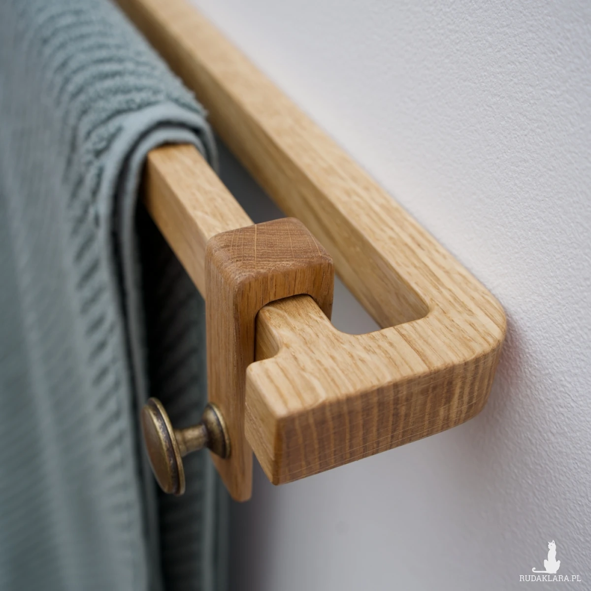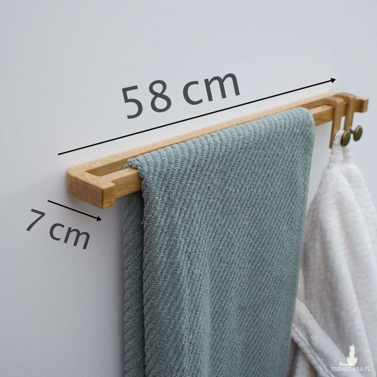 Wprowadź naturalną harmonię i porządek do swojego wnętrza dzięki naszemu wieszakowi łazienkowemu z drewna dębowego. Ten wiszący wieszak na ręczniki ścienny o długości 58 cm łączy w sobie prostotę, funkcjonalność i estetykę inspirowaną naturą. Każdy egzemplarz wykonany jest unikatowy – różni się rysunkiem słojów, odcieniem i strukturą, co nadaje mu wyjątkowego charakteru.
