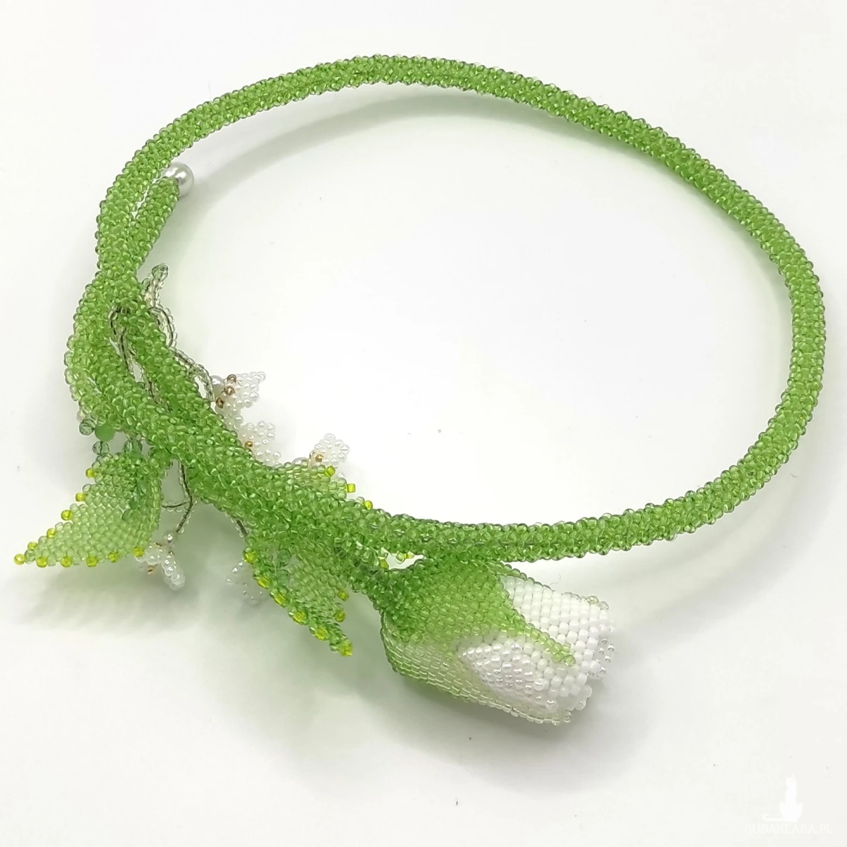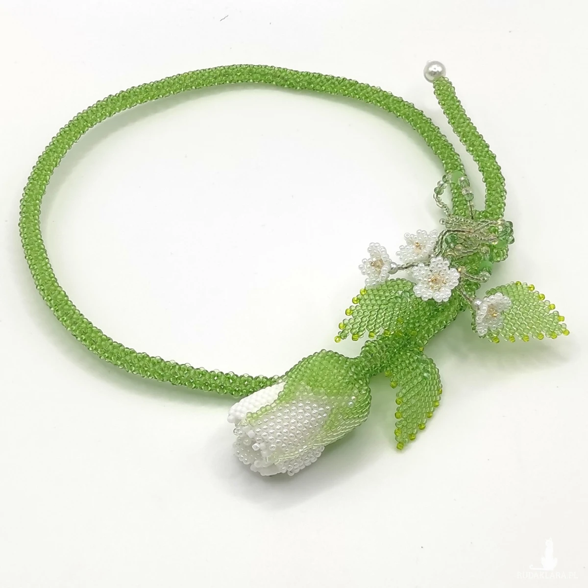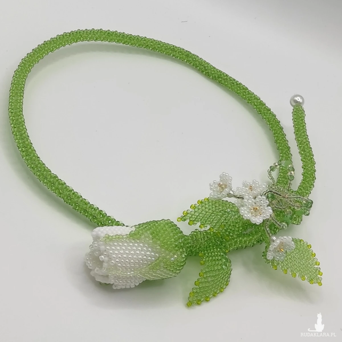 Naszyjnik wykonane ręcznie technika beadingu z koralików Toho 11/0 , kolor : biały, zielony + szlifowane kryształowe koraliki 4mm . Wypleciona dekoracyjna gałązka róży z jednym pąkiem z trzema listkami i 5 małymi kwiatkami . W łodygę wstawiłam drut jubilerski który umożliwia dopasowanie długości. Całkowita długość 65 cm . Całość wykonałam z najwyższą starannością z półfabrykatów