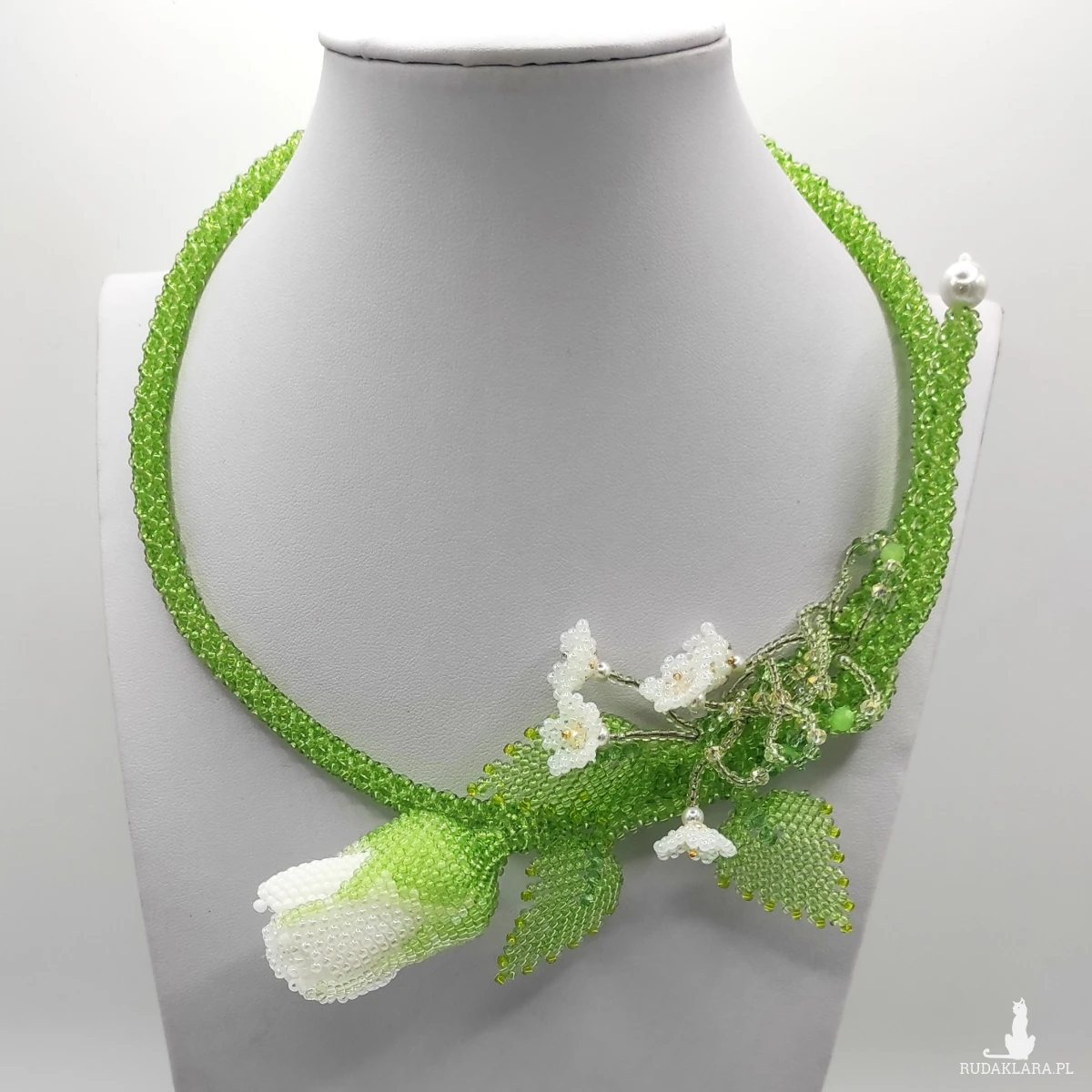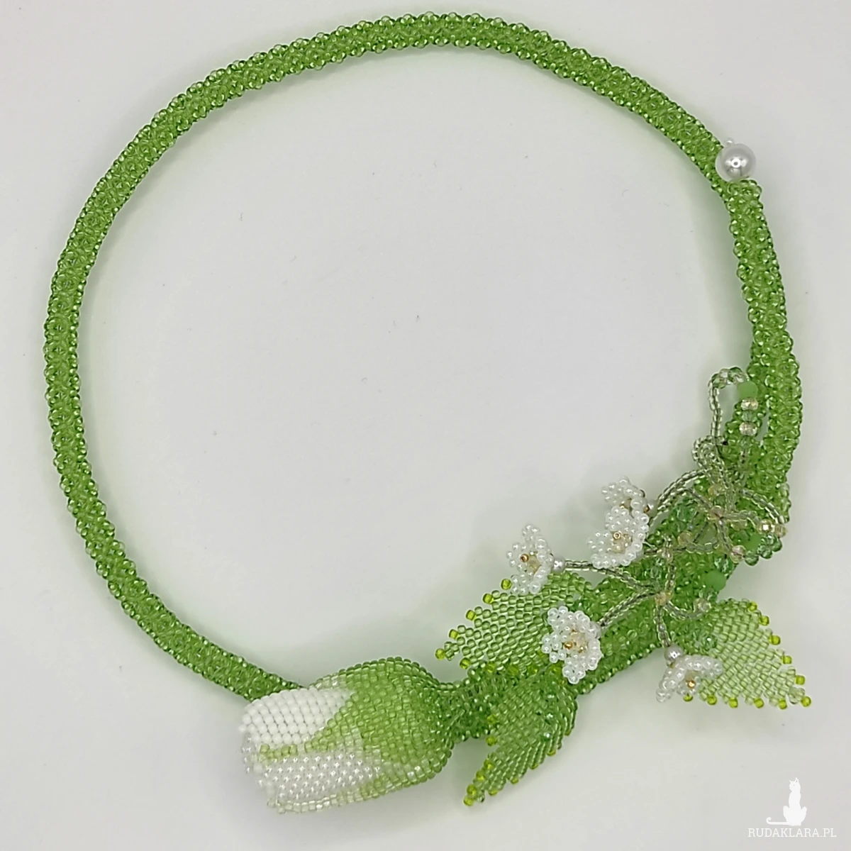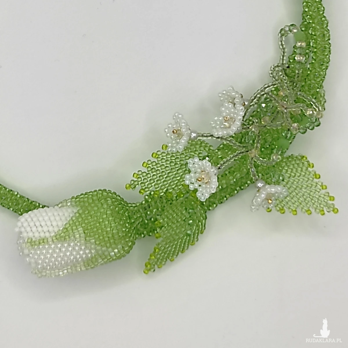 Naszyjnik wykonane ręcznie technika beadingu z koralików Toho 11/0 , kolor : biały, zielony + szlifowane kryształowe koraliki 4mm . Wypleciona dekoracyjna gałązka róży z jednym pąkiem z trzema listkami i 5 małymi kwiatkami . W łodygę wstawiłam drut jubilerski który umożliwia dopasowanie długości. Całkowita długość 65 cm . Całość wykonałam z najwyższą starannością z półfabrykatów