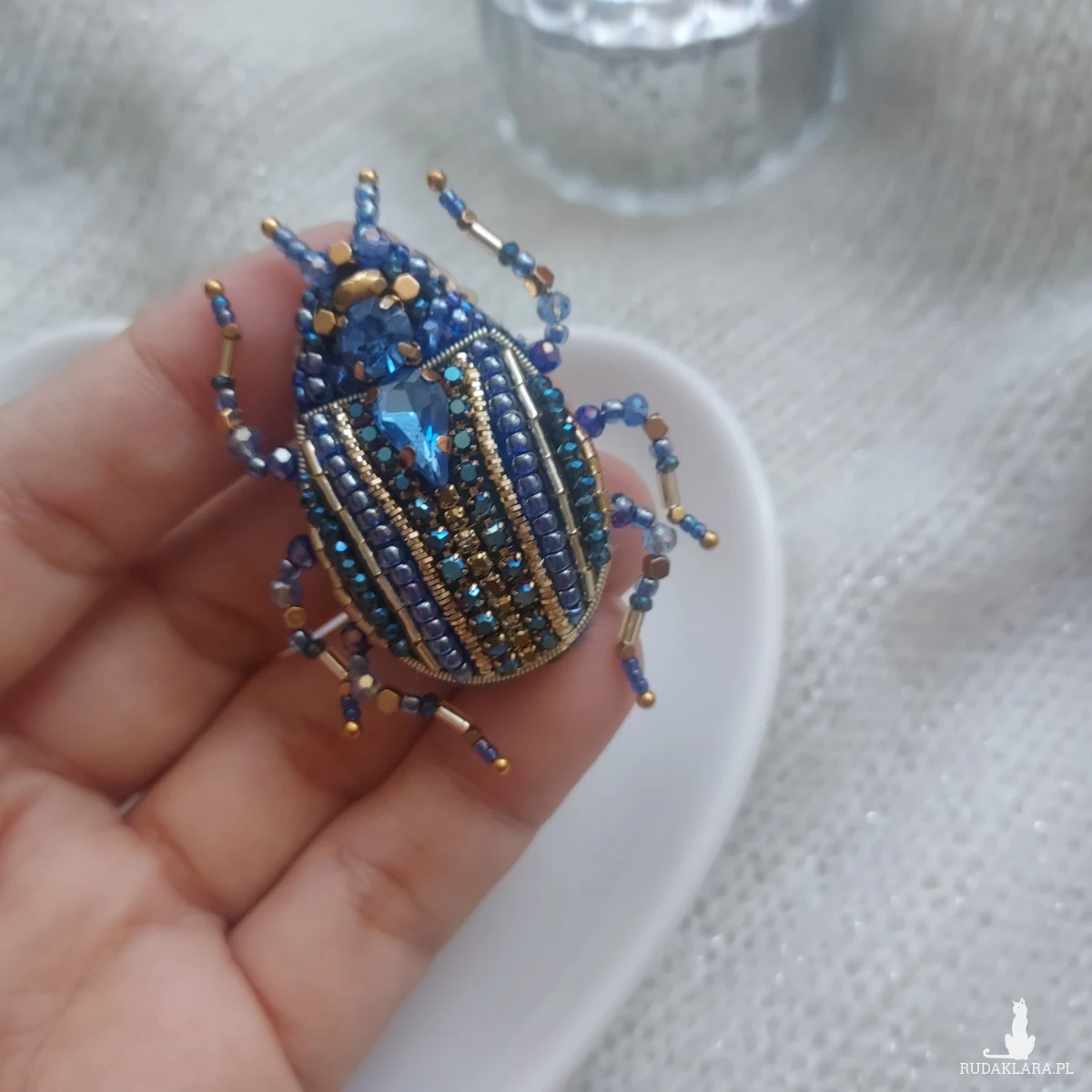 I tak powstała urocza broszka żuczek w kolorze niebiesko-złotym, która pięknie mieni się kryształkami oraz cyrkoniami w promieniach wiosennego słońca.