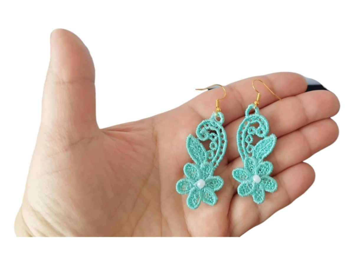 Kolczyki są haftowane (haft maszynowy).  Haft jest gęsty, dobrze utrzymuje kształt i wygląd kolczyków.  Haftowane kolczyki też są lekkie - to ich kolejny atut. Środek kwiatka w  kolczyku ozdobiony koralikiem. (koralik przyszyty ręcznie)