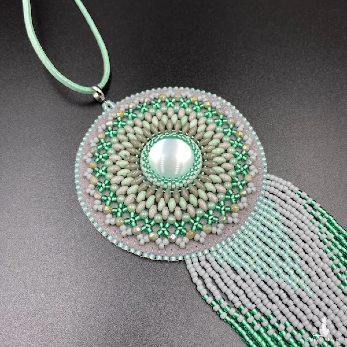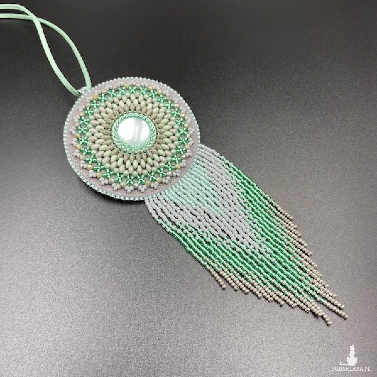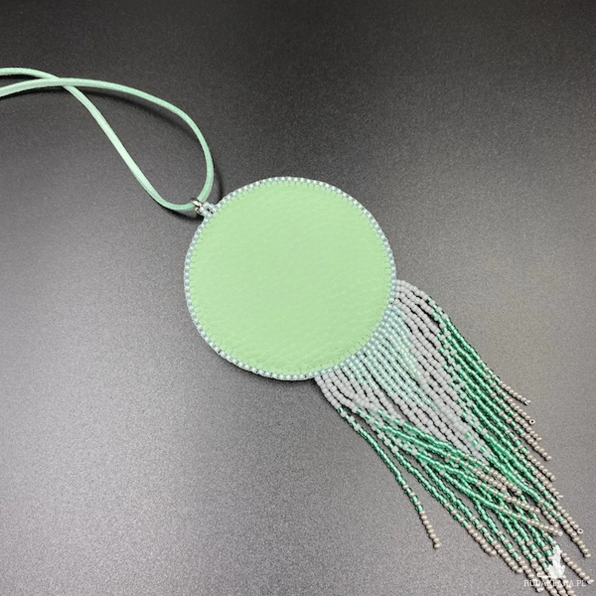 Kolory medalionu: odcienie szarości i mięty. Jego centrum to okrągły kaboszon akrylowy 20 mm, który opleciony został koralikami Toho, Fire Polish, SuperDuo i zakończony ozdobnymi frędzelkami z efektem cieniowania. Zawieszony został na rzemieniu zamszowym w kolorze jasnej mięty. Tył podszyty eko skórką. Elementy metalowe ze stali chirurgicznej w kolorze srebrnym.