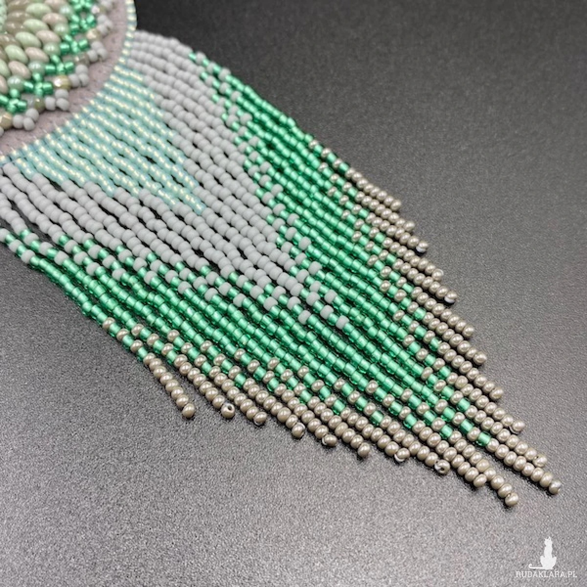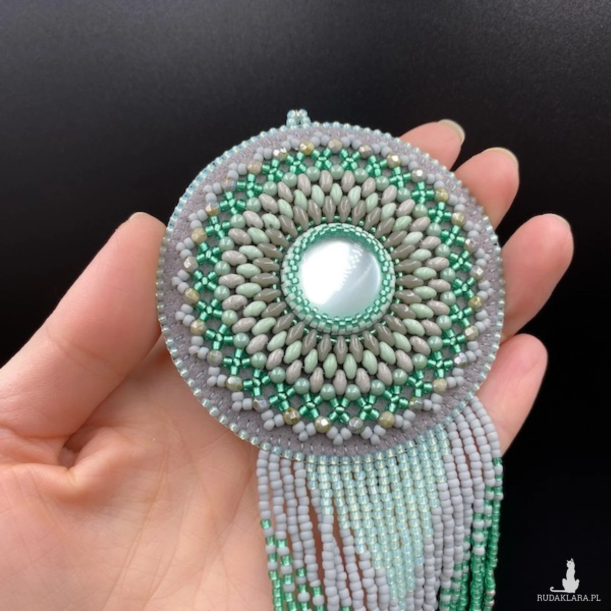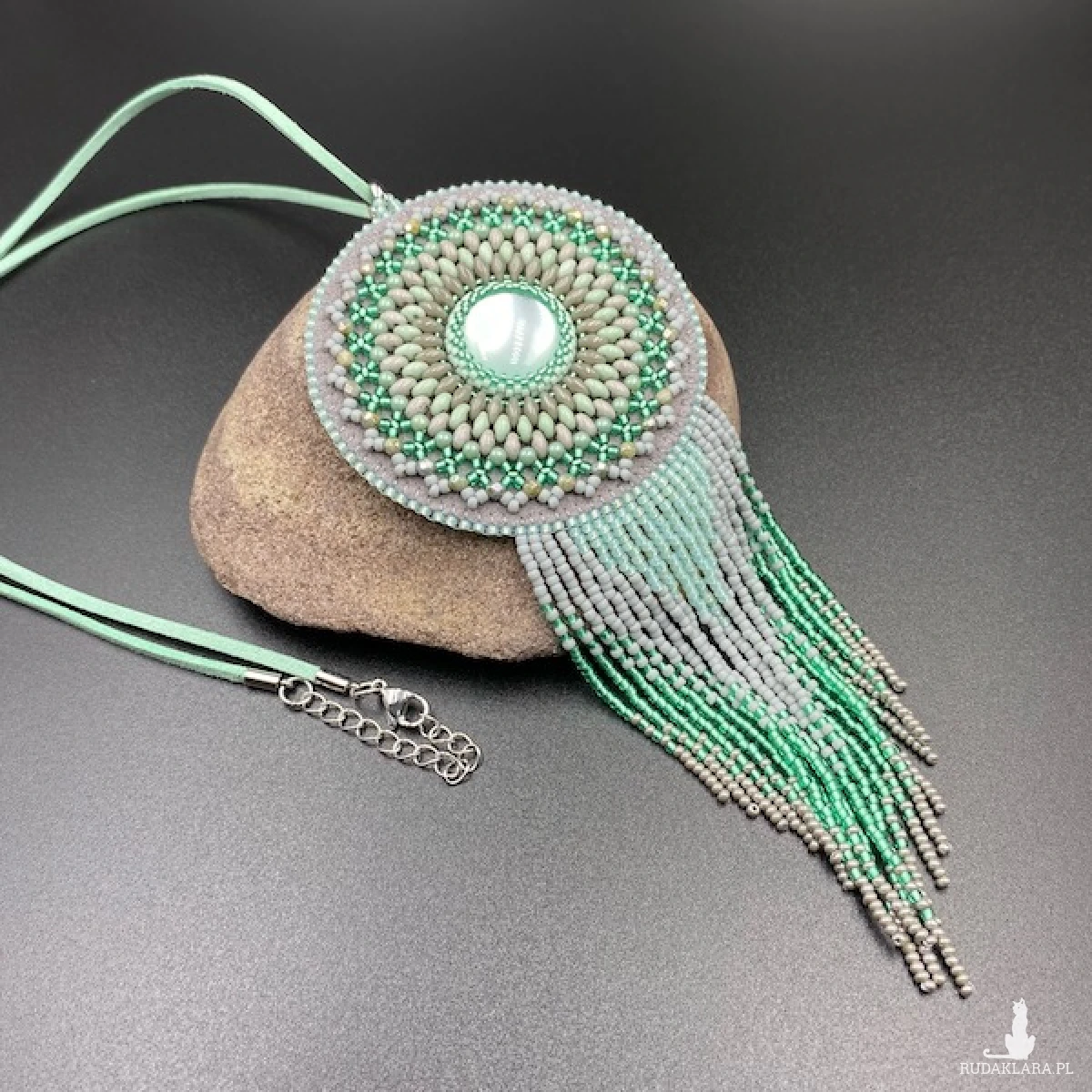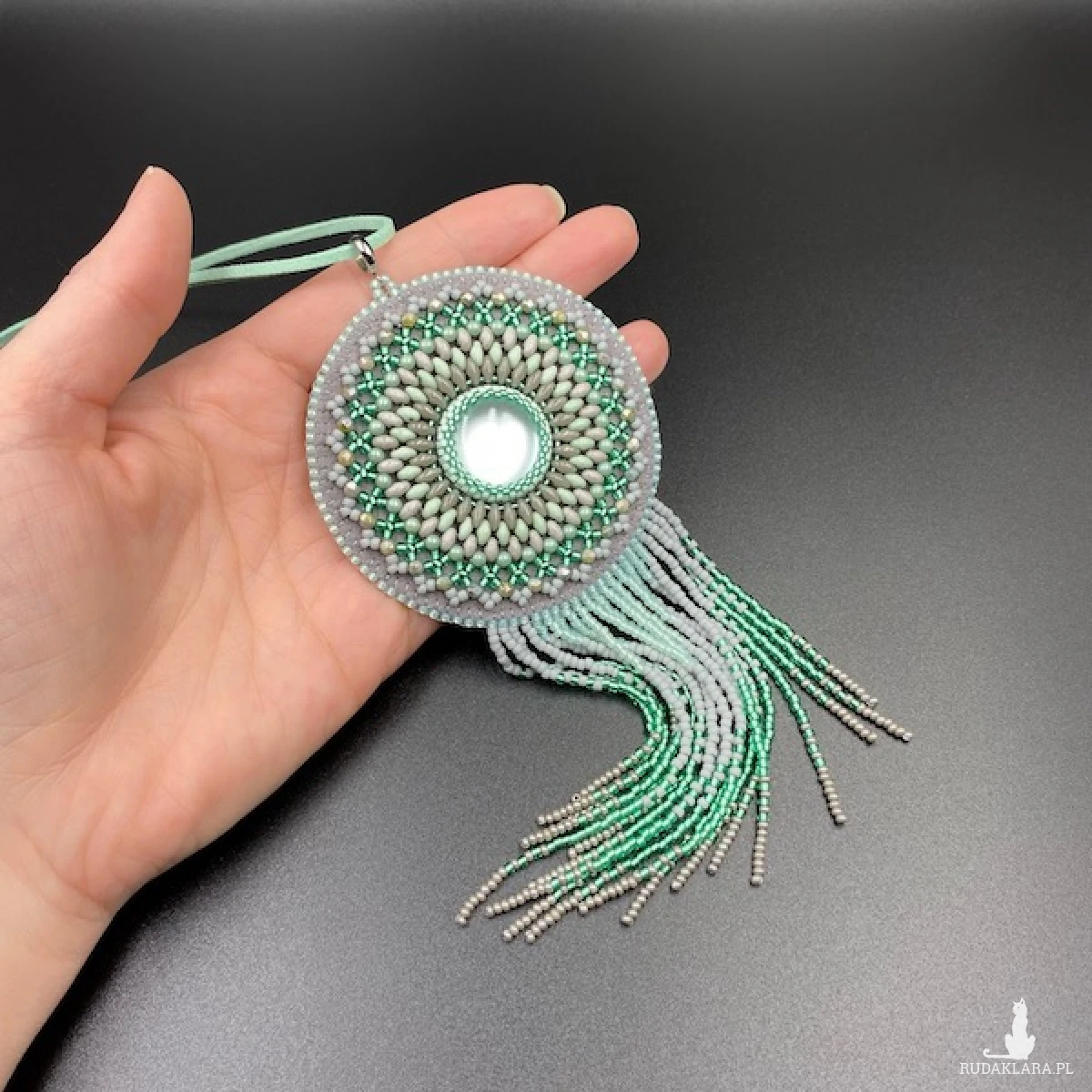 Kolory medalionu: odcienie szarości i mięty. Jego centrum to okrągły kaboszon akrylowy 20 mm, który opleciony został koralikami Toho, Fire Polish, SuperDuo i zakończony ozdobnymi frędzelkami z efektem cieniowania. Zawieszony został na rzemieniu zamszowym w kolorze jasnej mięty. Tył podszyty eko skórką. Elementy metalowe ze stali chirurgicznej w kolorze srebrnym.