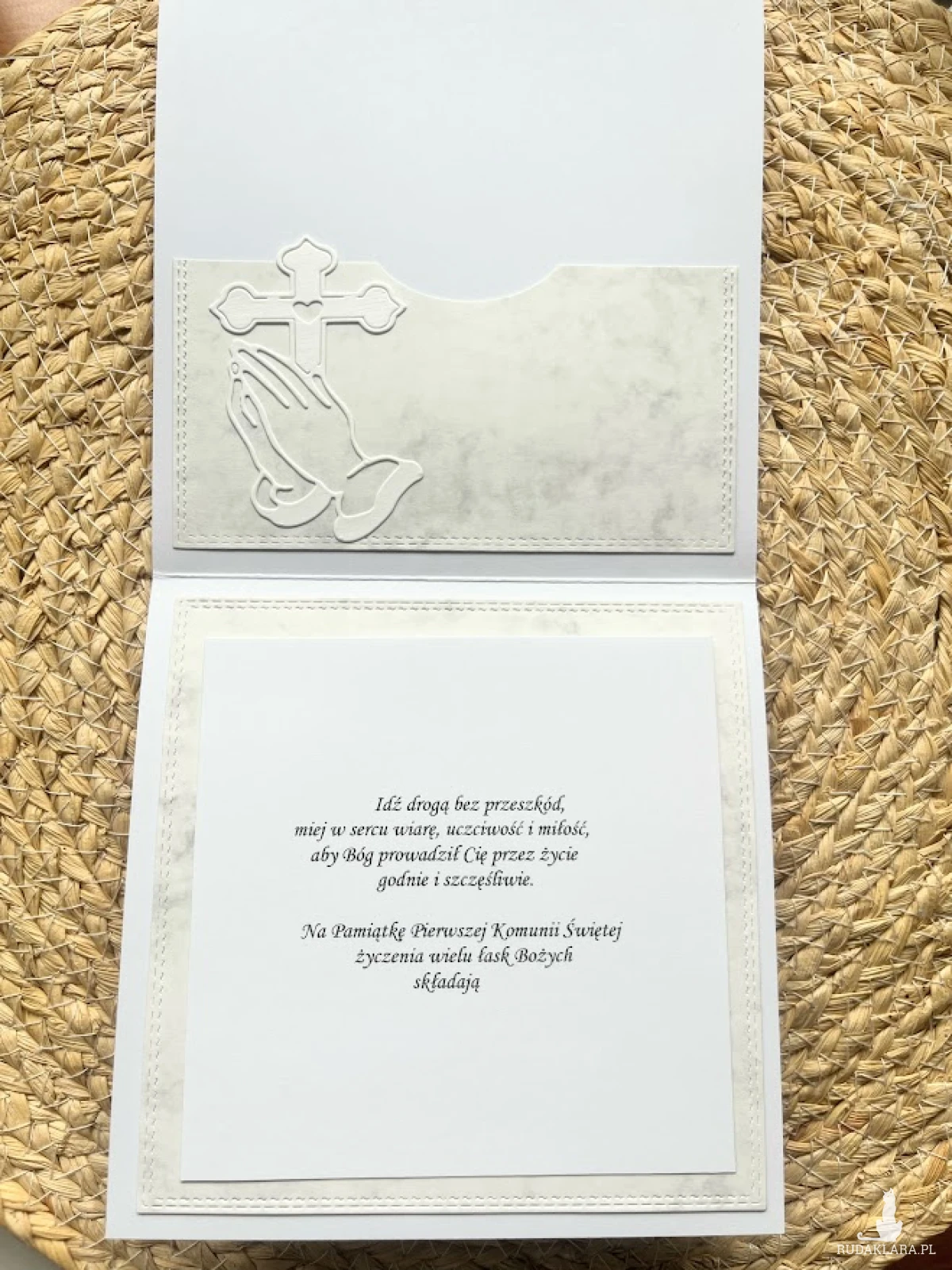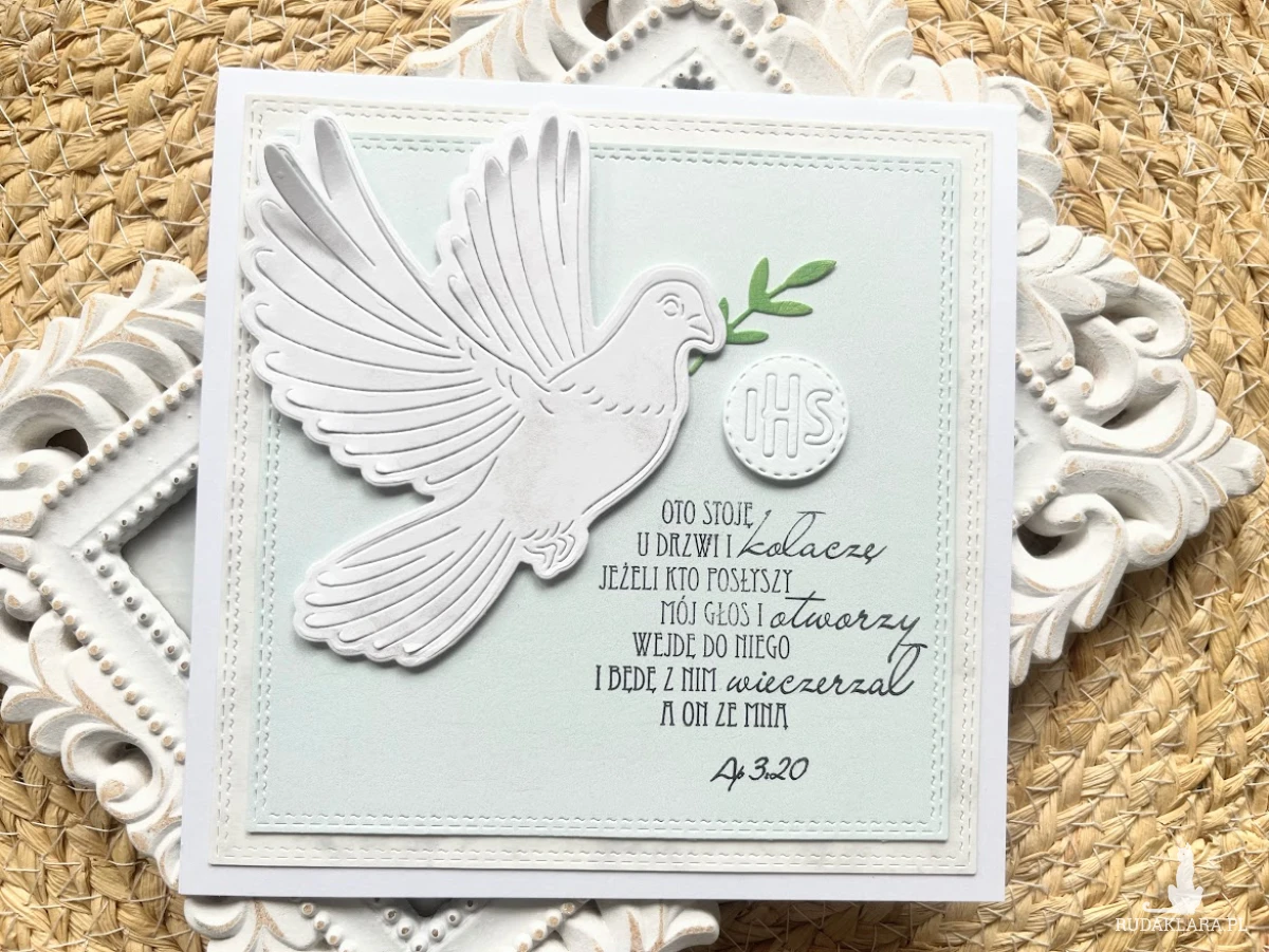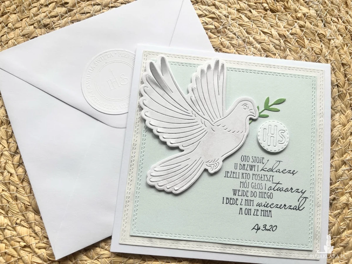 Elegancka, umiarkowanie zdobiona kartka z okazji Pierwszej Komunii Świętej. Utrzymana w błękitno-białej kolorystyce. Ozdobiona przepięknym gołębiem. Kartka jest w całości wykonana ręcznie z najlepszej jakości materiałów do scrapbookingu. Wielkość kartki 14,5 x 14,5. wewnątrz kartki umieszczono gotowe życzenia do własnoręcznego podpisu oraz kieszonka na małe co nieco, Do kartki dołączono białą kopertę o wymiarach 15,5x15,5 ozdobioną symbolem IHS