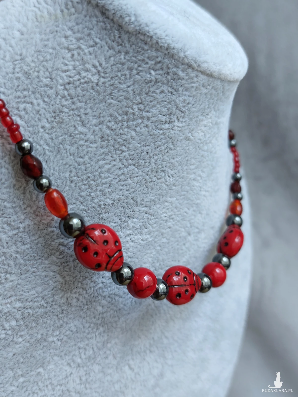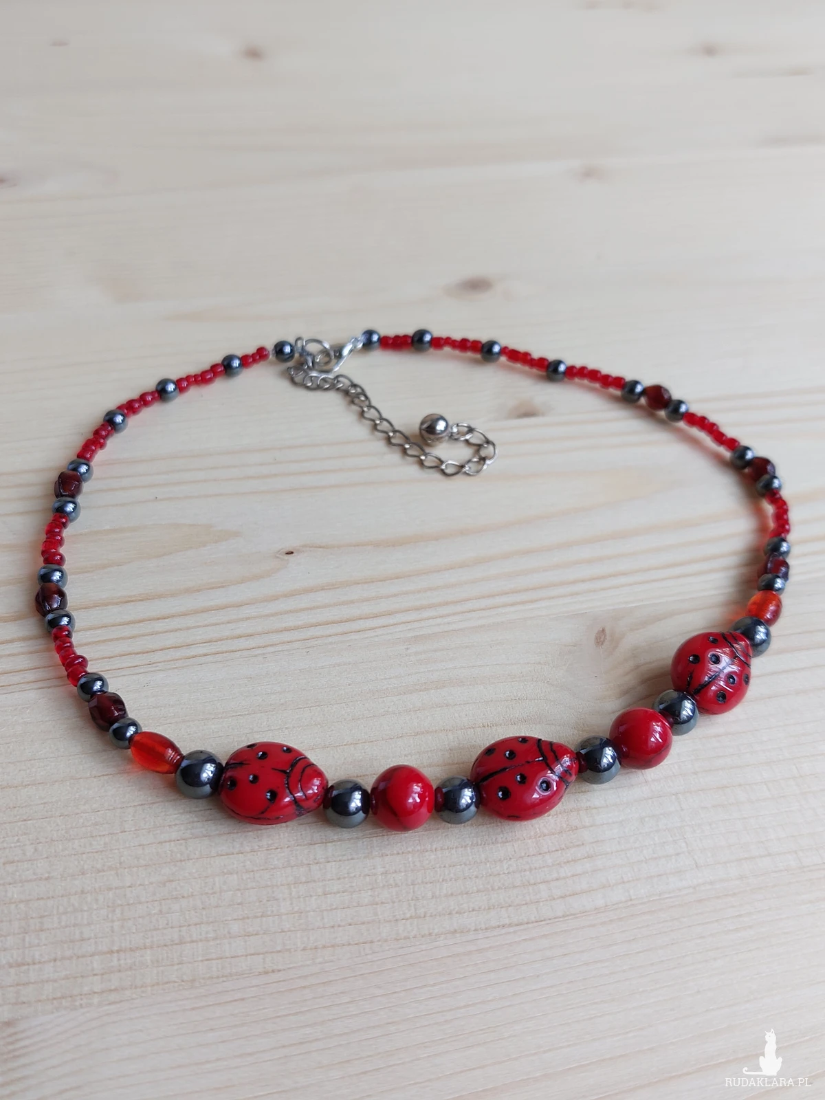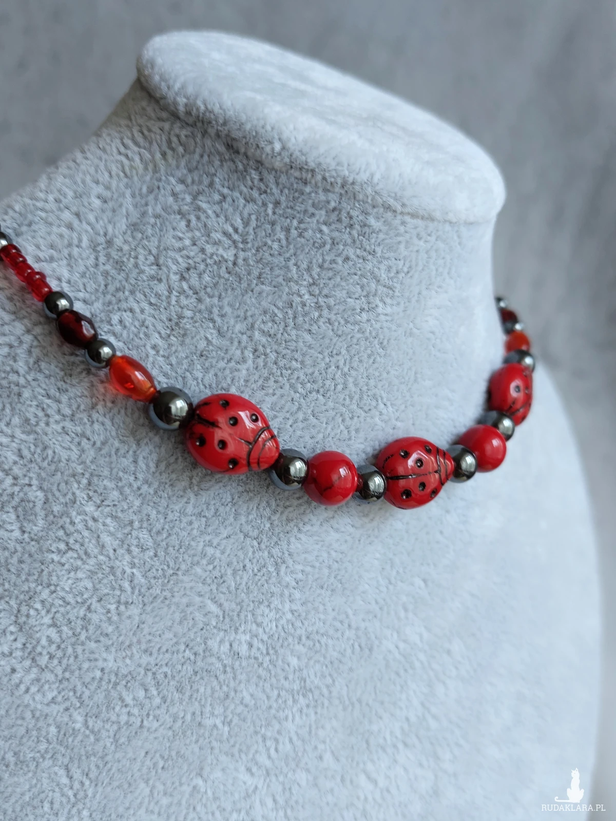 Krótki naszyjnik, choker wykonany ze szklanych koralików w kształcie biedronek, grafitowych hematytów i drobnych czerwonych koralików. Długość regulowana od 33 do 41 cm.
