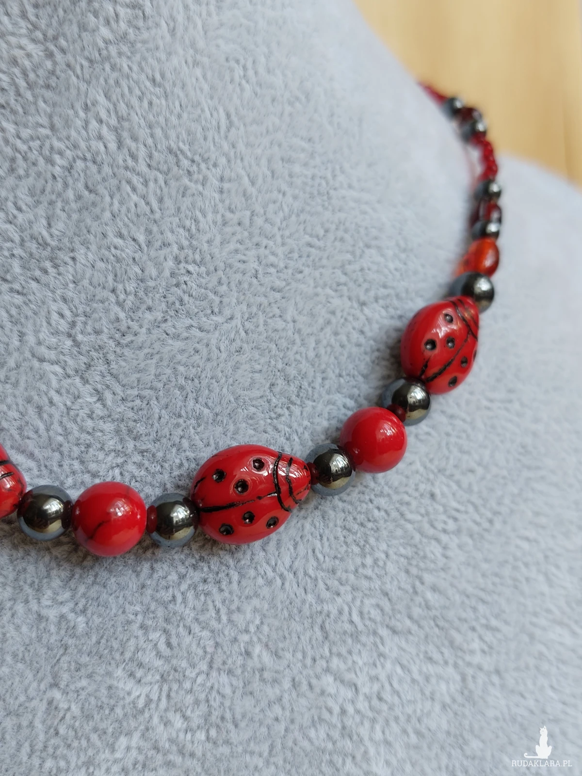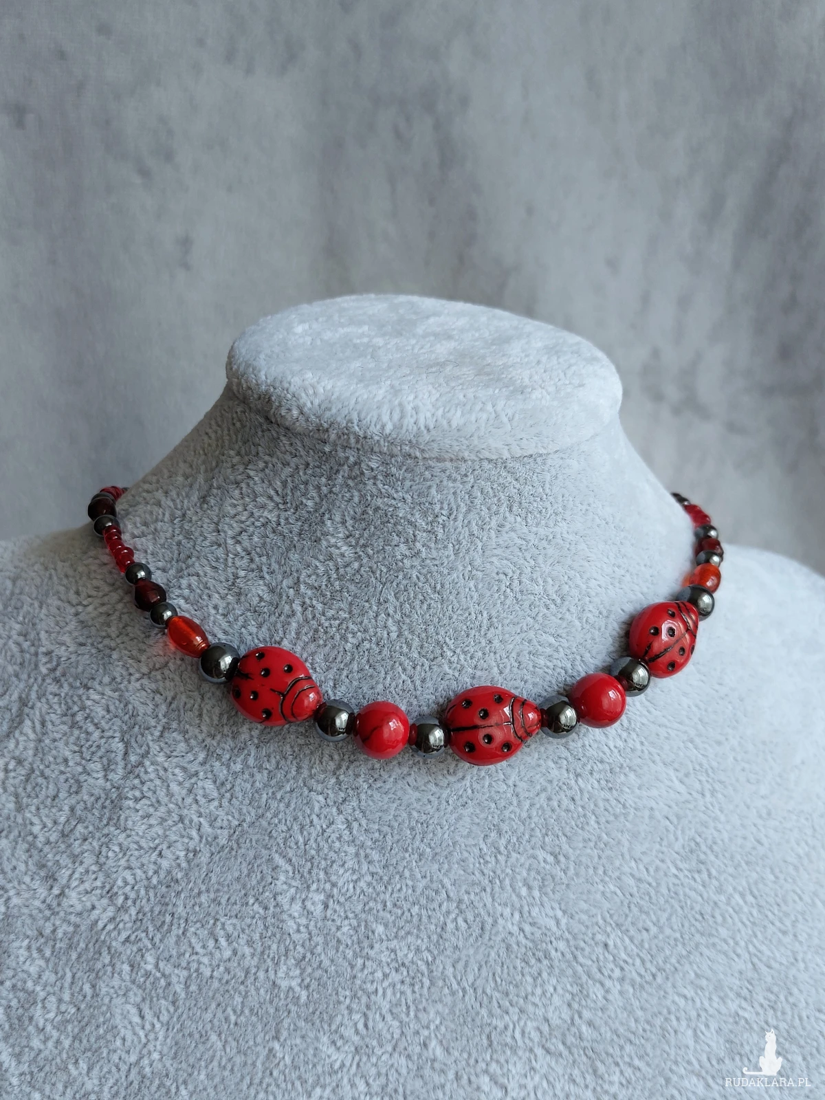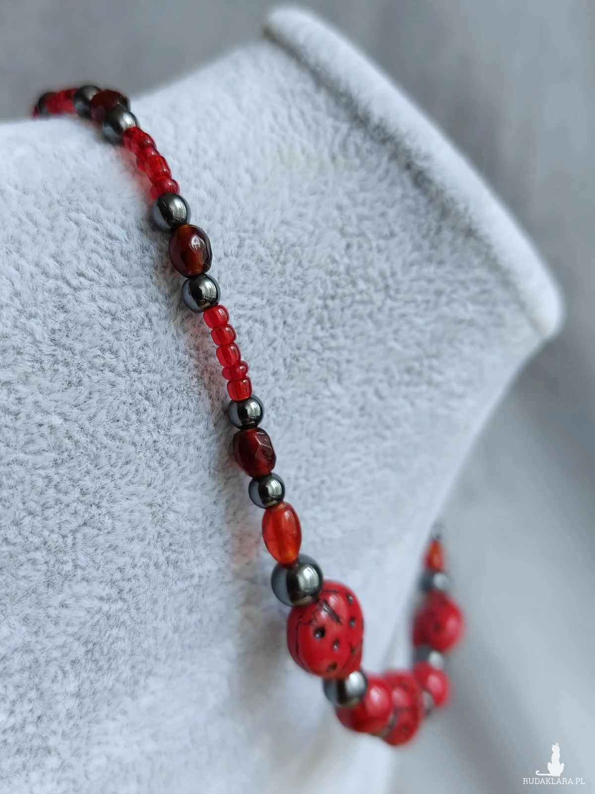 Krótki naszyjnik, choker wykonany ze szklanych koralików w kształcie biedronek, grafitowych hematytów i drobnych czerwonych koralików. Długość regulowana od 33 do 41 cm.