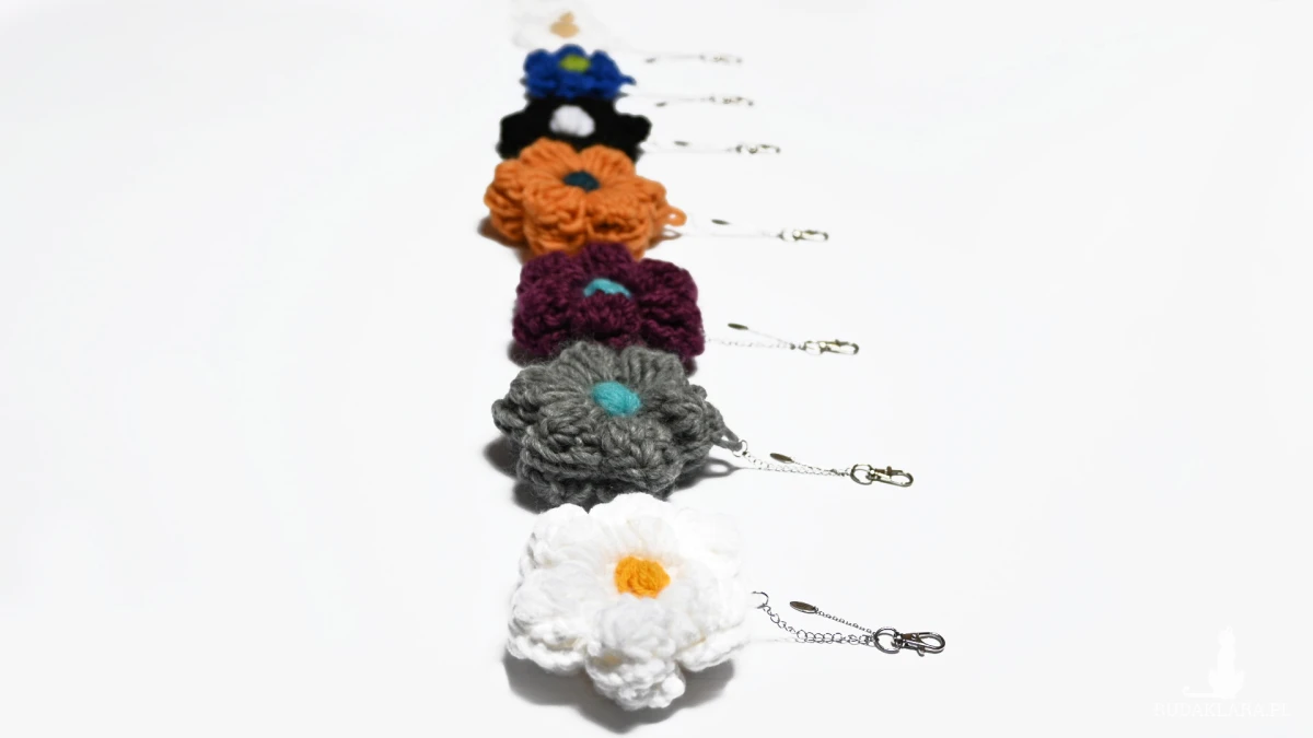 Ręcznie szydełkowany duży brelok w kształcie kwiatka z wełny. Designerski, modny dodatek, który świetnie sprawdzi się przypięty do torebki, kluczy czy jako subtelne dopełnienie codziennej stylizacji. Breloczek wykończony został autorskim charms’em z logo marki – subtelny detal, który podkreśla jego unikalny charakter i nadaje całości elegancji.