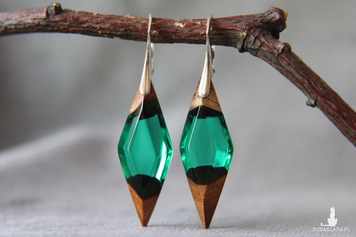Kolczyki romby z korzeniem jabłoni łączonym zieloną, transparentną żywicą.