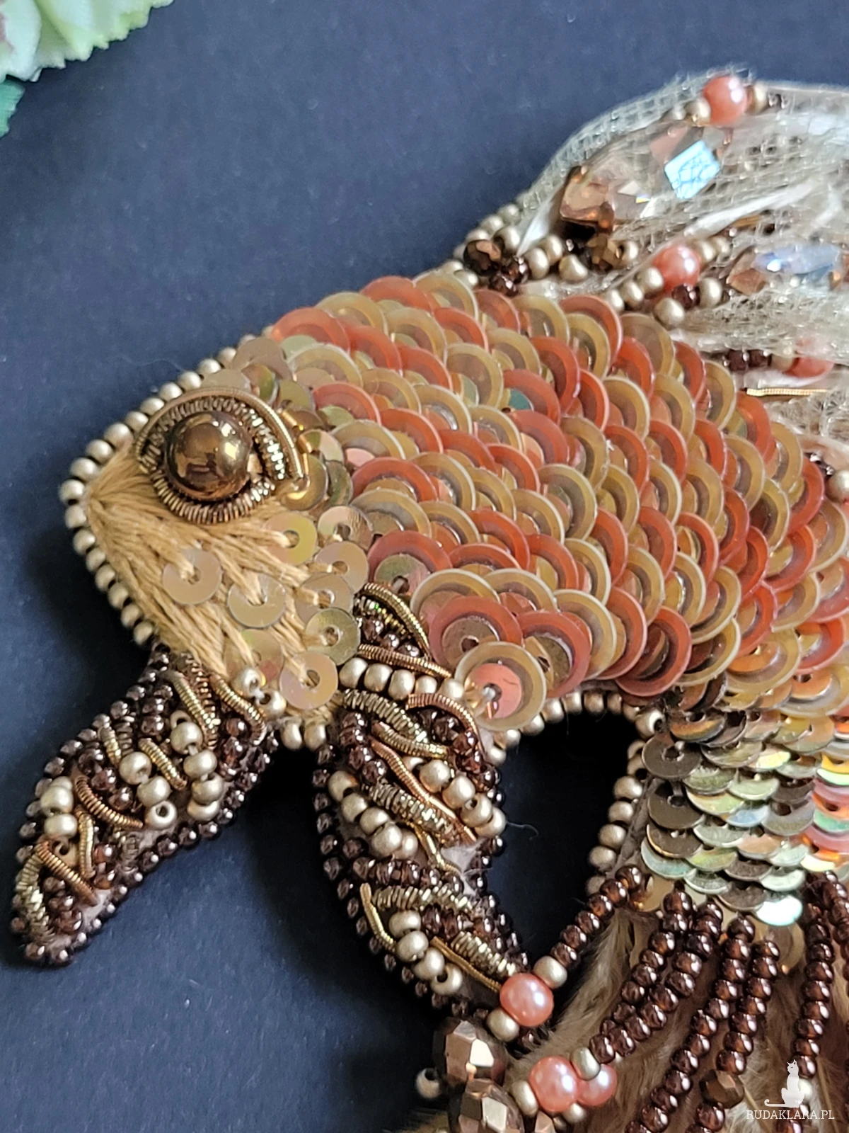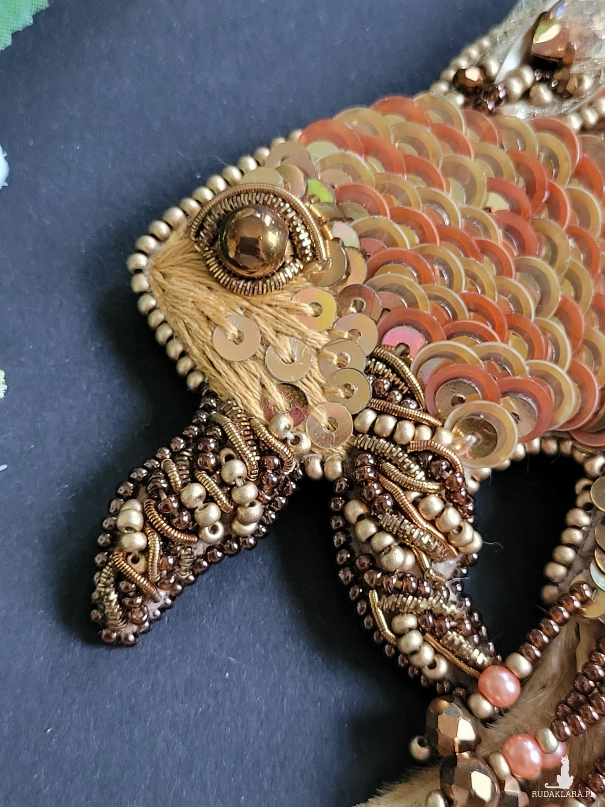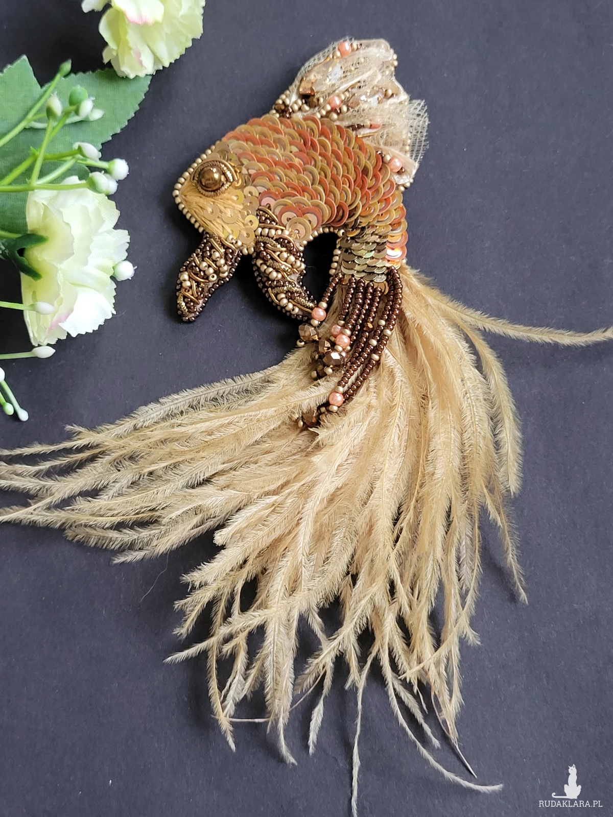 Unikatowa, ręcznie haftowana broszka w kształcie niezwykłej ryby. Połączenie lśniących cekinów, koralików, kryształków i piór sprawia, że ten dodatek jest prawdziwym dziełem sztuki!