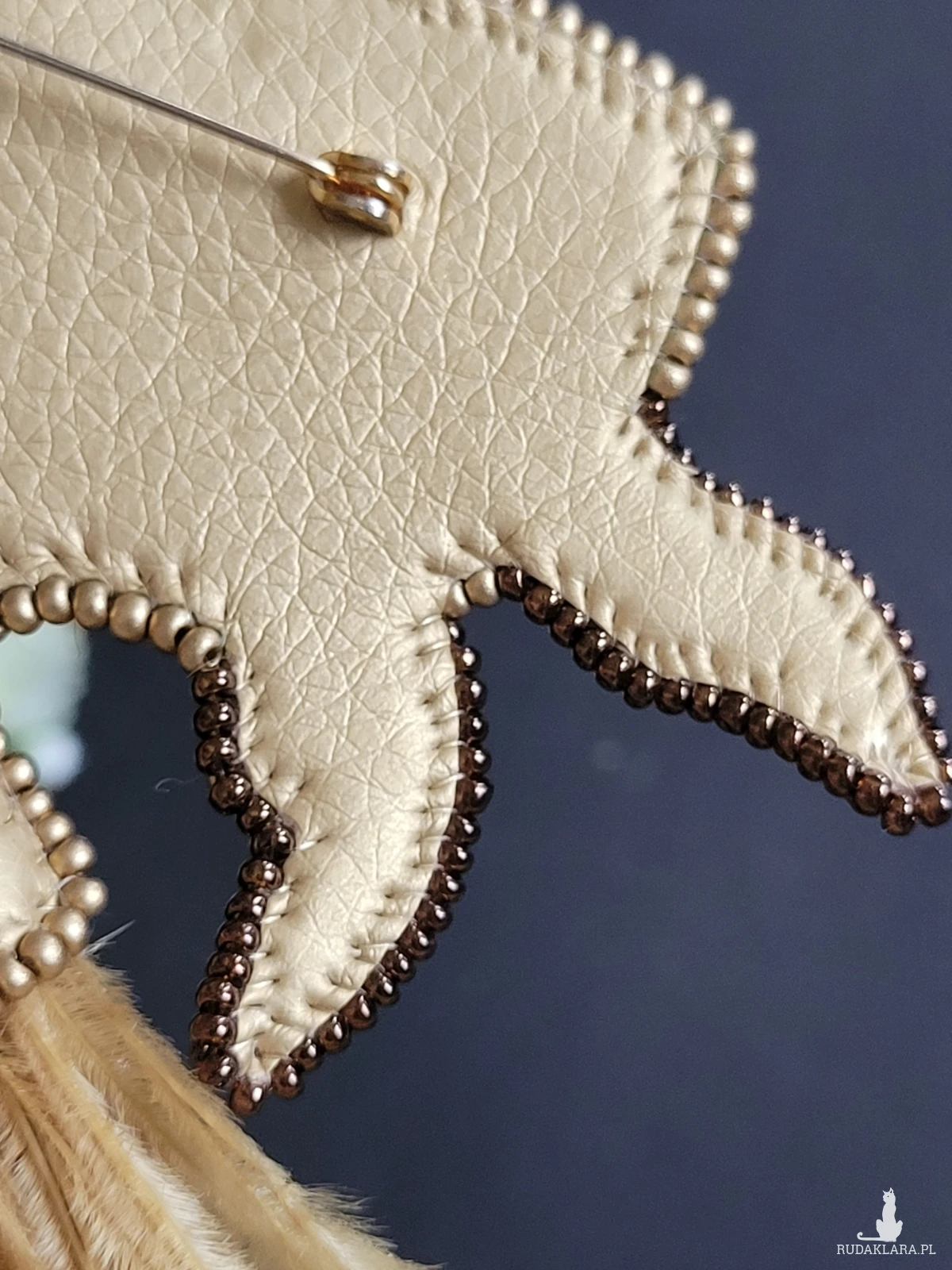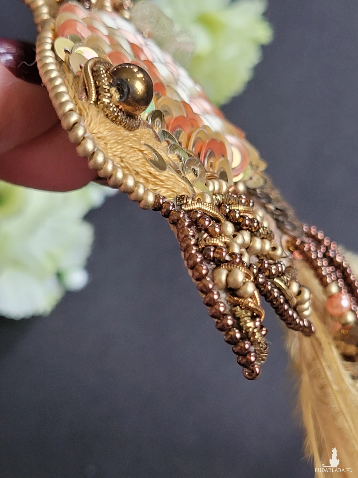 💛 Odcienie ecru, złota i brązu nadają broszce elegancji i magicznego uroku. Pióra subtelnie poruszają się przy każdym ruchu i nadają lekkości.