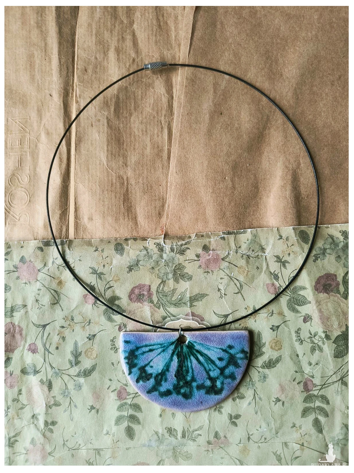 Naszyjnik w kolorze lawendowym wykonany z gliny szamotowej, wypalony na biskwit, a następnie szkliwiony w temperaturze 1260 stopni C. Wymiary wisiora: ok. 4,5 cm x 7 cm. Na drucianej kolii. W ciekawym zestawieniu kolorystycznym. Serdecznie polecam wszystkim Paniom poszukującym nietuzinkowej biżuterii!