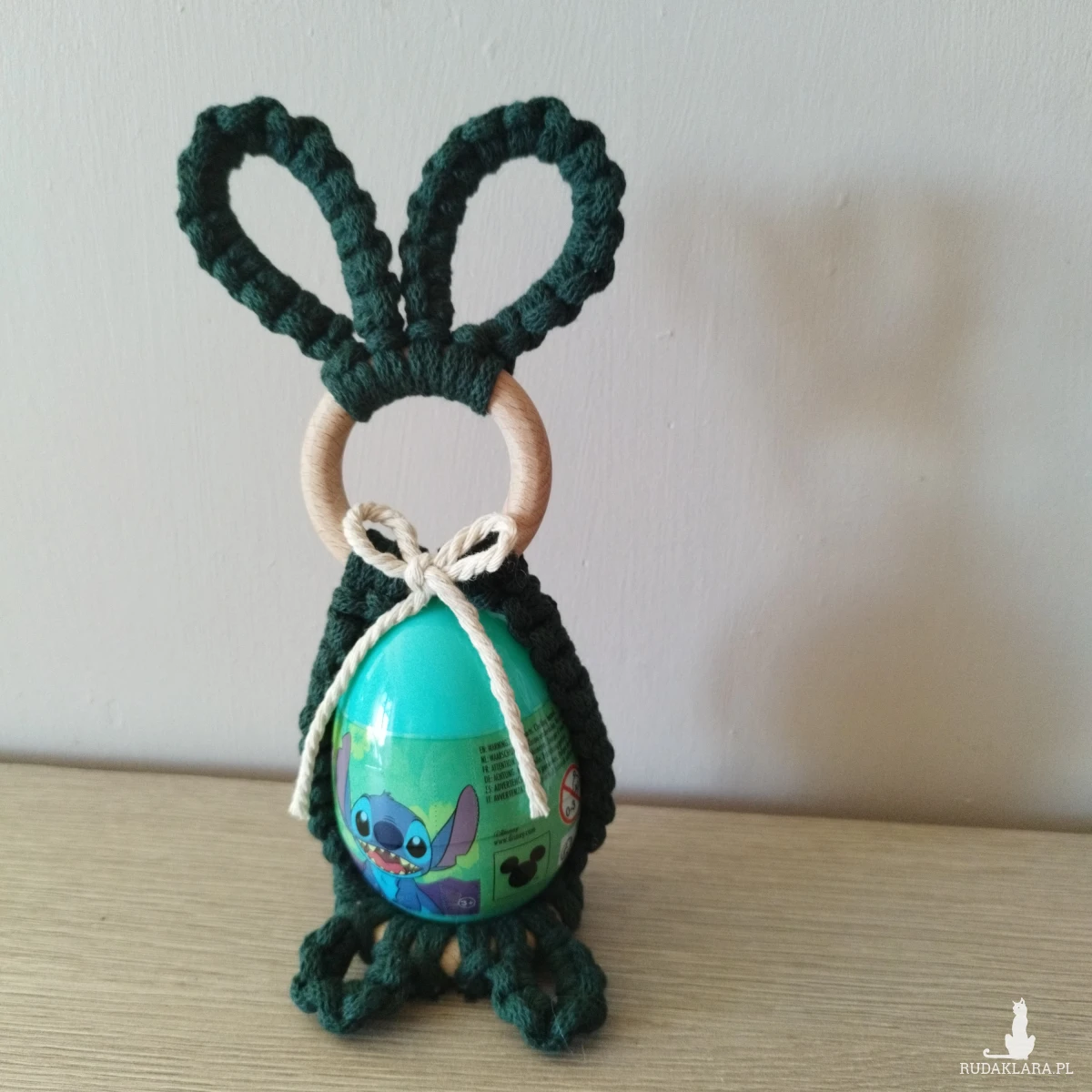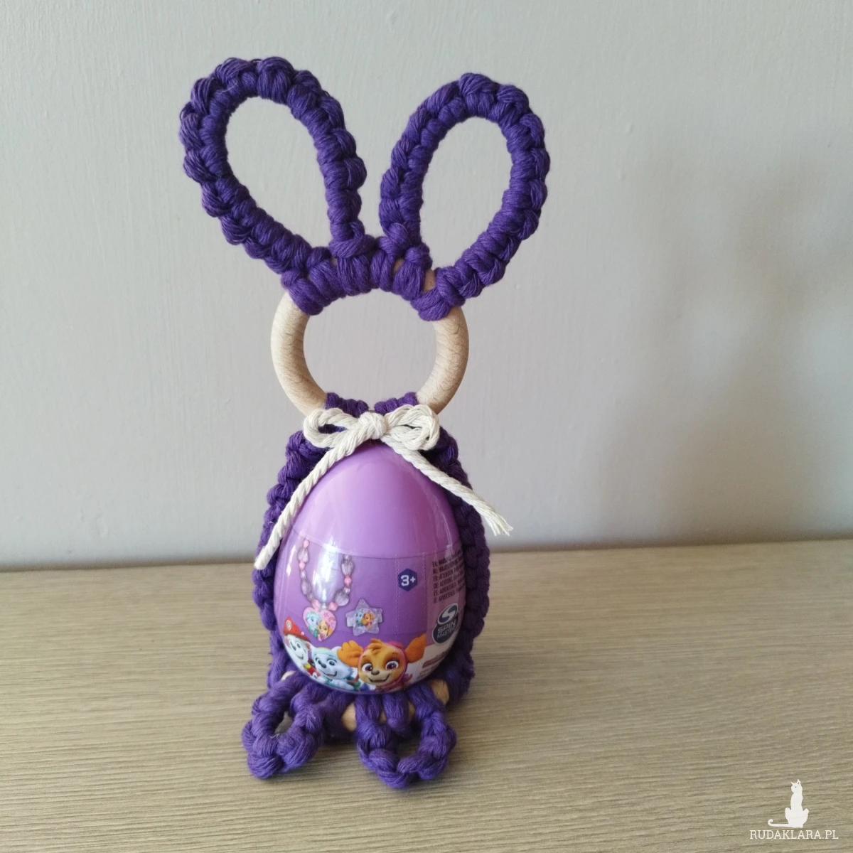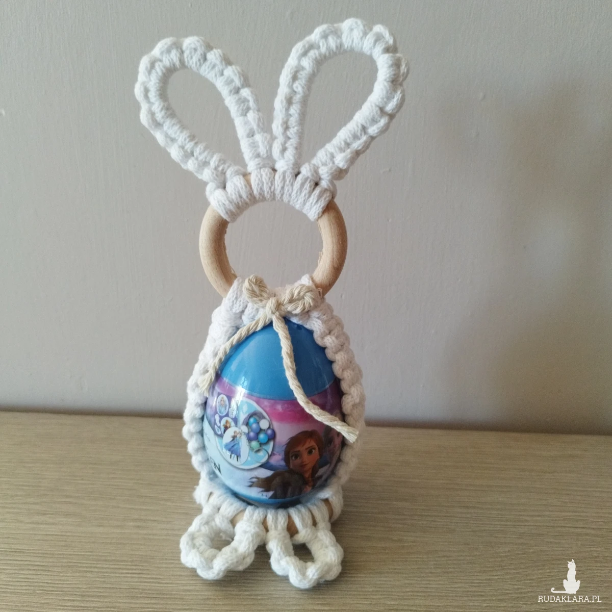 Zajączek makrama z jajkiem niespodzianką. Może być ozdobą na wielkanocnym stole z pisanką w środku.