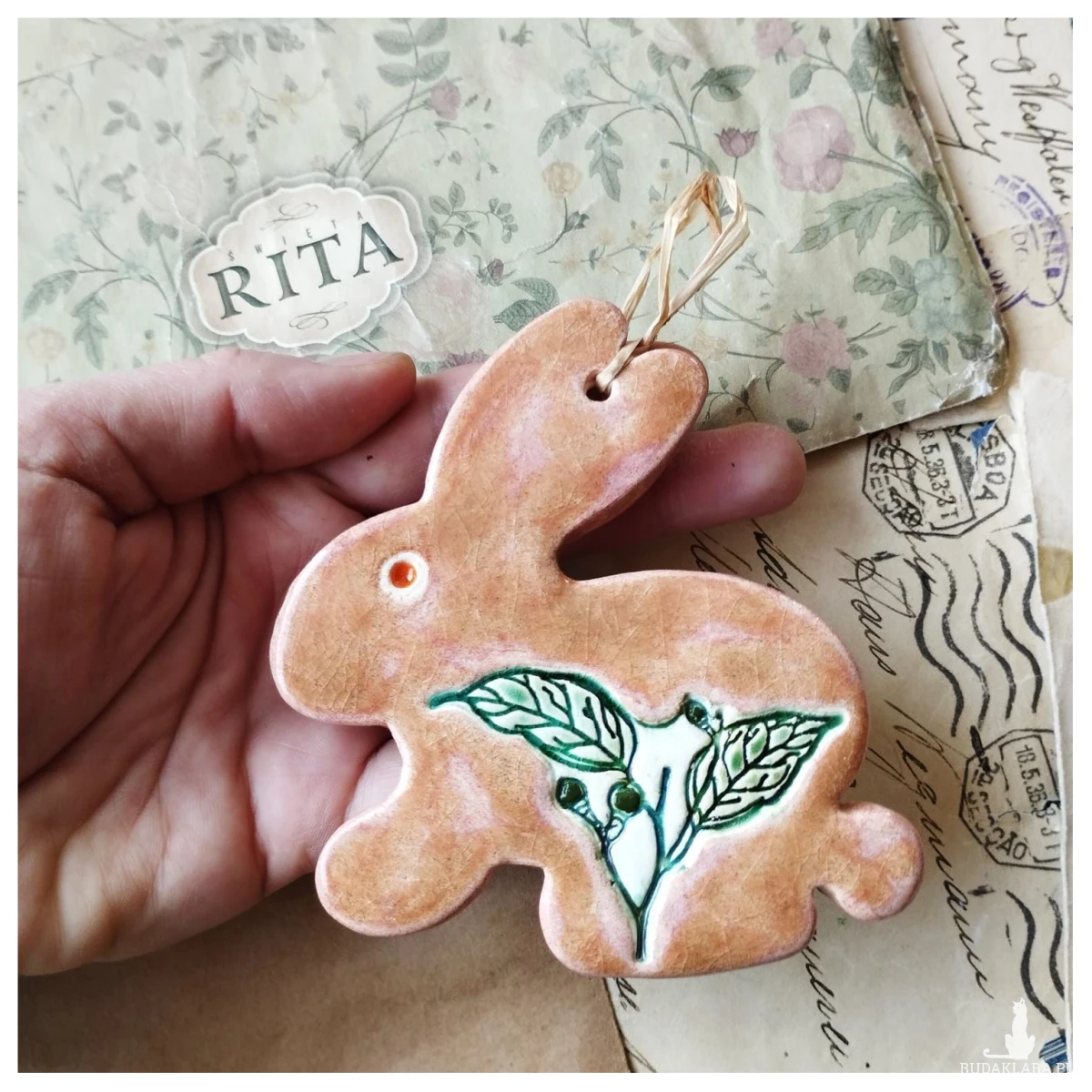 Zajączek, wykonany gliny szamotowej, wypalony na biskwit, a następnie szkliwiony w temp. 1260 st. Wymiary ok 9cm x 9,5 cm. Idealne do ozdoby domu na Wielkanoc lub jako upominek. Serdecznie polecam.