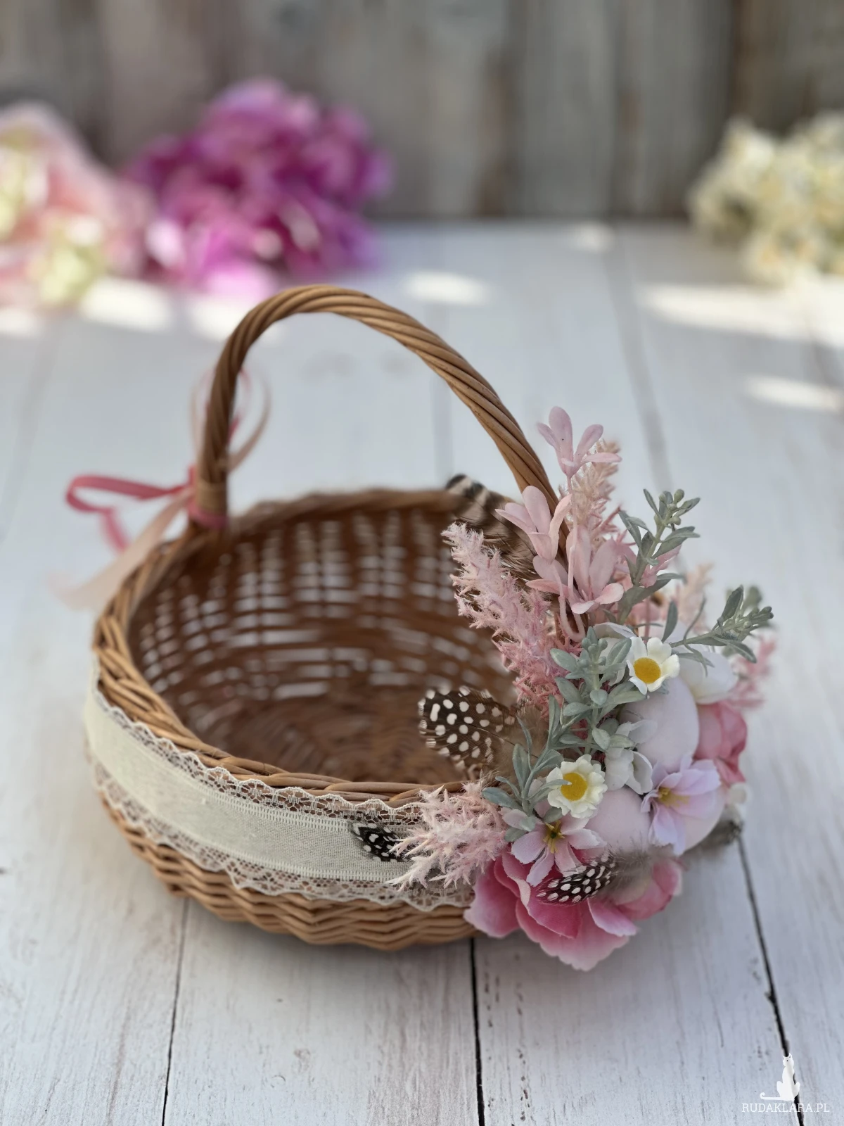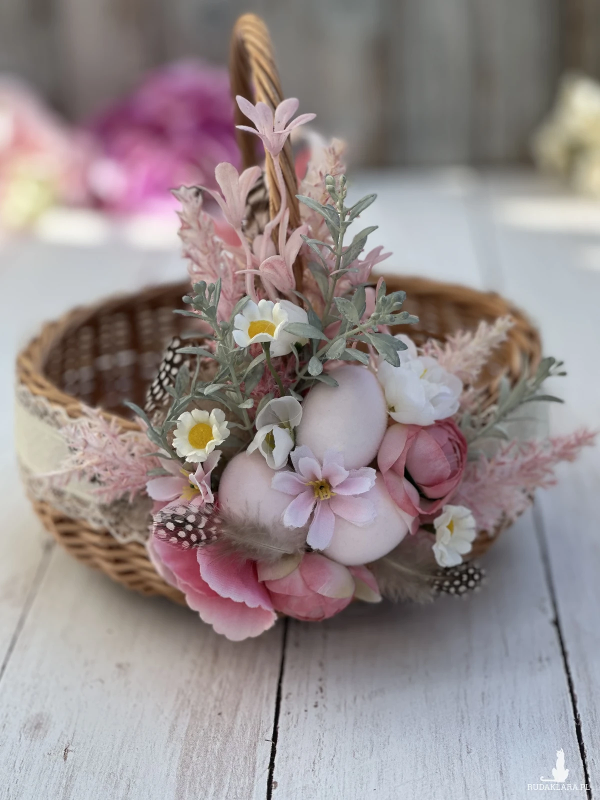 Koszyczek wielkanocny z naturalnej wikliny, ozdobiony kwiatami i dodatkami sztucznymi. Dekoracja na stałe przymocowana do koszyczka, przygotowana przeze mnie ręcznie :)