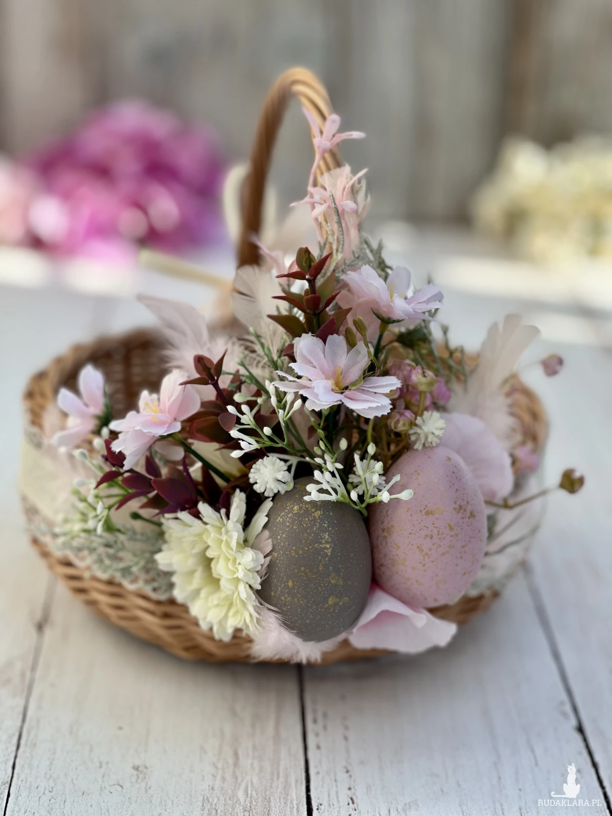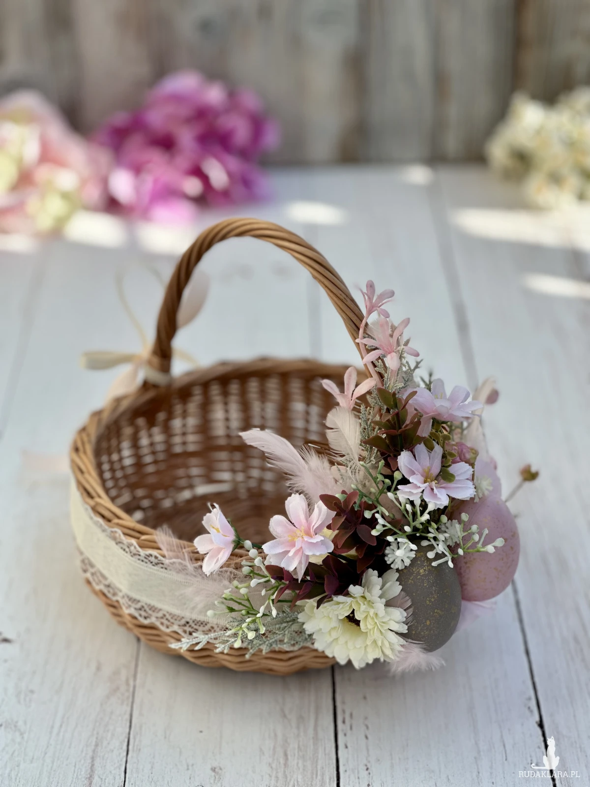 Koszyk na Wielkanoc, wiklinowy koszyczek z dekoracją