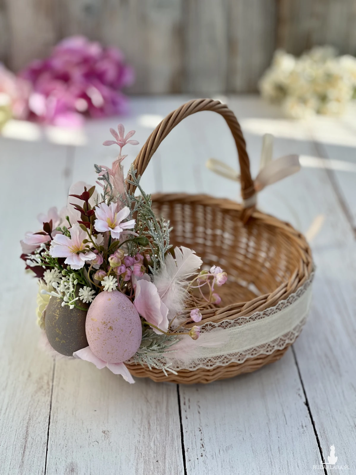 Koszyczek wielkanocny z naturalnej wikliny, ozdobiony kwiatami i dodatkami sztucznymi. Dekoracja na stałe przymocowana do koszyczka, przygotowana przeze mnie ręcznie :)
