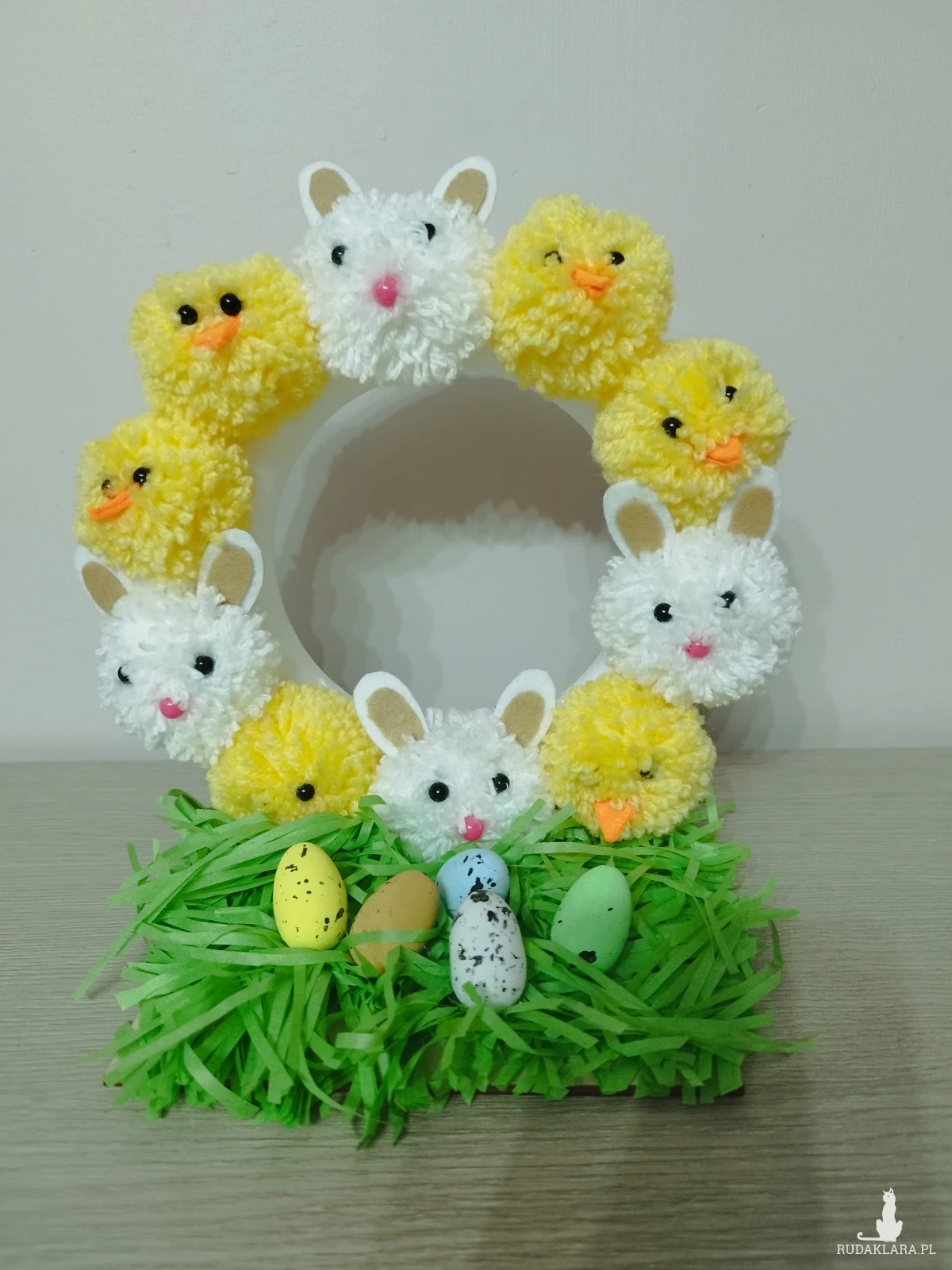 Stroik wielkanocny zrobiony z pomponów z włóczki na drewnianej podstawie. Wysokość 20cm
