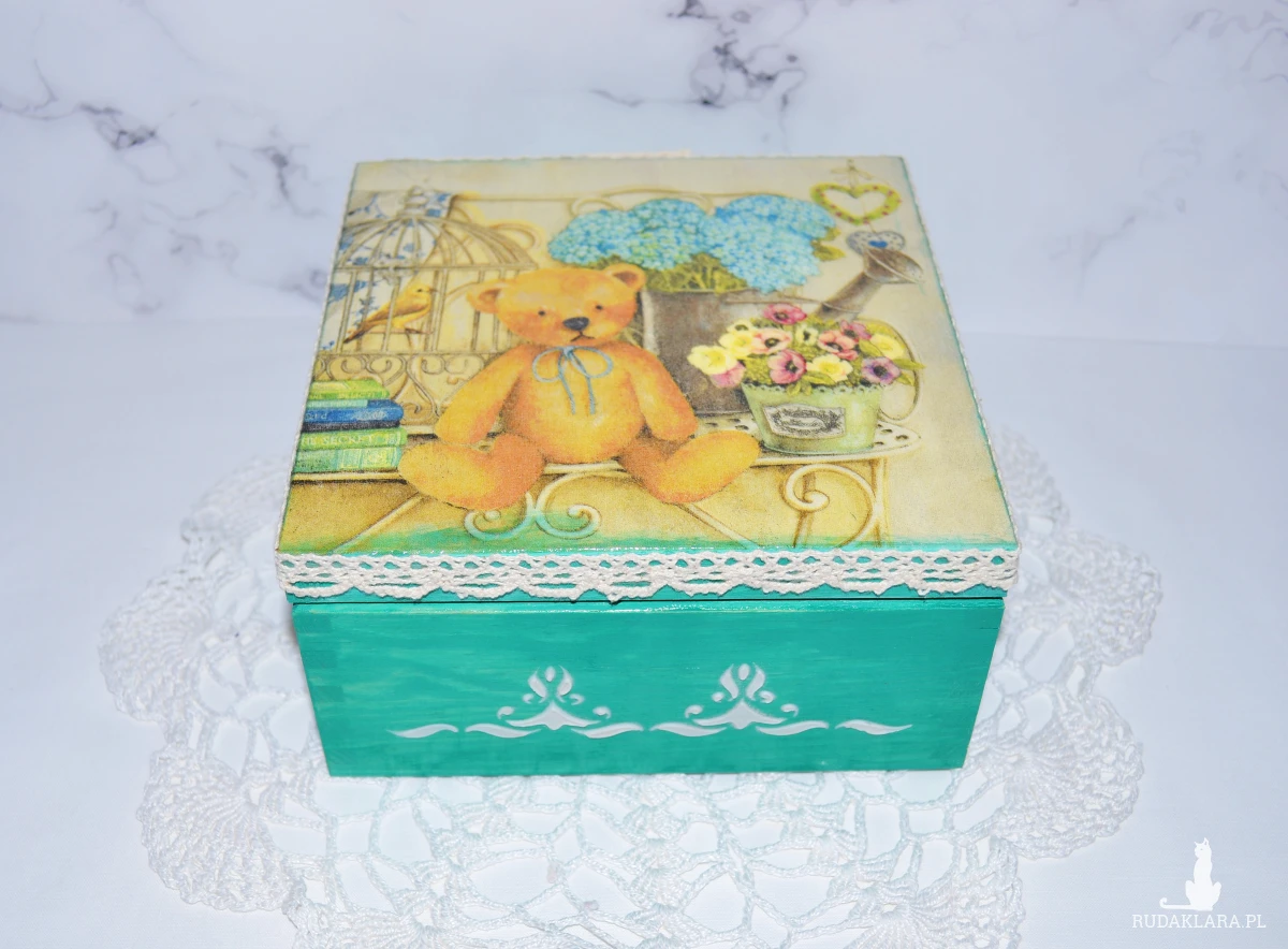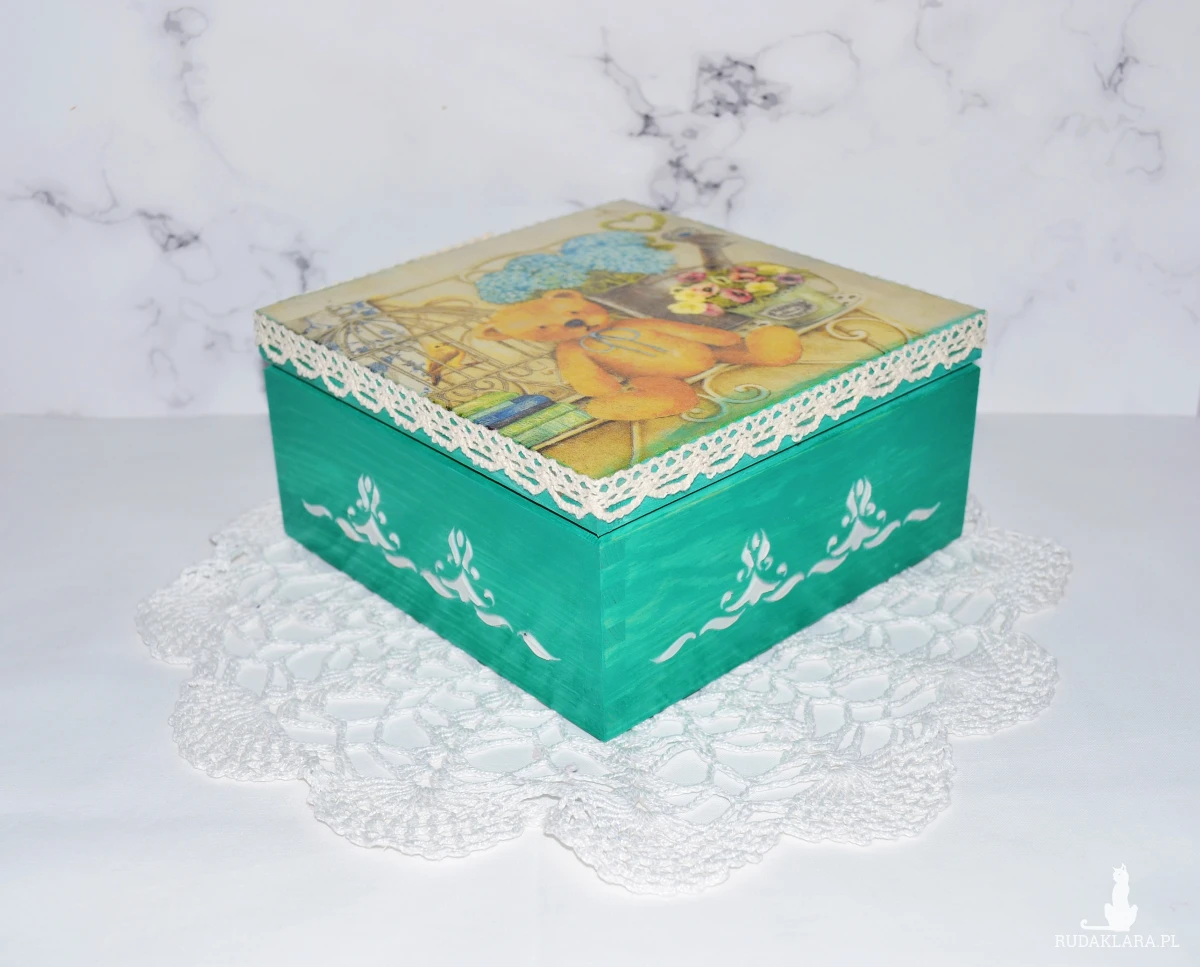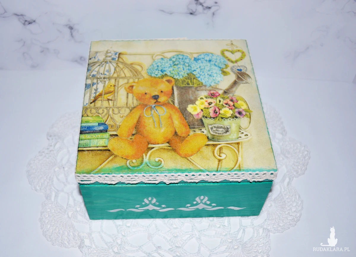 Drewniane pudełko z 4 przegródkami, które można wyjmować. Zdobione ręcznie techniką decoupage – metoda serwetkowa
