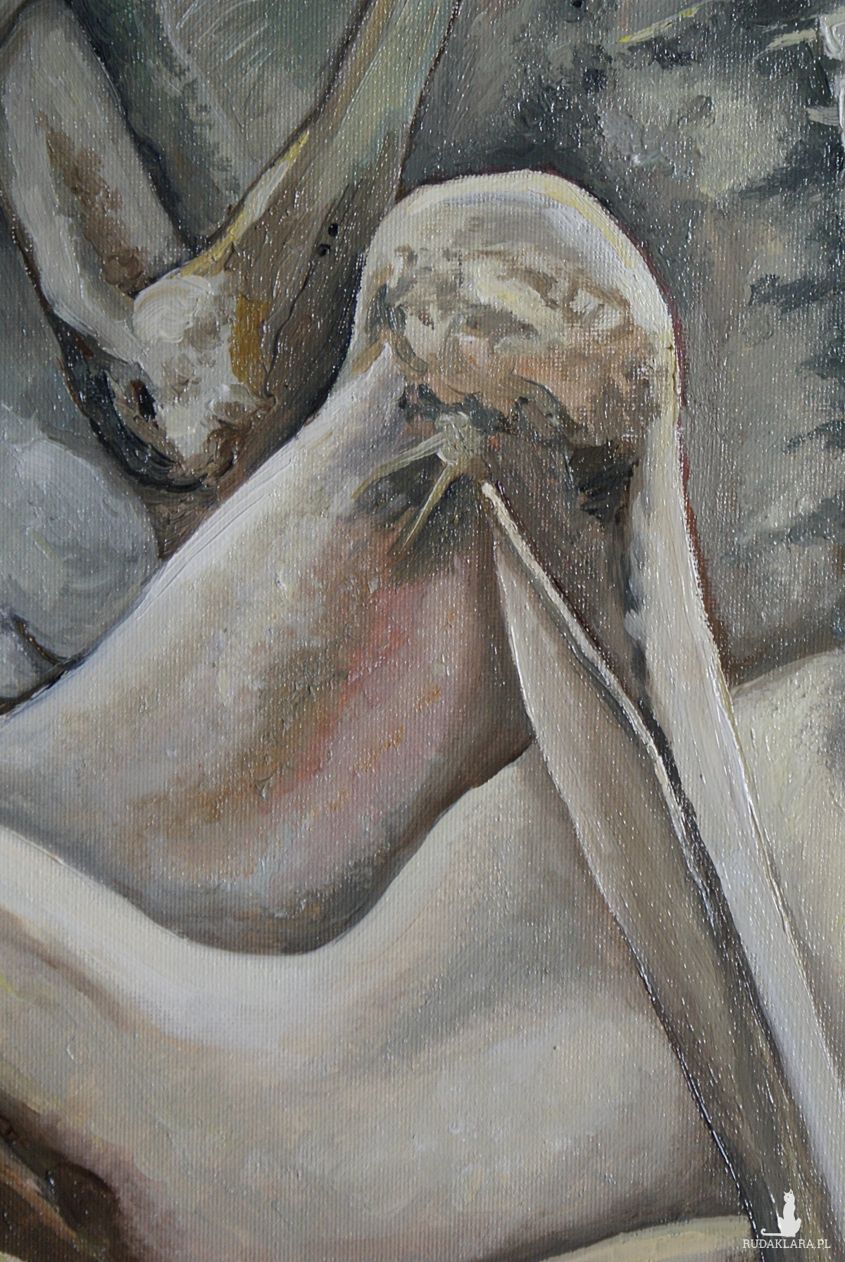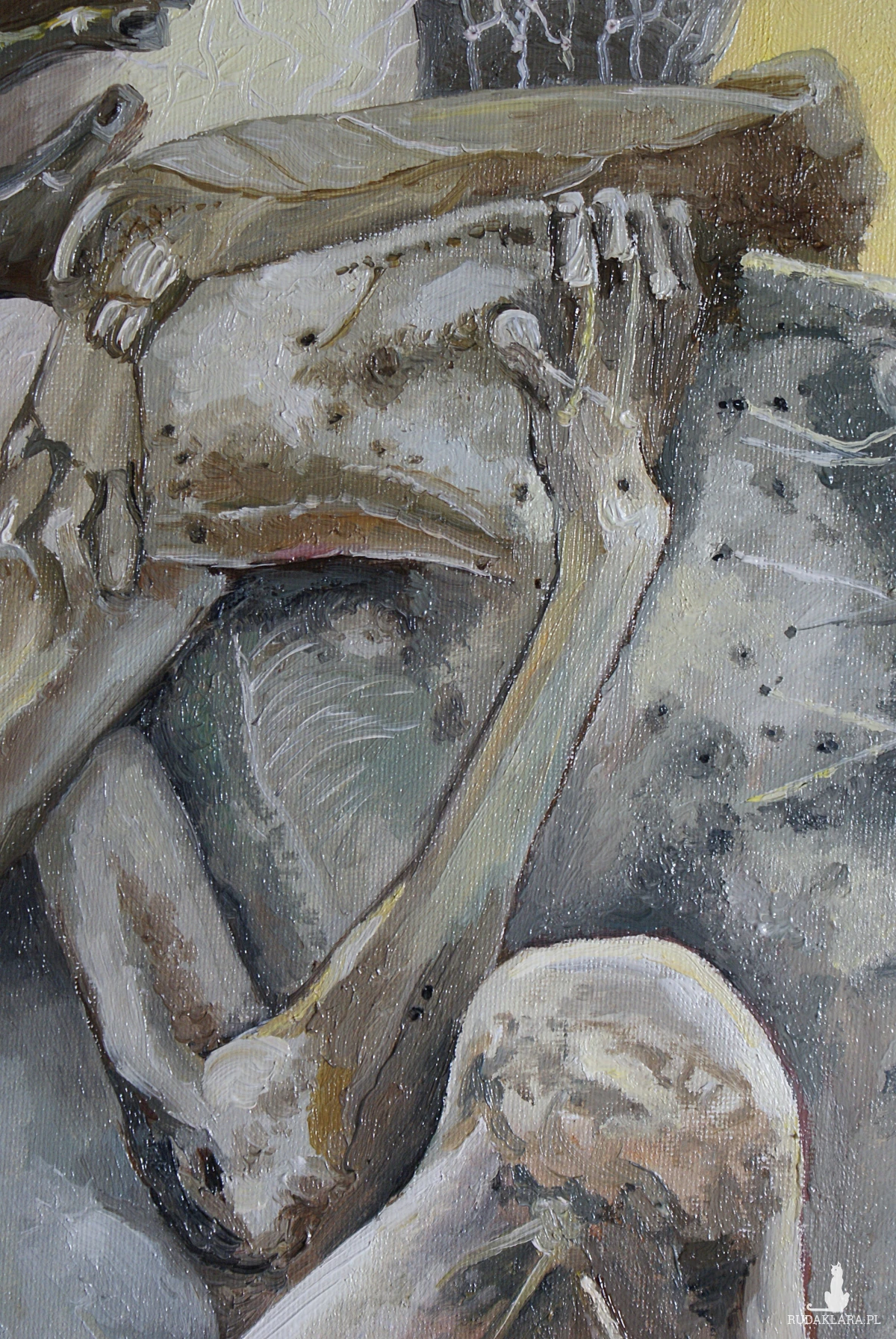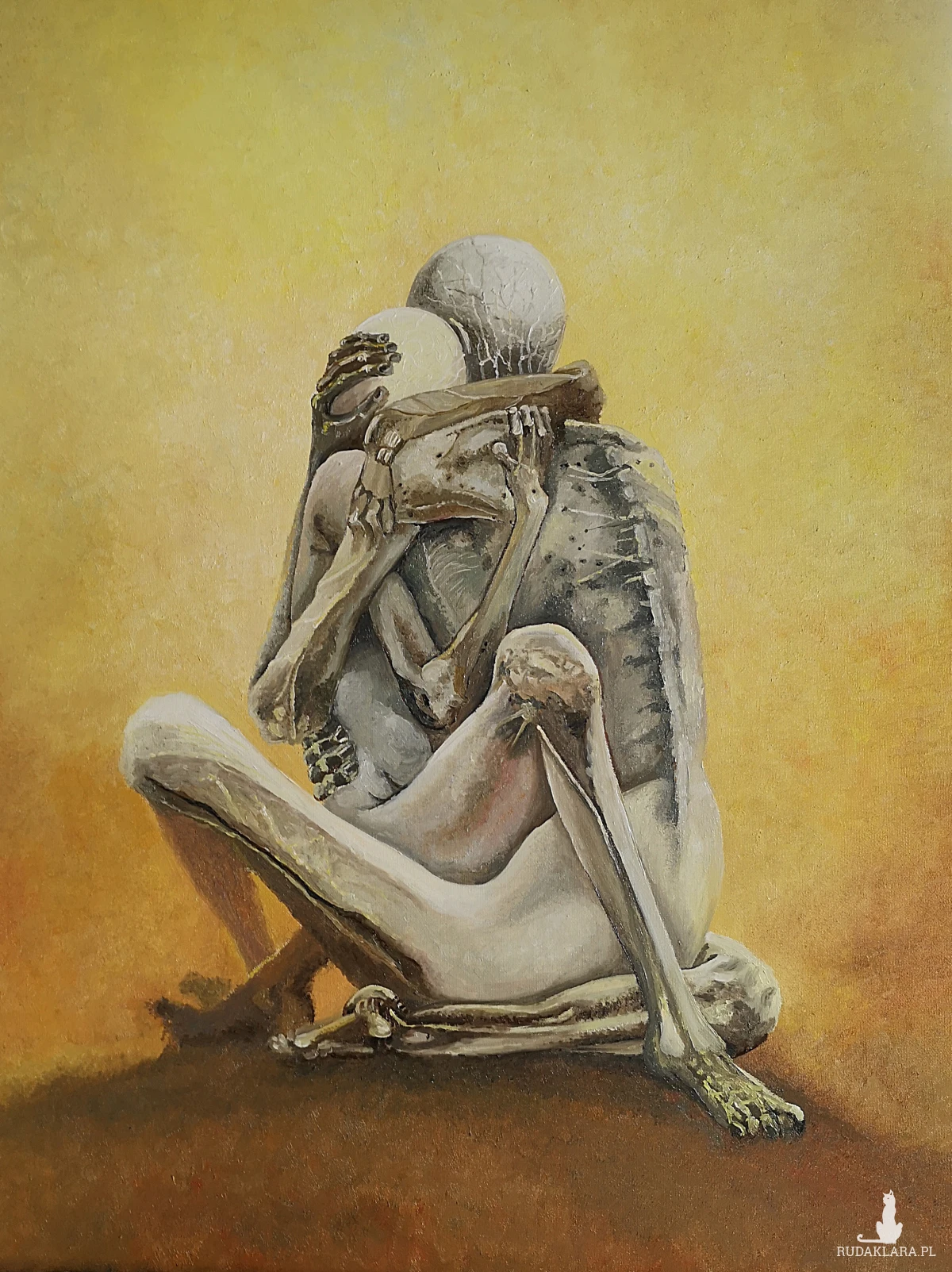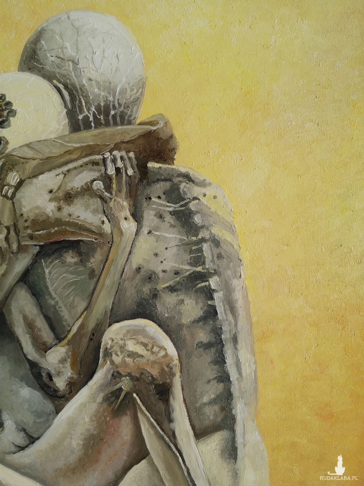 Atmosfera obrazu jest melancholijna, ale też pełna nadziei. Te figury, pomimo swojego odrealnionego wyglądu, mają w sobie coś niezwykle ludzkiego. Artysta wykorzystał delikatne pociągnięcia pędzla. Akcentuje cieniem i światłem, aby stworzyć iluzję ruchu i życia. Patrząc na ten obraz, można poczuć gamę emocji — od smutku po ciepłe przebłyski miłości i pokory. To dzieło zmusza do zastanowienia się nad naturą istnienia, kruchością życia oraz potęgą więzi międzyludzkich. Ja nie widzę tu śmierci, dostrzegam natomiast trwałość uczucia, wizja końca świata nie wydaje się tak tragiczna gdy jesteśmy z kimś kto nas rozumie