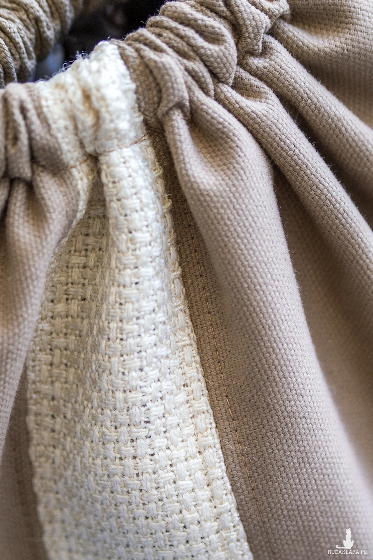 Plecak worek wykonany z plecionej tkaniny w kolorze jasnobrązowym.