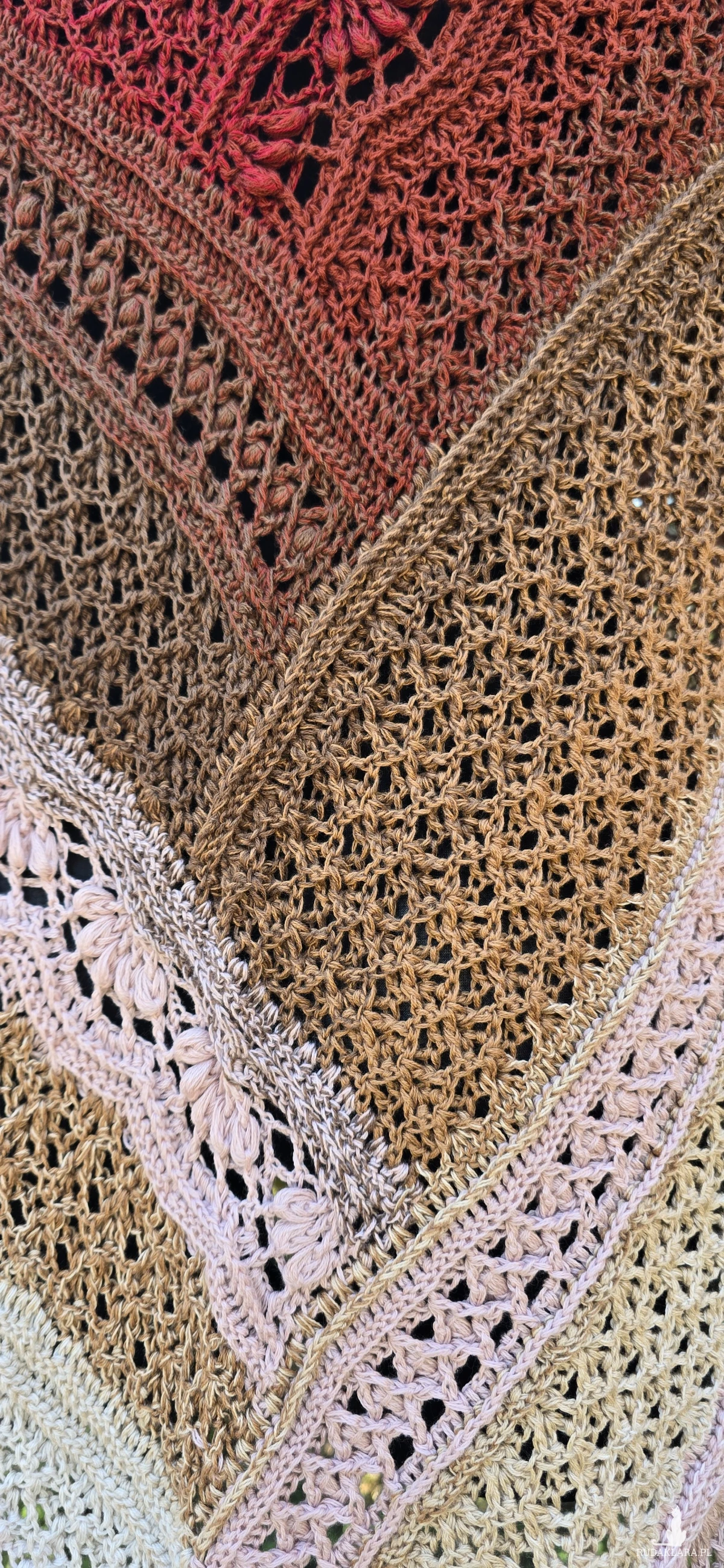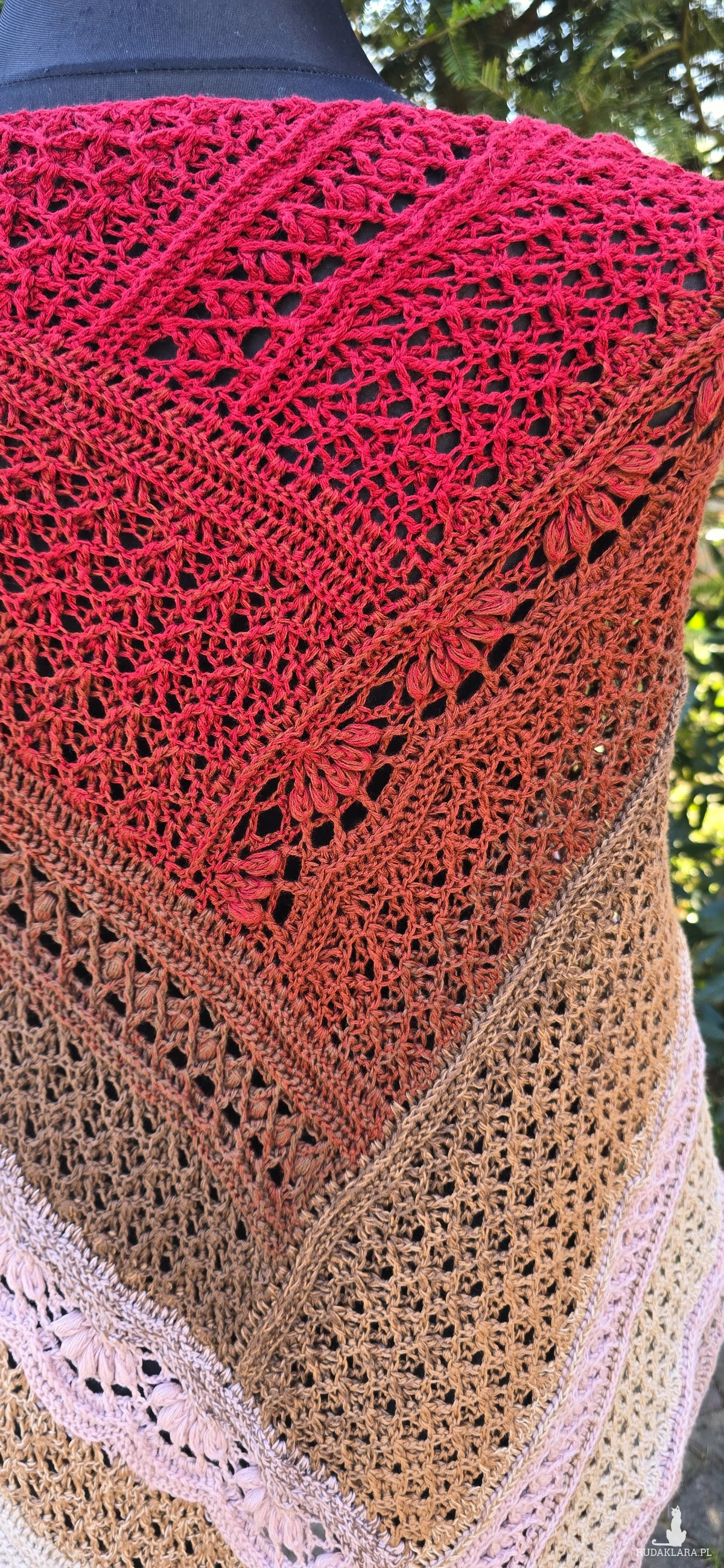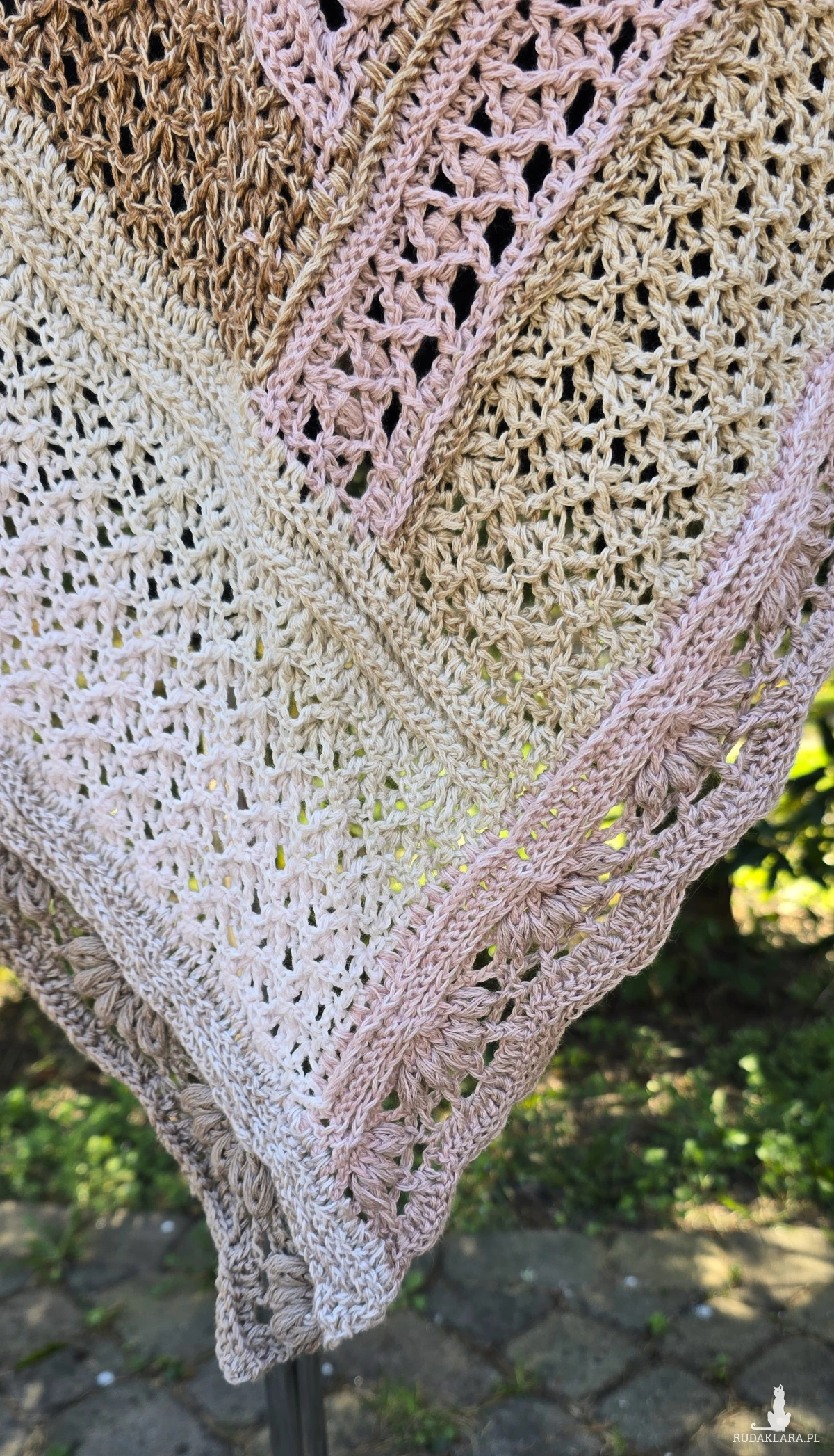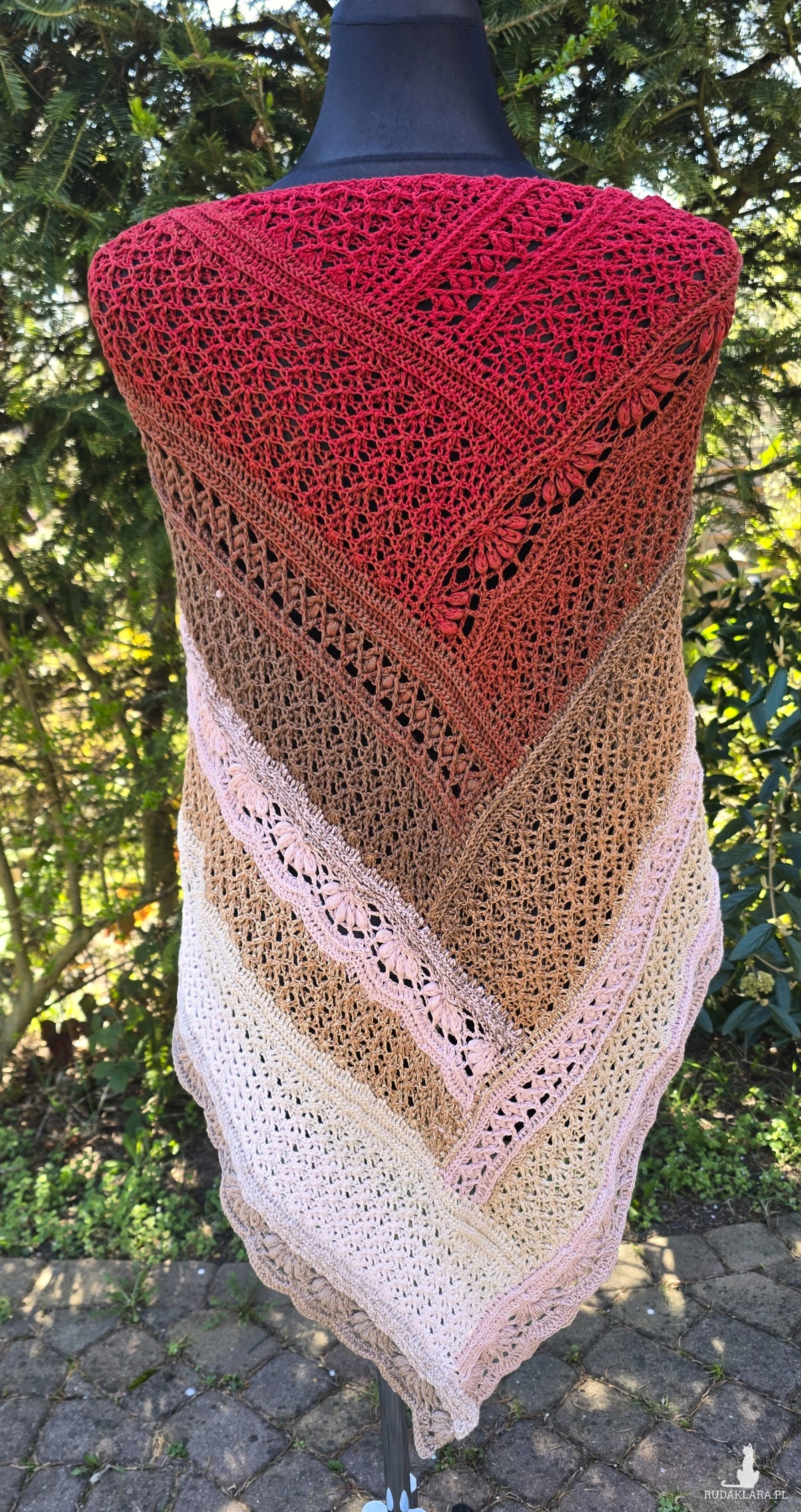 Elegancka, stonowana kolorystycznie chusta szydełkowa handmade. Prosta (pozbawiona nadmiernej ilości ozdobników), ale bardzo oryginalna ze względu na konstrukcję. Chusta wykonana z włóczki ombre bawełna / akryl (50/50) zakupionej w małej polskiej manufakturze. Doskonałe uzupełnienie stroju na chłodniejsze dni.