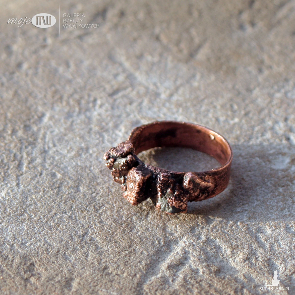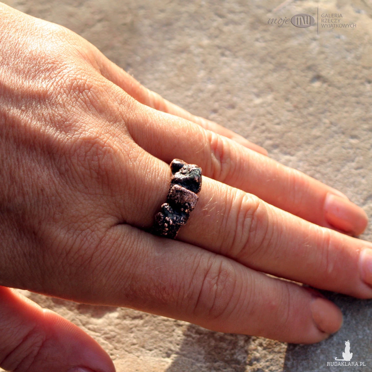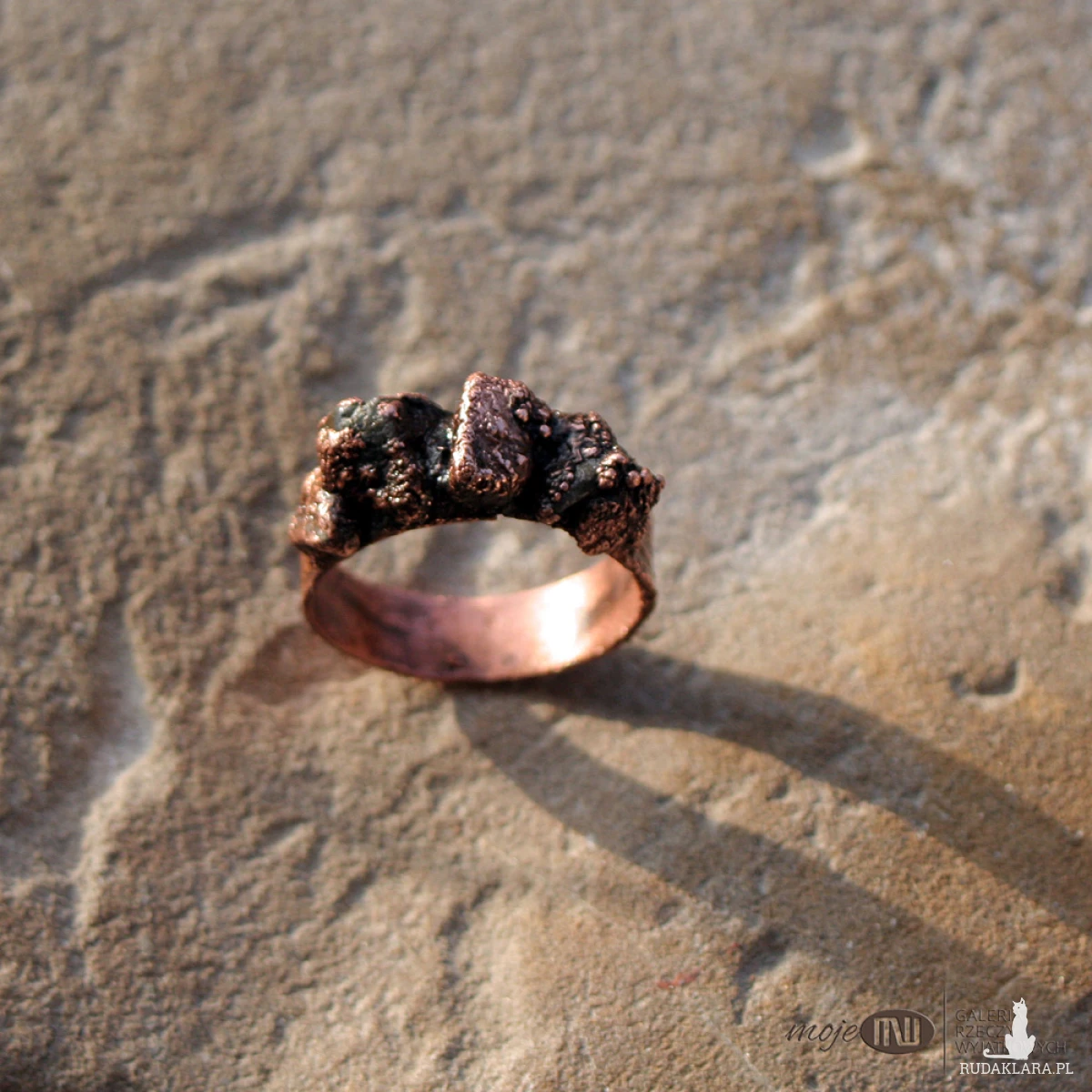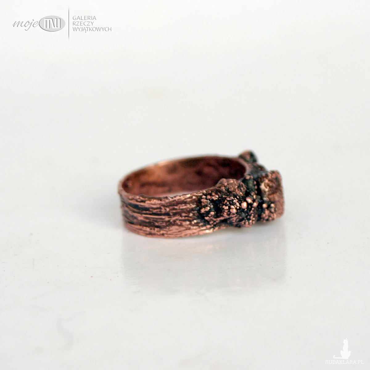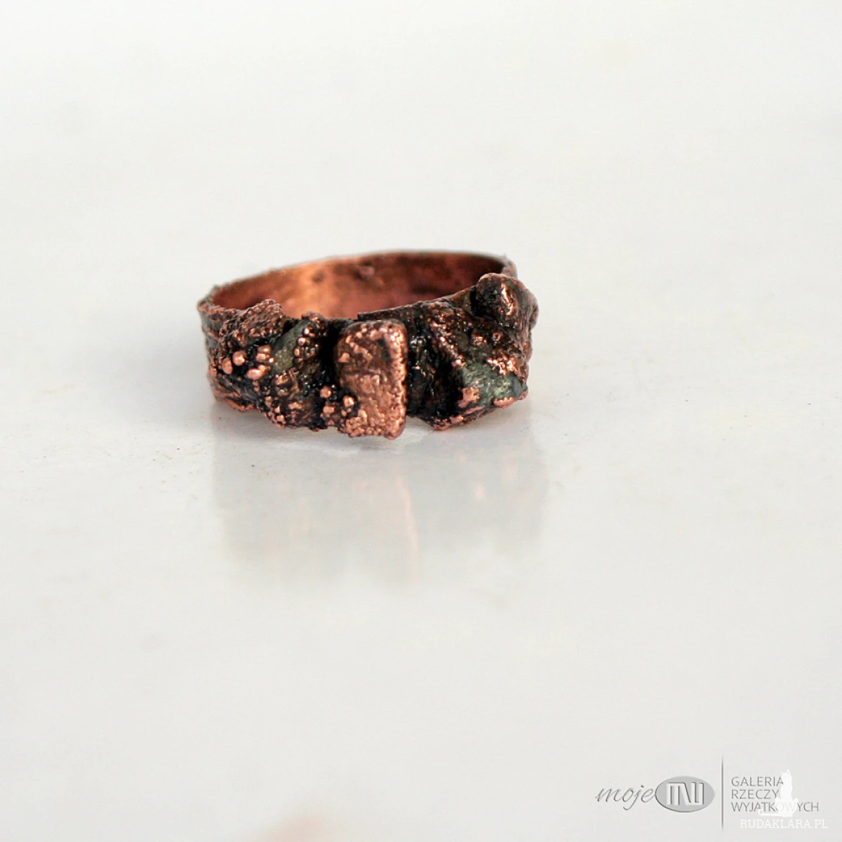 Pierścionek, którego struktura powierzchni powstała z miedzi w technice elektroformowania, stąd jej nierówność i chropowatość. Miedź niemal całkowicie pokryła kamyczki turmalinu - tylko gdzieniegdzie przezierają szarozielone kamyki, dlatego pierścionek wygląda jakby był tylko miedziany. Miedź jest patynowana i przecierana dla wydobycia faktury.