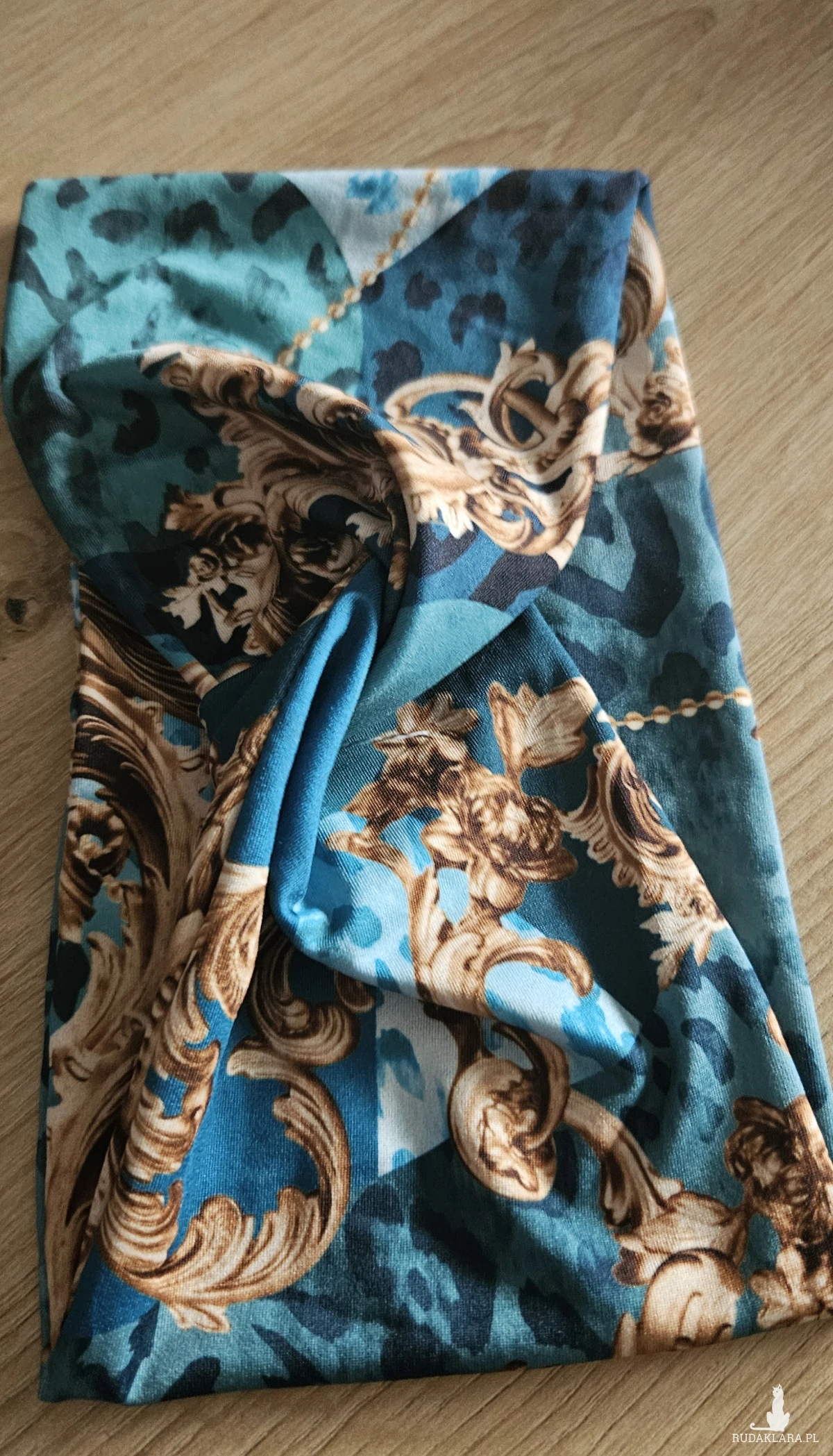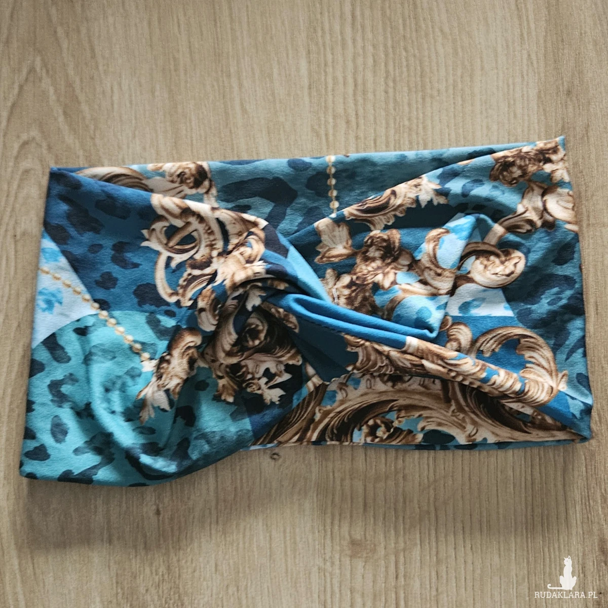 Oto opis kolorowej, ręcznie szytej opaski na głowę z dzianiny: