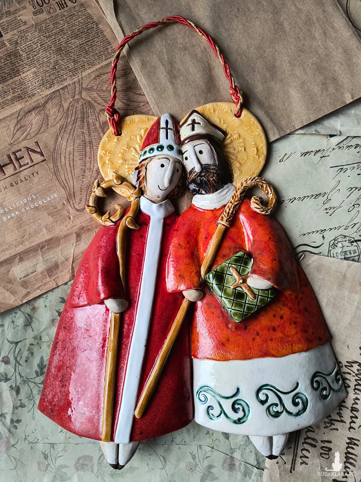 Zawieszka z wizerunkiem Św. Stanisława oraz Św. Cezarego z Arles, wykonana z gliny szamotowej, wypalona na biskwit, a następnie szkliwiona w temperaturze 1260 stopni C. Wymiary ok 25 cm x 22 cm. Do powieszenia na ścianie na ozdobnym sznureczku. Idealna jako prezent okolicznościowy lub do ozdoby domu. Czas oczekiwania na realizację ok 2-3 tygodni, a w czasie wzmożonej sprzedaży lub przy większych zamówieniach do 30 dni roboczych.