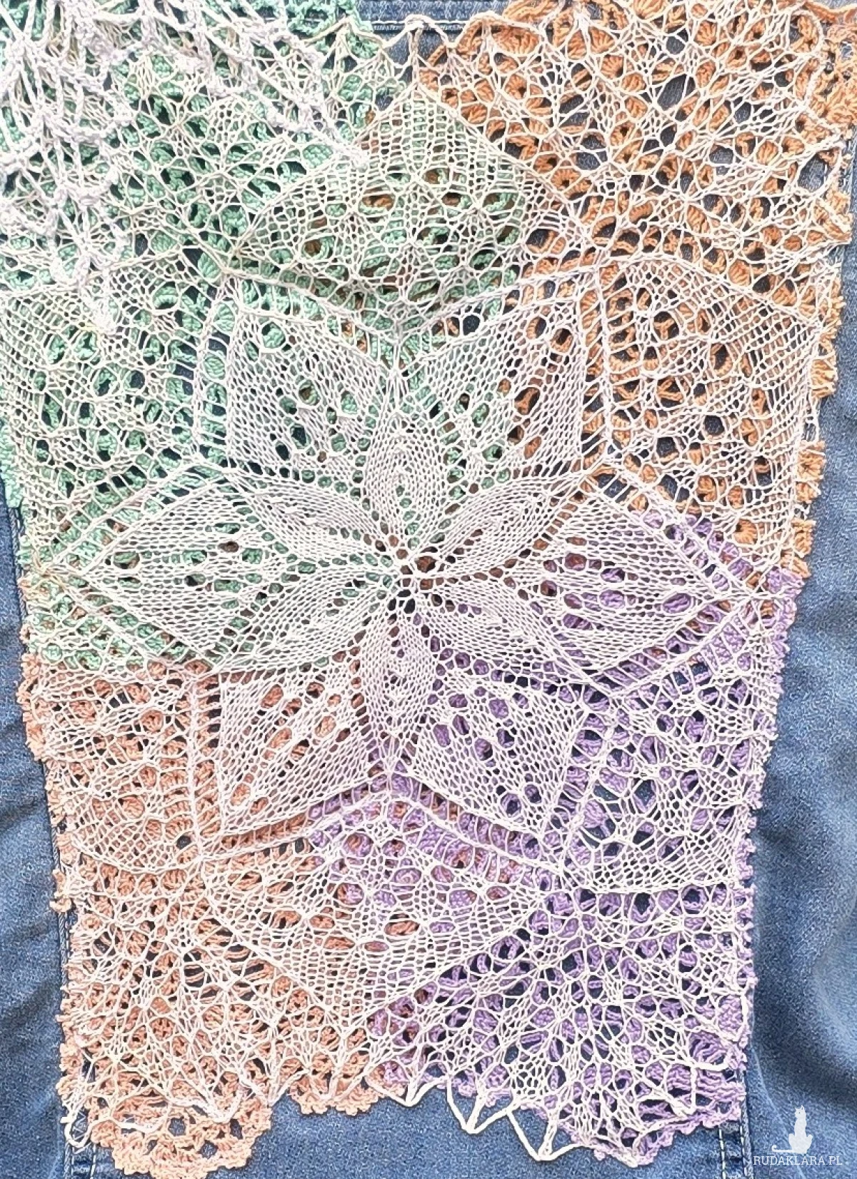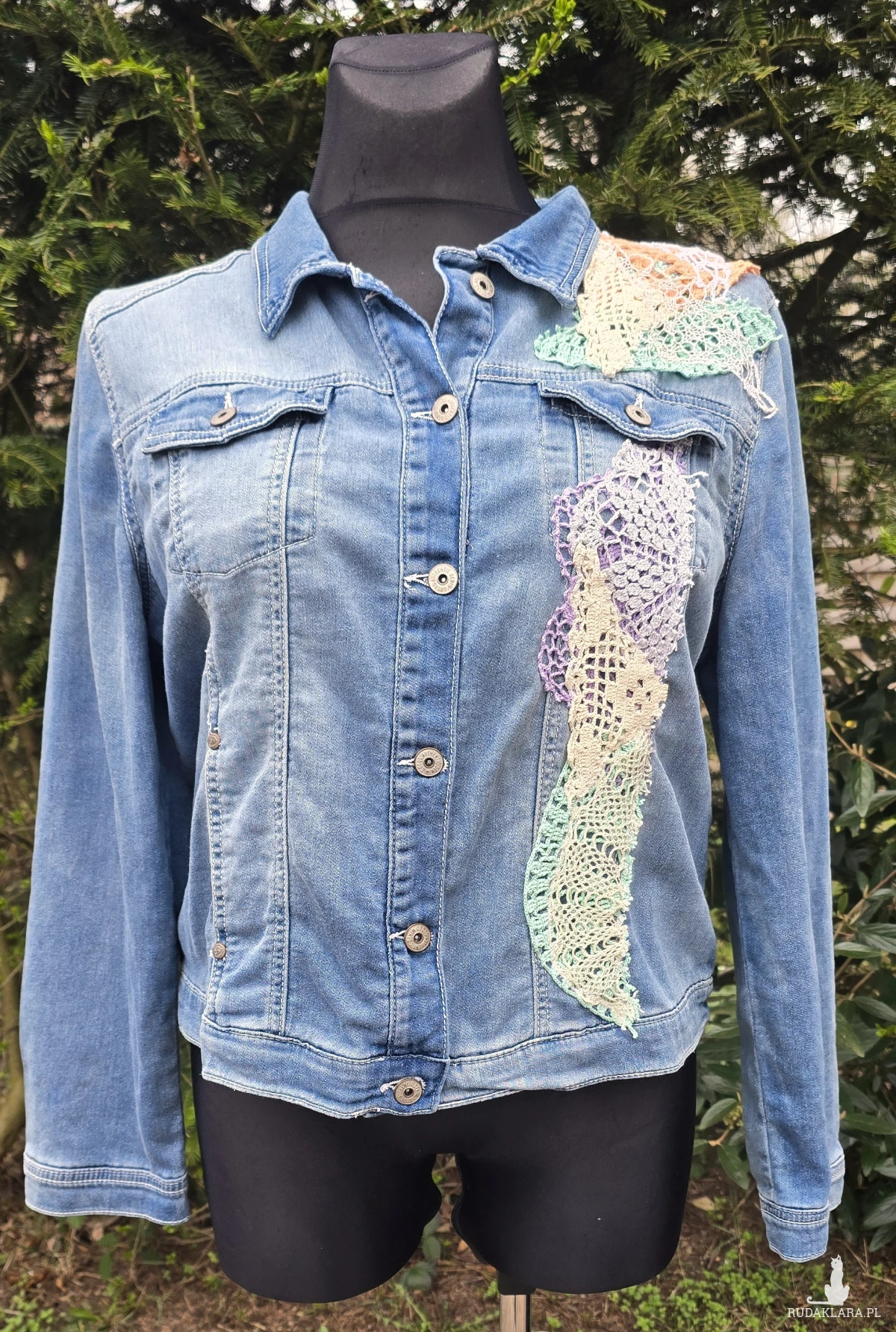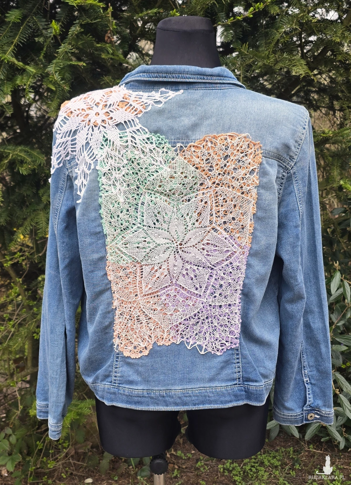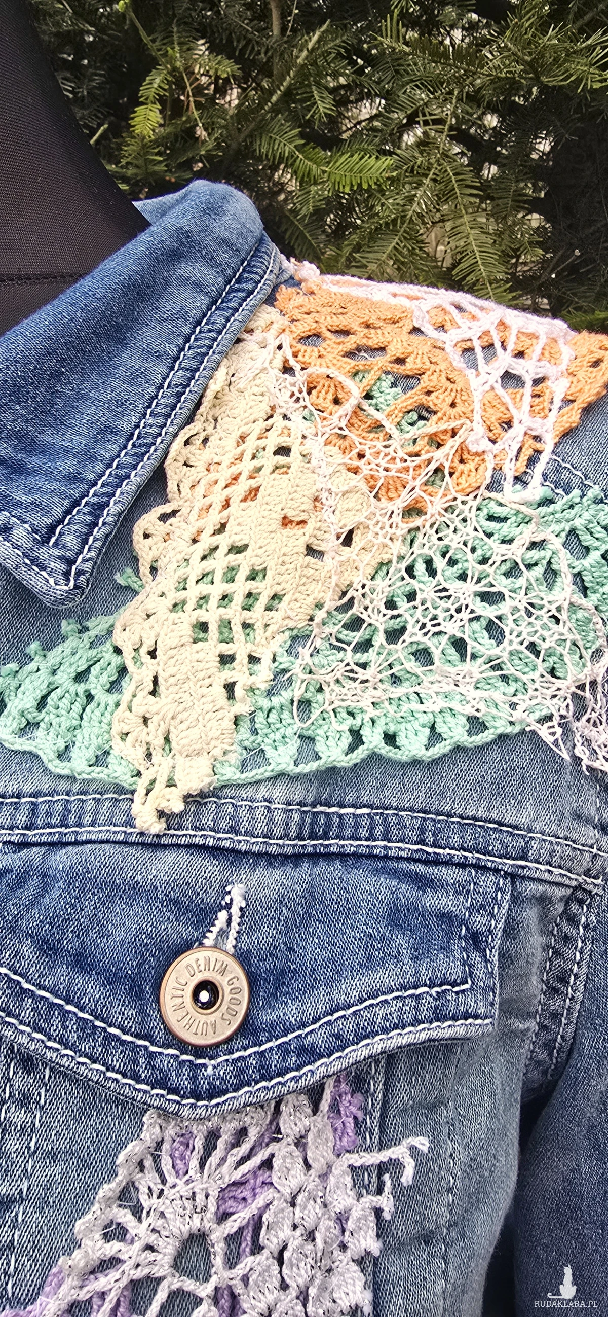 Do stworzenia tej kurtki użyłam dekoracyjnych kolorowych elementów dzierganych na szydełku, które pozakładałam jeden na drugi aby stworzyły interesujący i niepowtarzalny wzór. Niestety z powodu mojej twórczości można używać tylko jednej kieszeni – tej pozbawionej aplikacji.