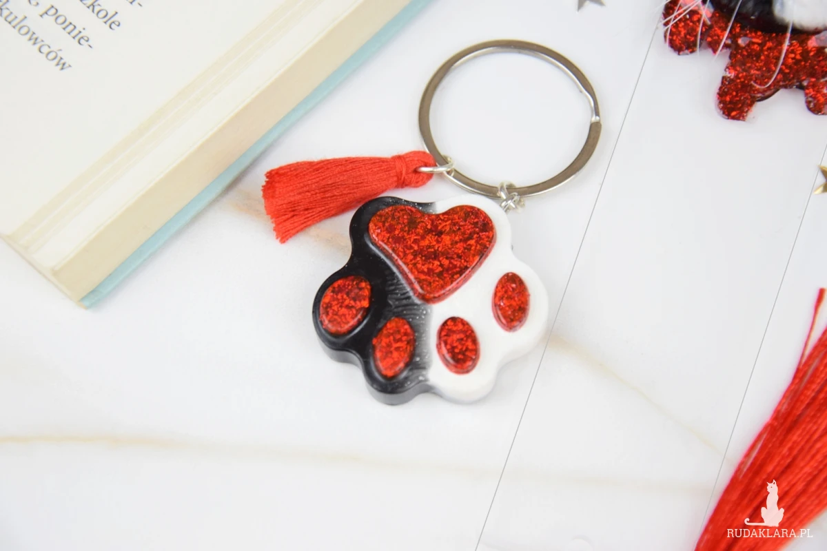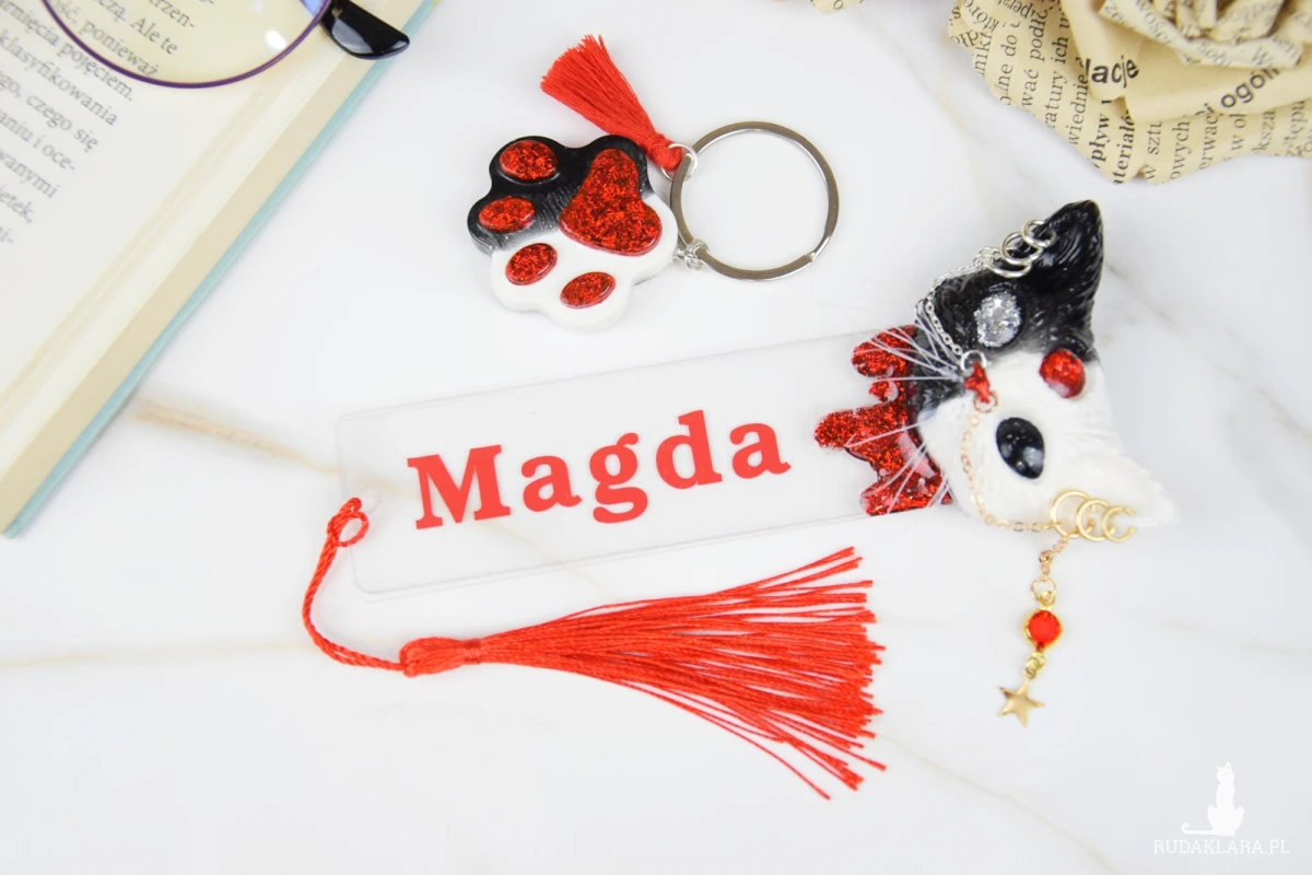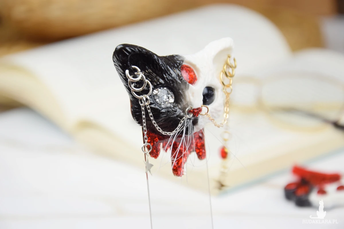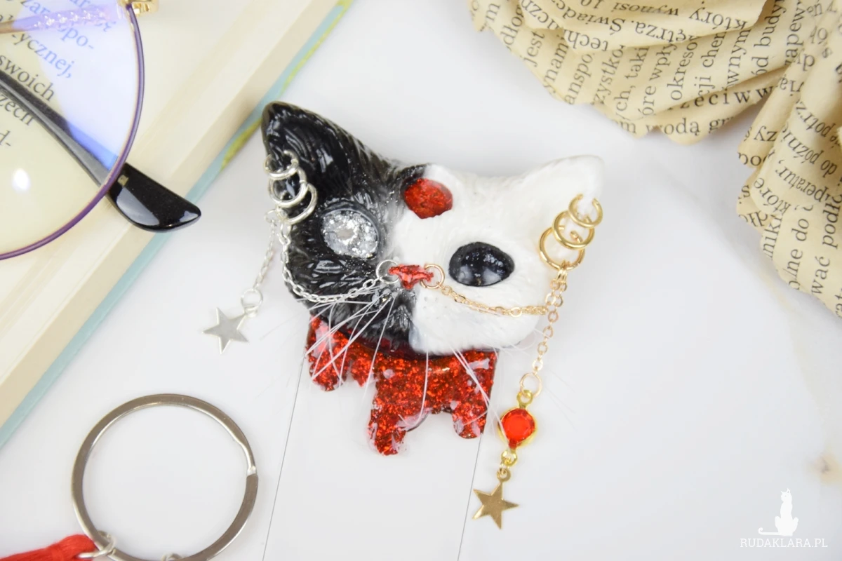 Głowa kota jest trójwymiarowa, co nadaje jej wyjątkowy, realistyczny wygląd. Dodatkowo, została starannie ozdobiona ręcznie układaną biżuterią, która nawiązuje do hinduskich motywów. Te bogate detale wprowadzają element egzotyki i kulturowego bogactwa, sprawiając, że każdy egzemplarz jest unikalny i pełen charakteru. W komplecie z zakładką do książki jest brelok z żywicy w kształcie kociej łapy to ciekawy i oryginalny dodatek, idealny dla miłośników kotów.