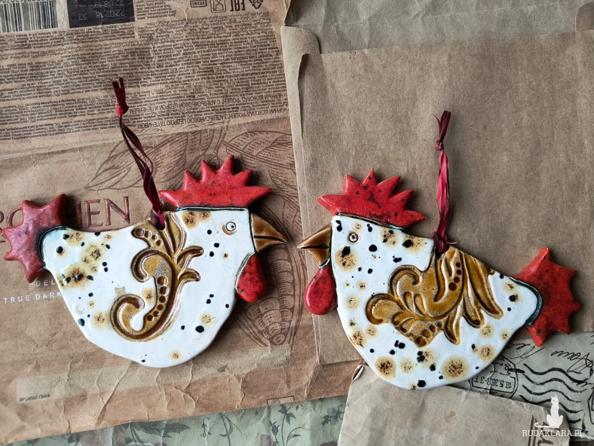 Kury nakrapiane zawieszki, wykonane zostały z gliny szamotowej, wypalone na biskwit, a następnie szkliwione w temp ok 1260 stopni C. Wymiary ok 13 cm x 9 cm. Polecam serdecznie do ozdoby kuchni lub jako upominek wielkanocny.