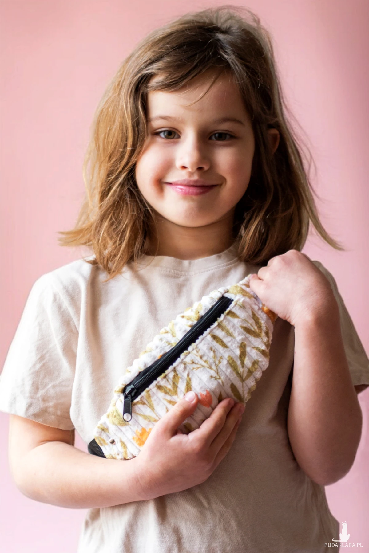 Mała saszetka, torebka biodrowa, nerka dla dziecka wykonana z grubego sztruksu w kolorze ecru w kwiaty. Zapinana na suwak.
