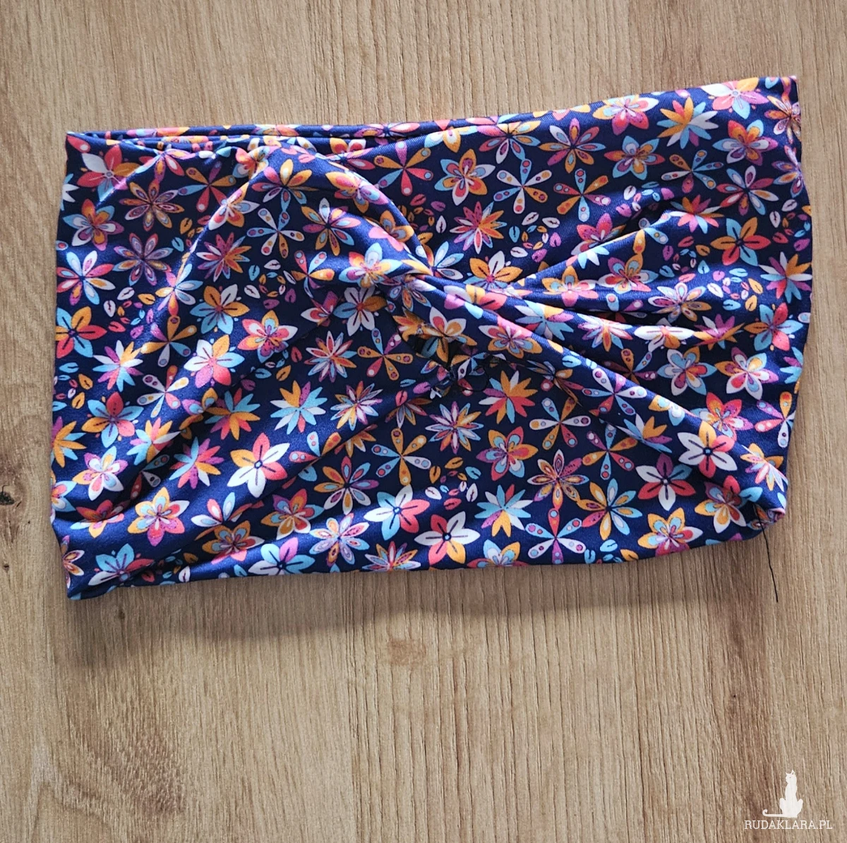Oto opis kolorowej, ręcznie szytej opaski na głowę z dzianiny: