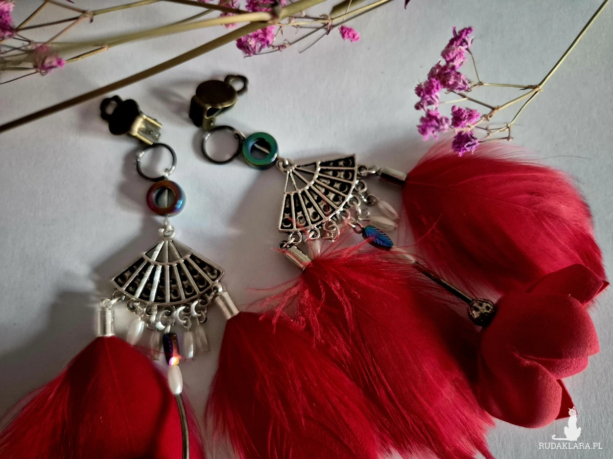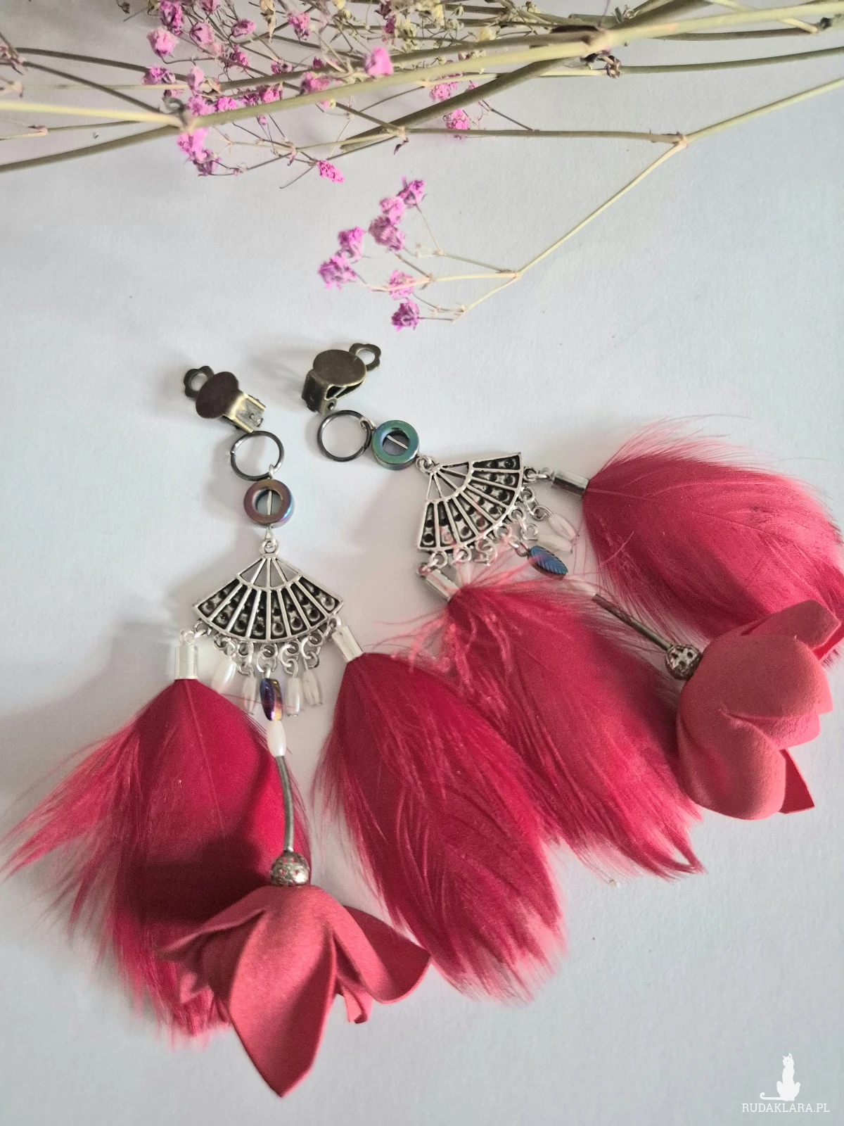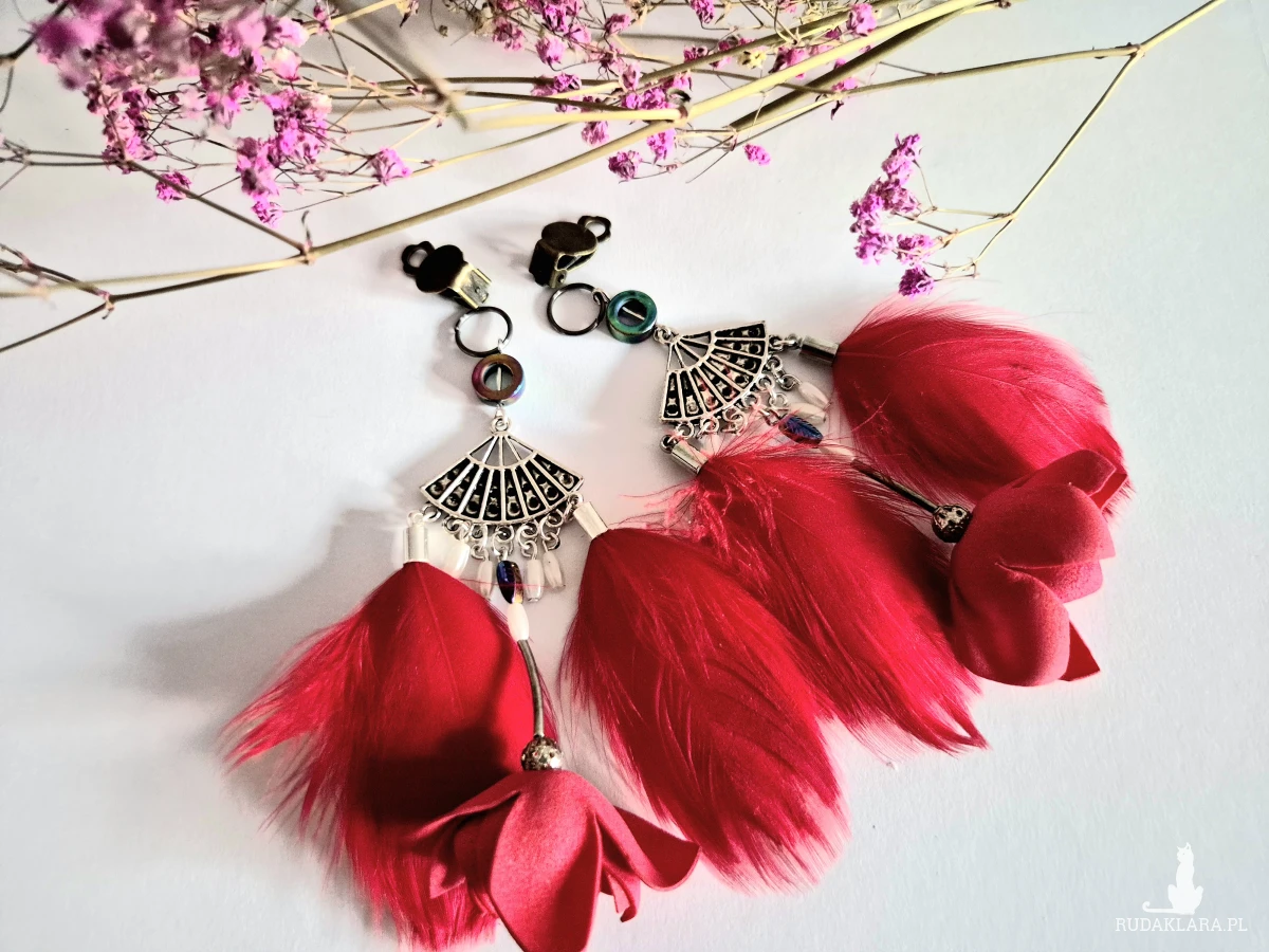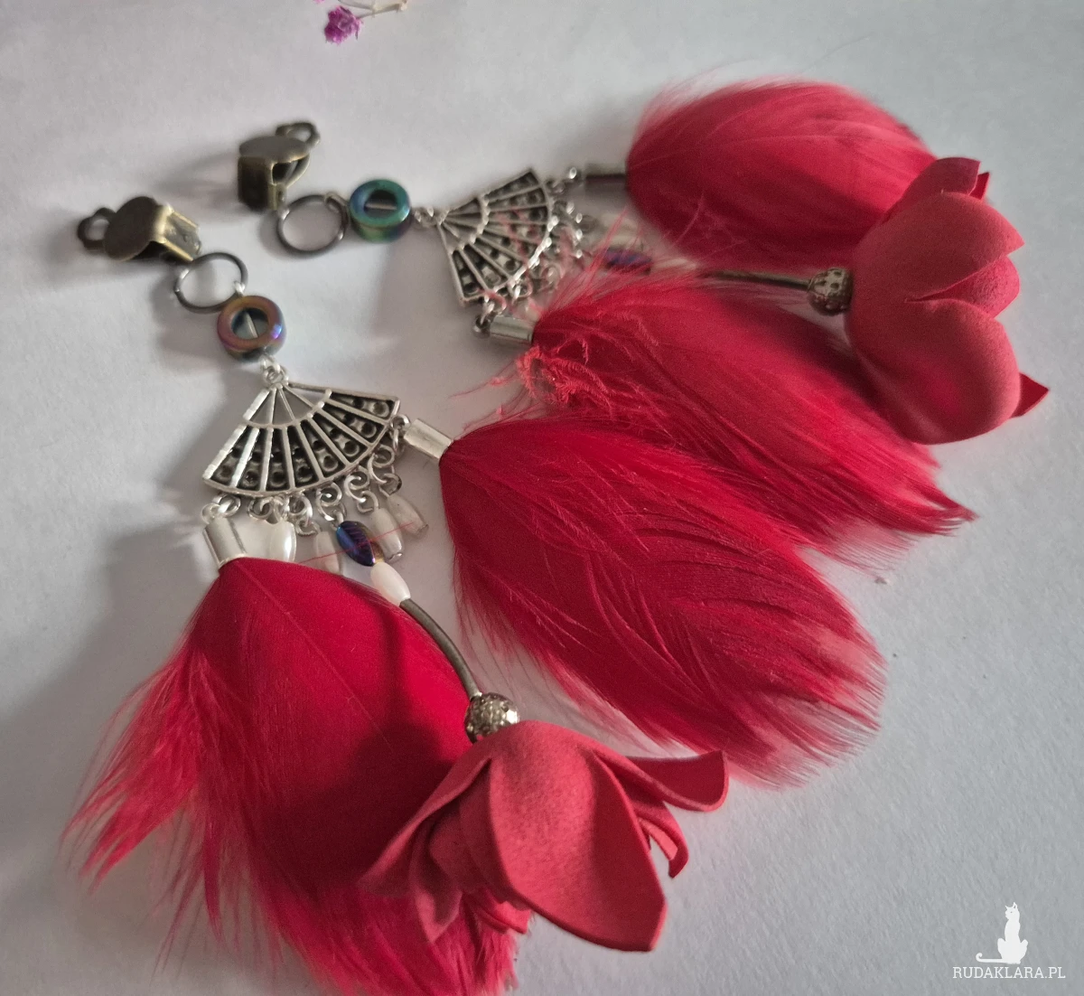 Klipsy czerwone kwiaty i pióra lekkie i długie