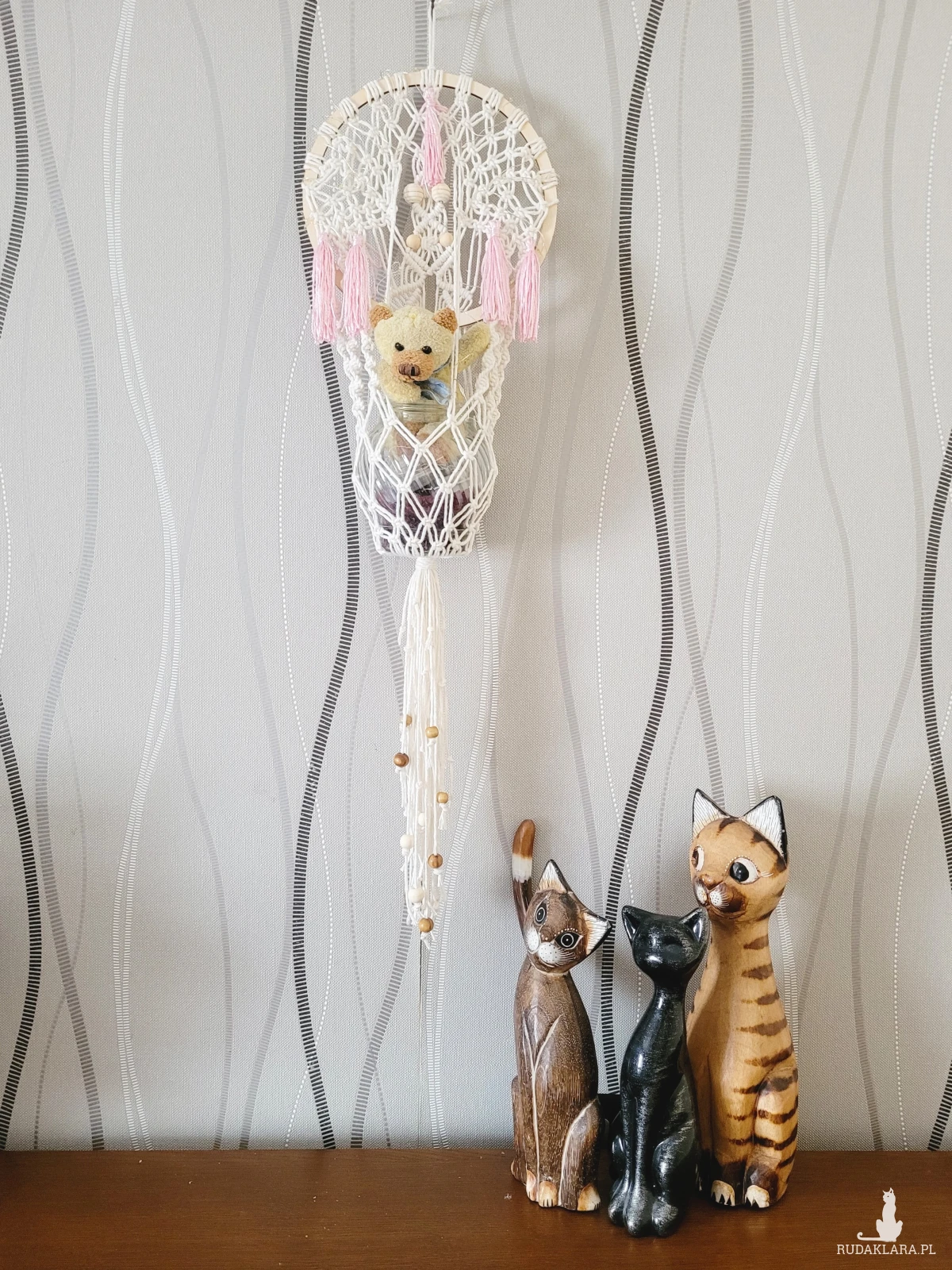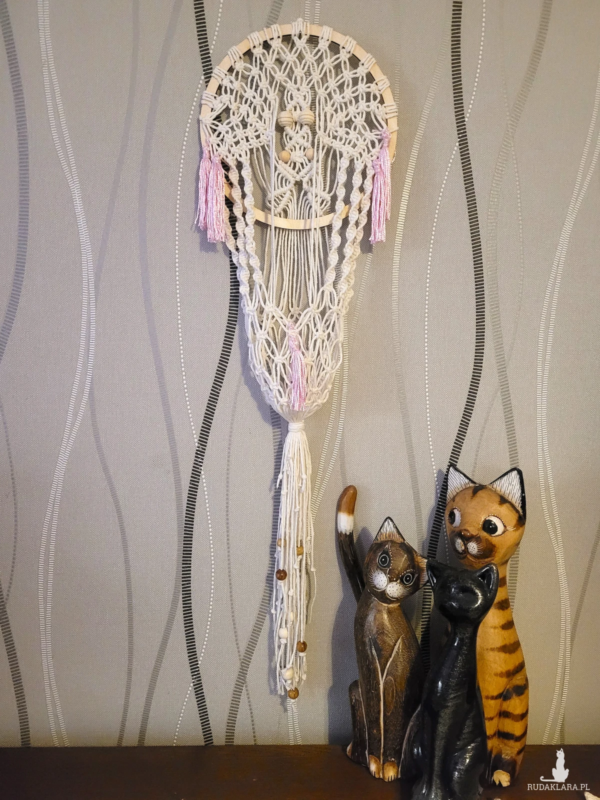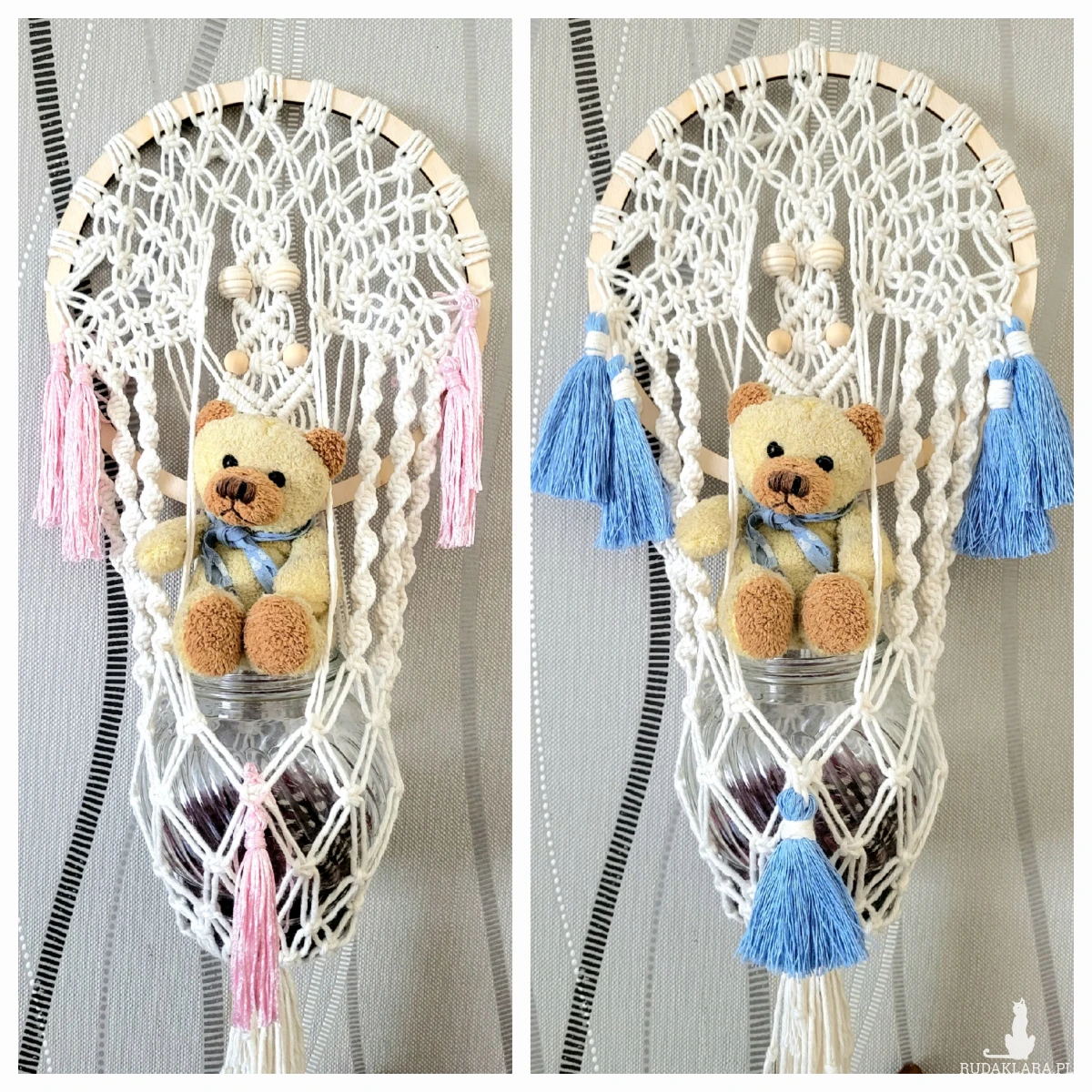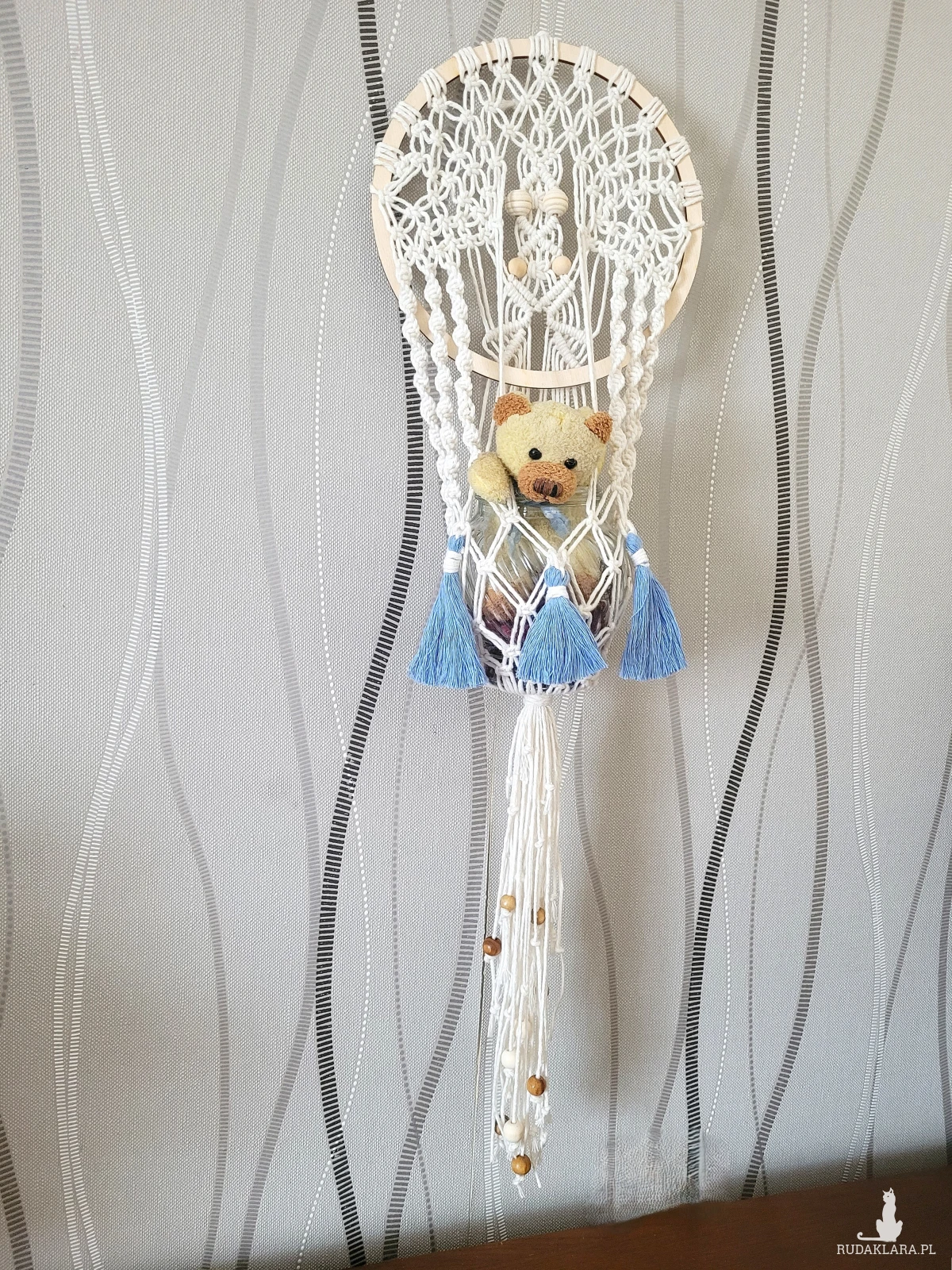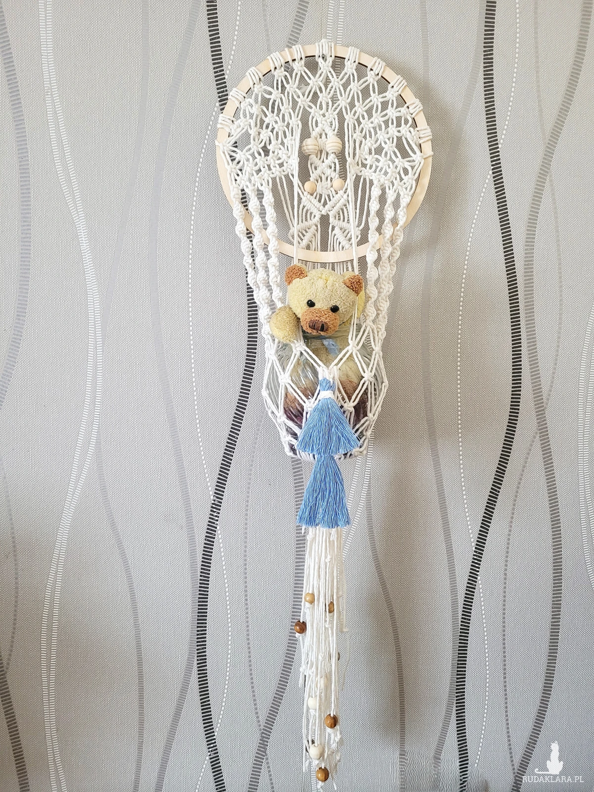 Ozdoba wypleciona ze sznurka bawełnianego w kolorze naturalnym, na obręczy ze sklejki drewnianej, chwosty w kolorze jasnego niebieskiego/błękitu lub jasnego różu- do wyboru, dodatkowo ozdobiona koralikami drewnianymi.