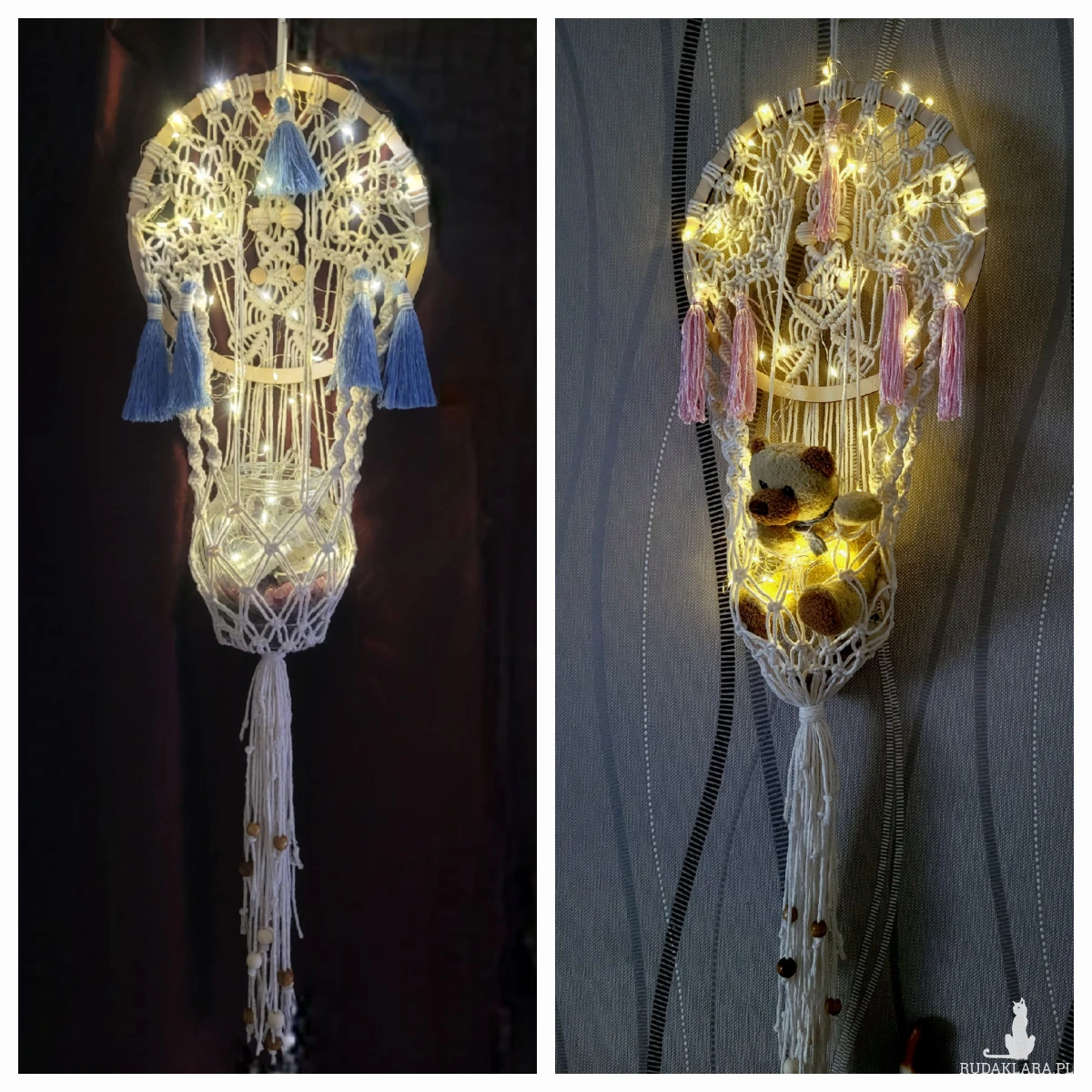 Dla małego dziecka urocza lampka nocna- wybierasz kolor chwostów i miejsce ich zawieszenia.... kolor ,rodzaj lampek i sposób ich założenia -ma to wpływ nie tylko na wygląd ,ale na ilość i natężenie światła...(polecam lampki led na druciku-są najmniej widoczne i najbardziej plastyczne)....czy w szklanym naczyniu czy bez.... z maskotką czy nie.