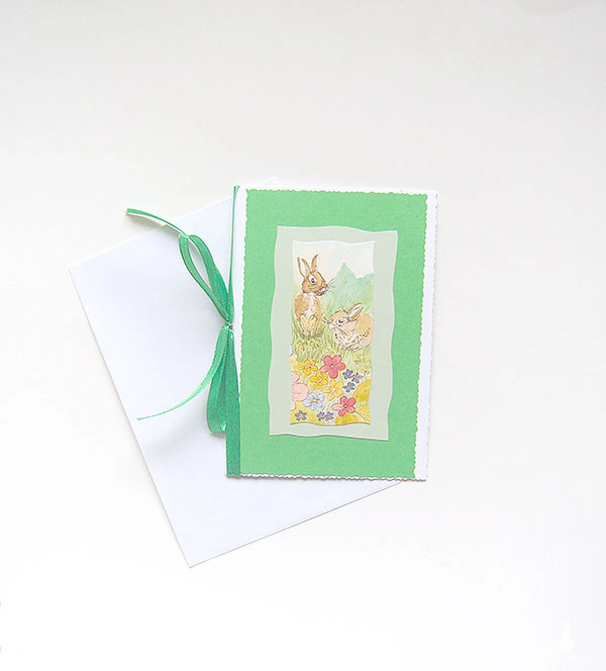 Oryginalna, otwierana kartka z okazji Wielkanocy, gruby kartonik, wstążeczka. Świąteczny karnet jest bez życzeń. Dołączona biała koperta.