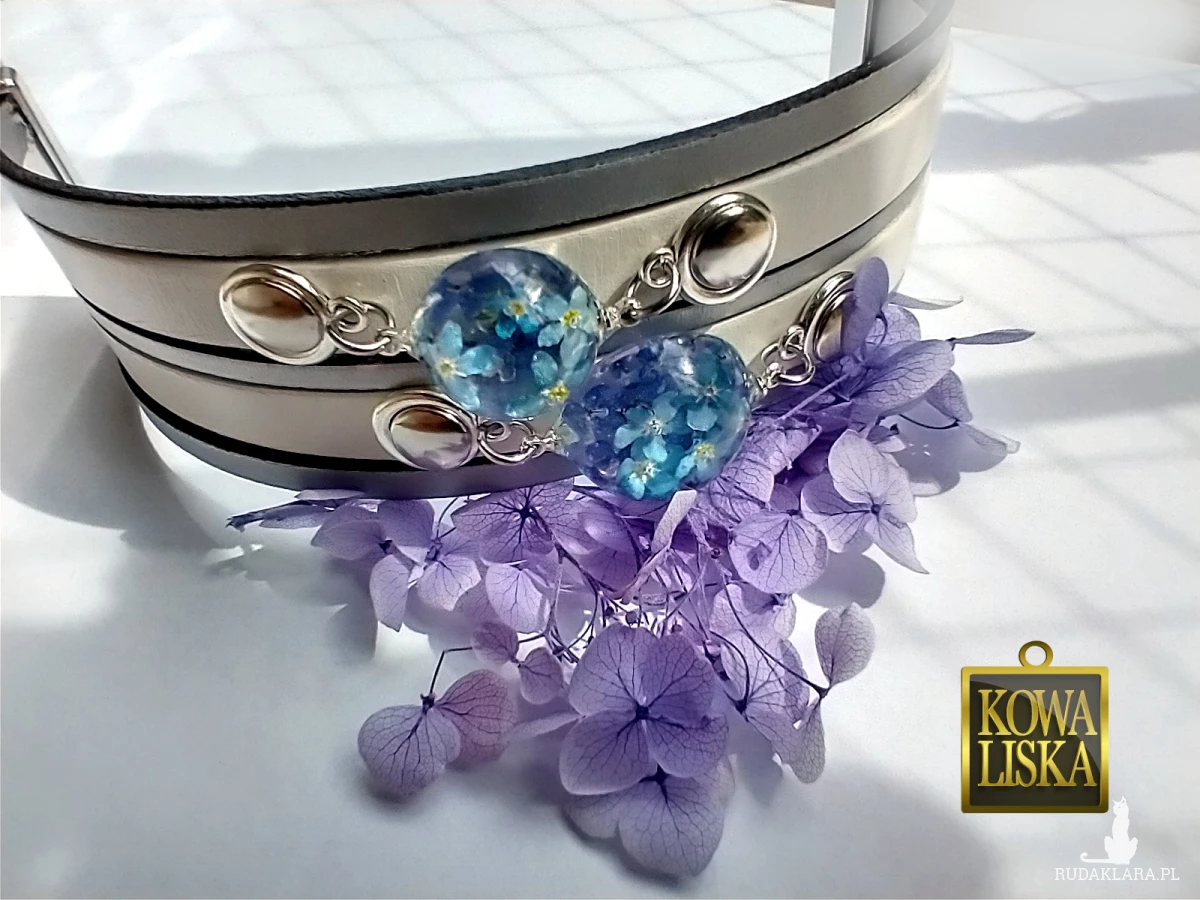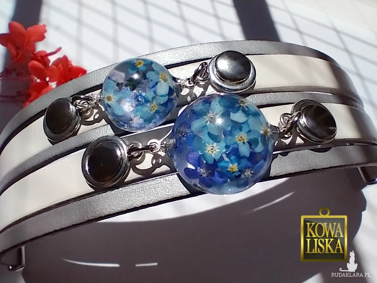 Urocze półkule z zatopionymi wewnątrz delikatnymi kwiatuszkami niezapominajek zostały zamontowane nitami na białych i stalowoszarych rzemiennych paskach. Niezapominajki są własnoręcznie zbierane i suszone.