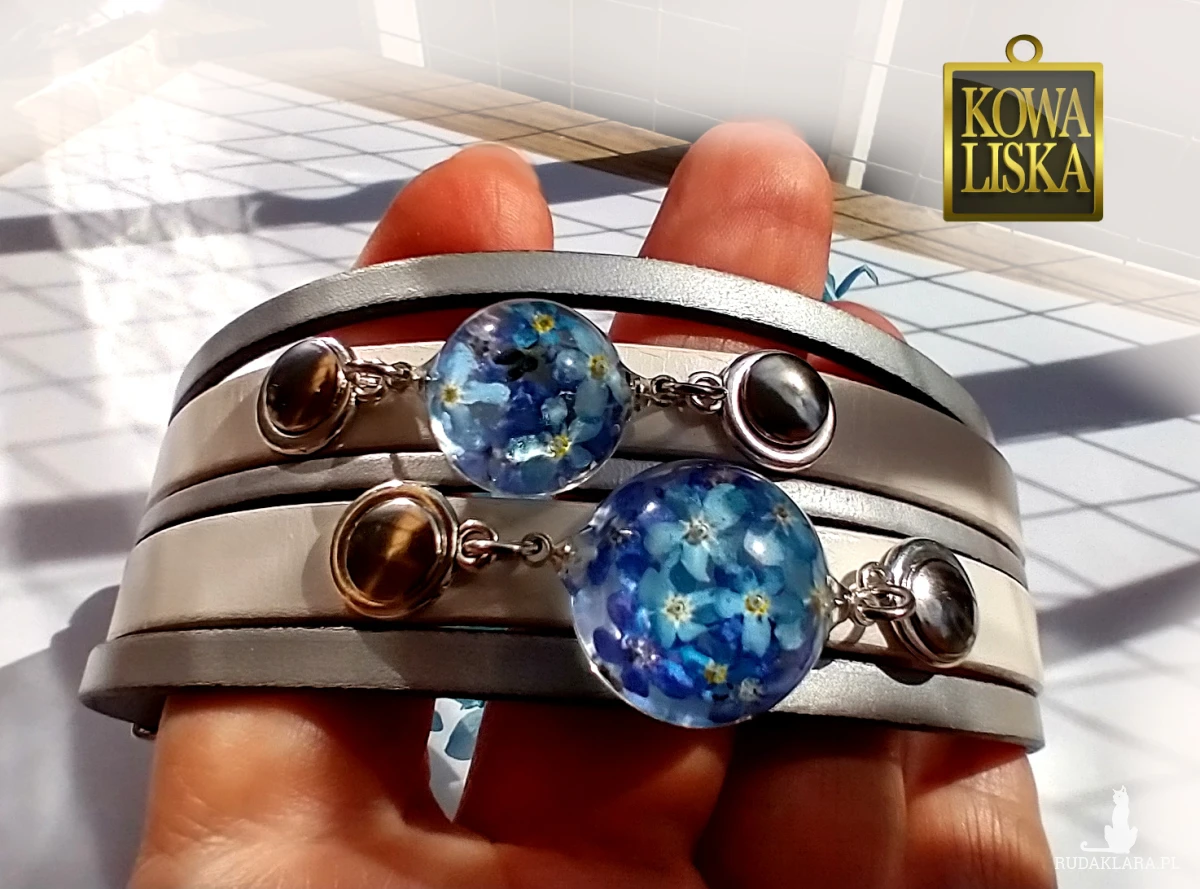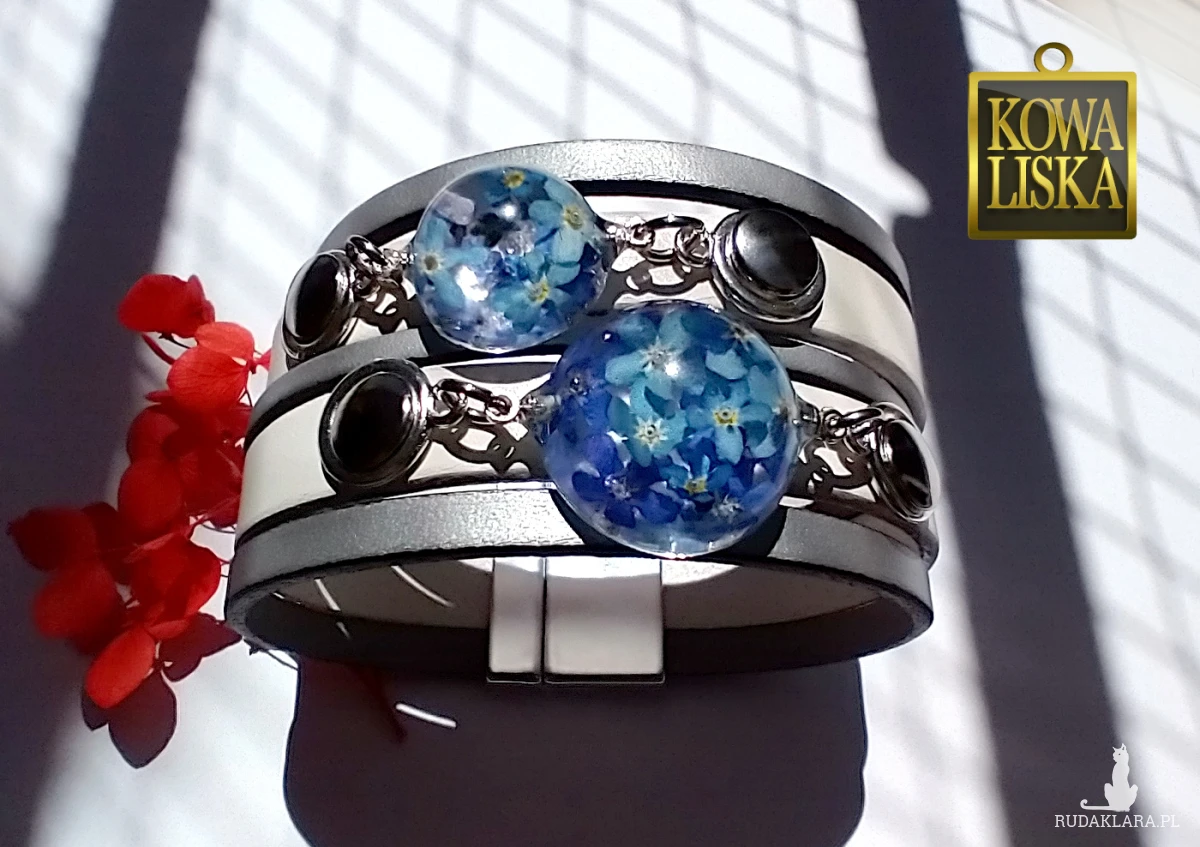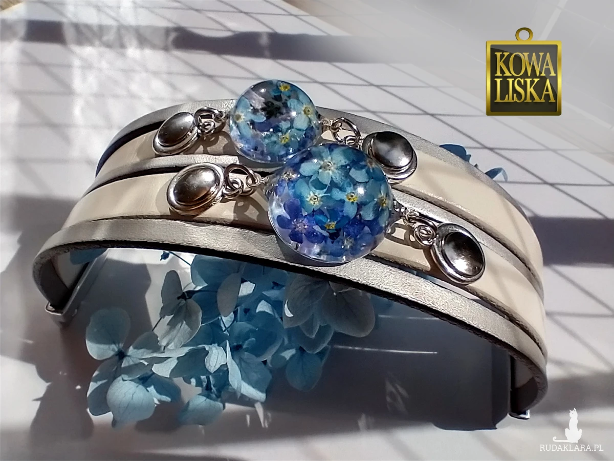 Efektowne połączenie błękitu, bieli i srebra. Ciężkość rzemieni i metalu pięknie się uzupełnia z eterycznością polnych kwiatów. Bransoleta bardzo dobrze leży i pięknie odbija światło, jest widoczna z daleka. Słońce wydobywa z niej kolor i blask, dlatego jest idealna na lato.