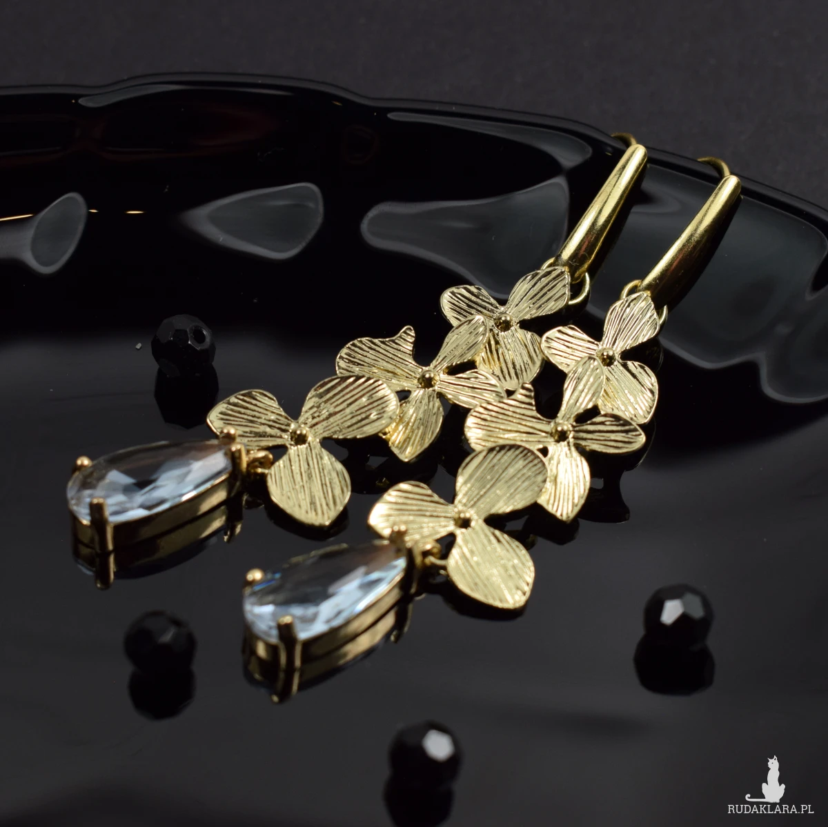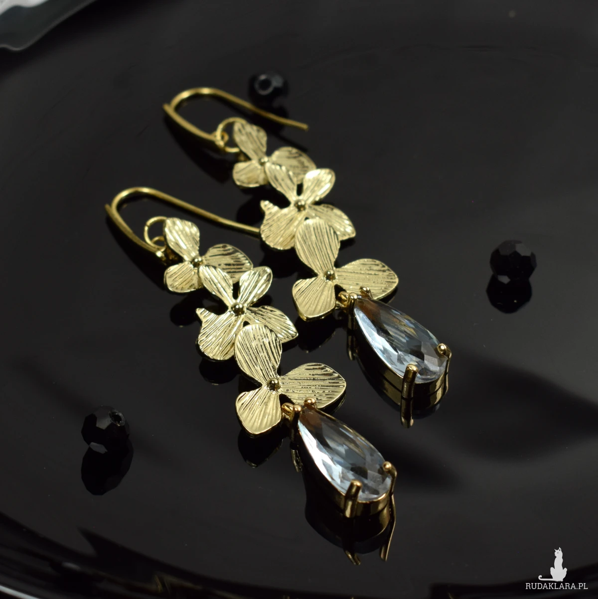 Zjawiskowe, eleganckie kolczyki w odcieniu delikatnego złota, z motywem kwiatowym oraz kryształem w kolorze delikatnej lawendy.
