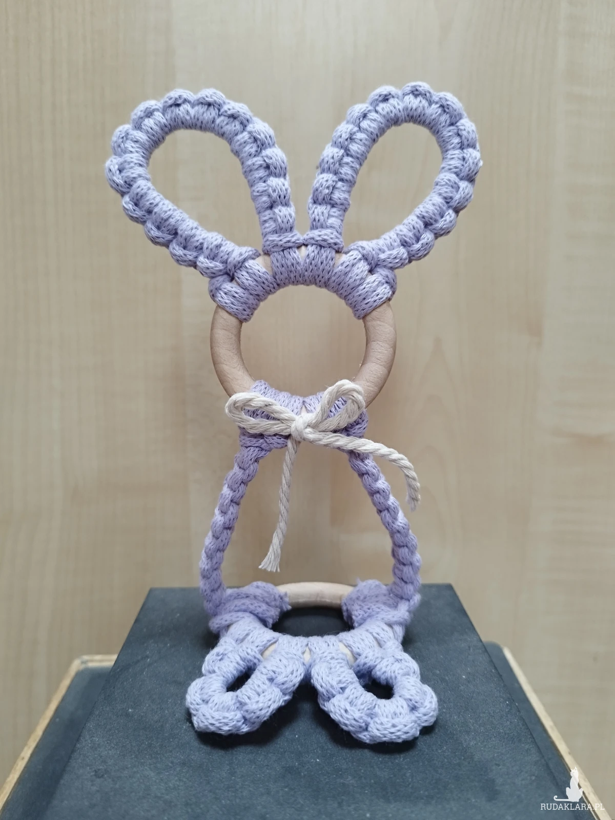 Zajączek wielkanocny zrobiony ze sznurka bawełnianego. Może być ozdobą na wielkanocnym stole. Można włożyć do środka pisankę lub jajko niespodziankę