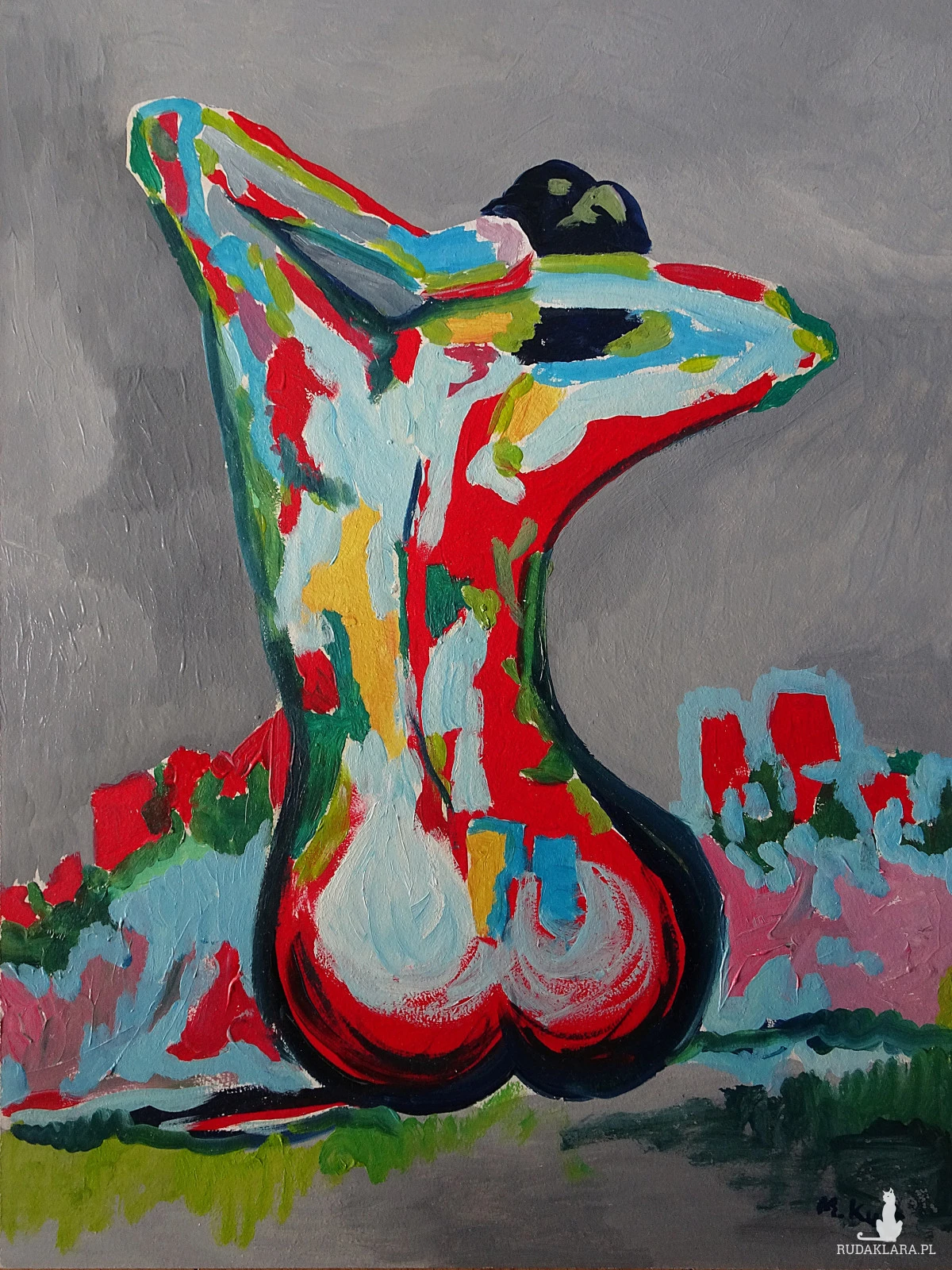 Na obrazie widzimy intrygującą, abstrakcyjną formę, która przykuwa wzrok feerią barw. Dominują intensywne czerwienie i zielenie, które płynnie przechodzą w błękity, żółcie i odcienie różu. Kontury są miękkie, rozmyte, a jednak wyraziście podkreślają centralną postać. Tło jest szare, co dodaje całości surowości i kontrastuje z kolorami postaci. Kompozycja jest dynamiczna, niemalże pulsująca energią, przypominając mi burzę emocji zatrzymaną w czasie. Atmosfera obrazu jest z jednej strony spokojna, z drugiej - tętni niespokojnym rytmem.