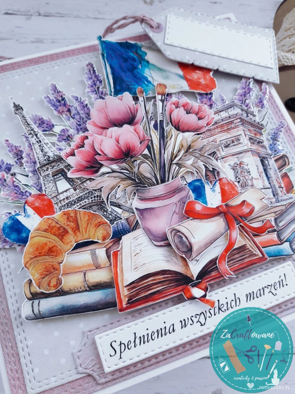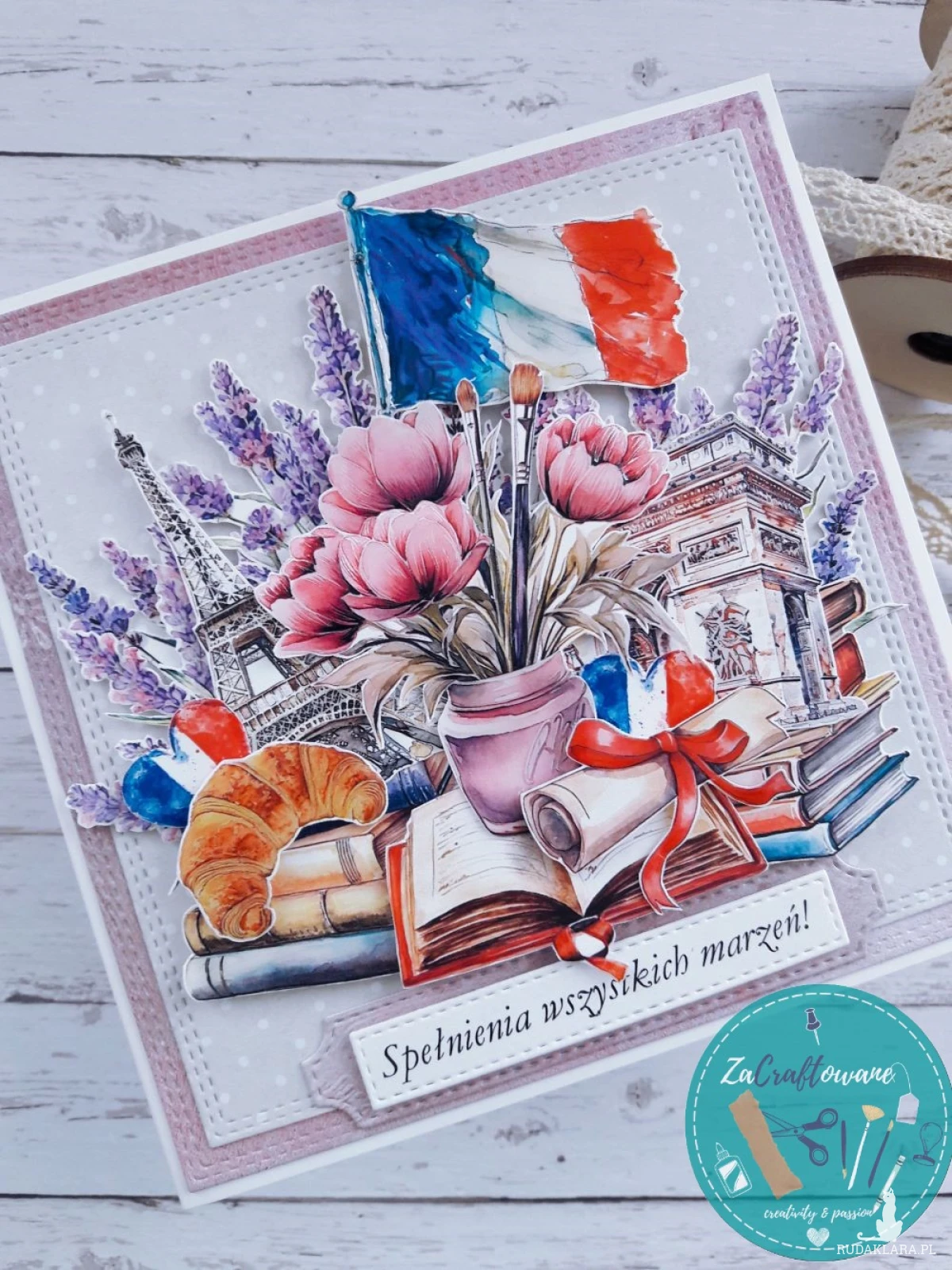 Warstwowa kartka urodzinowa dla miłośniczki Francji z efektem 3D wykonana metodą scrapbookingu z wykorzystaniem profesjonalnych materiałów i dbałością o każdy szczegół.