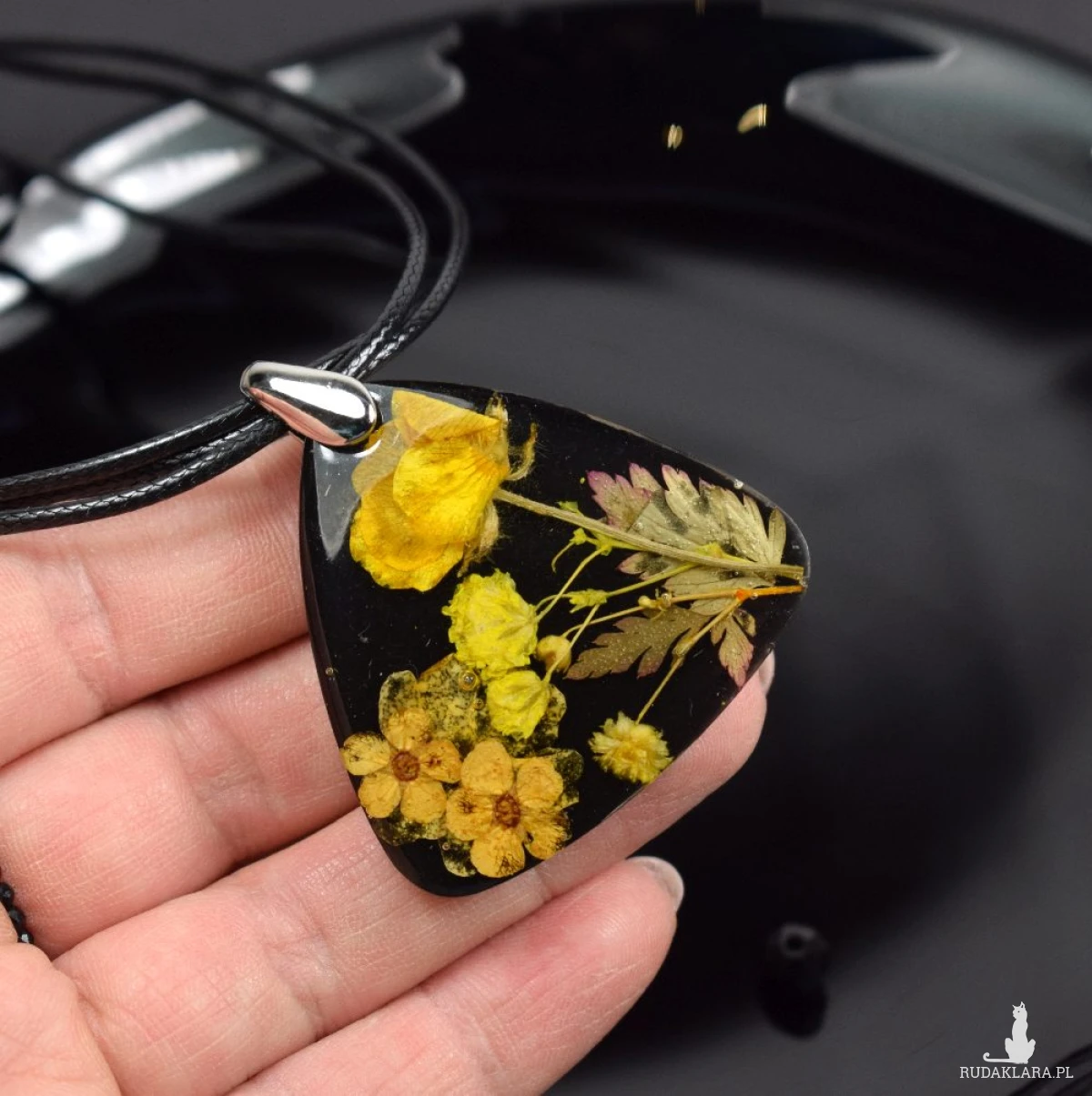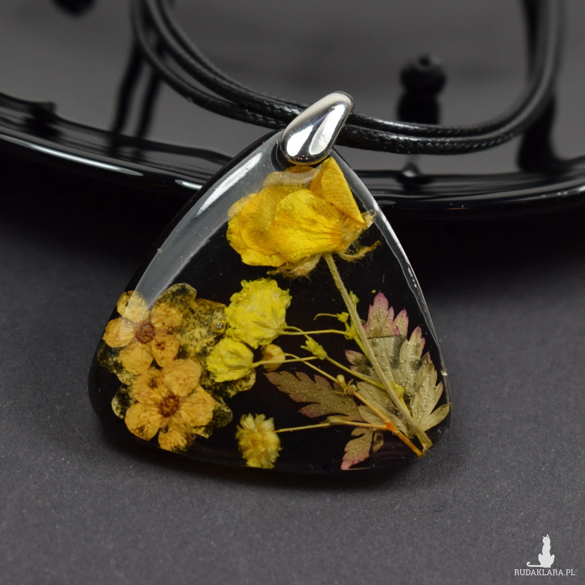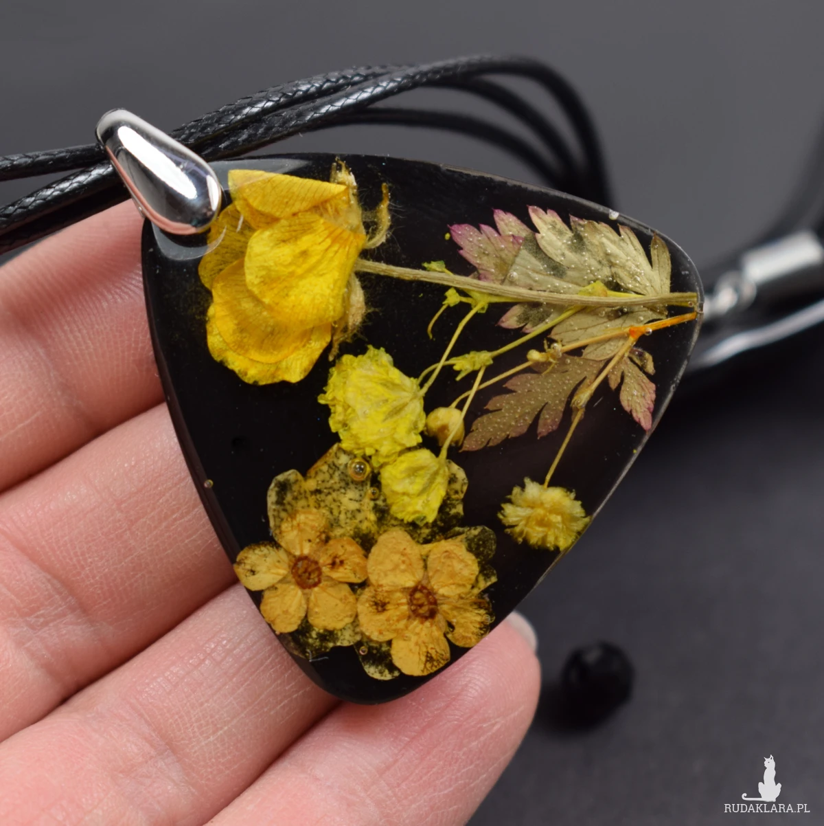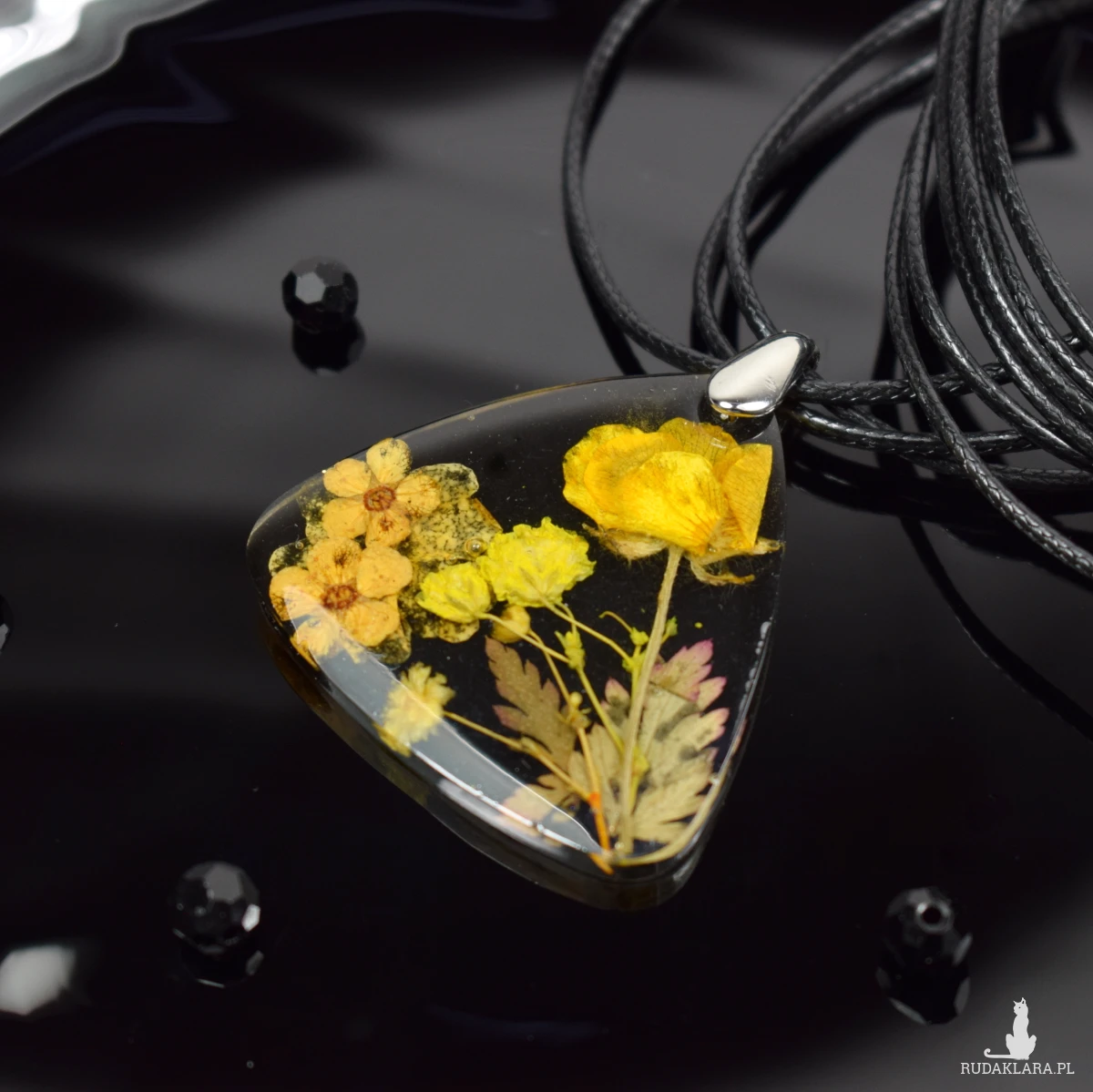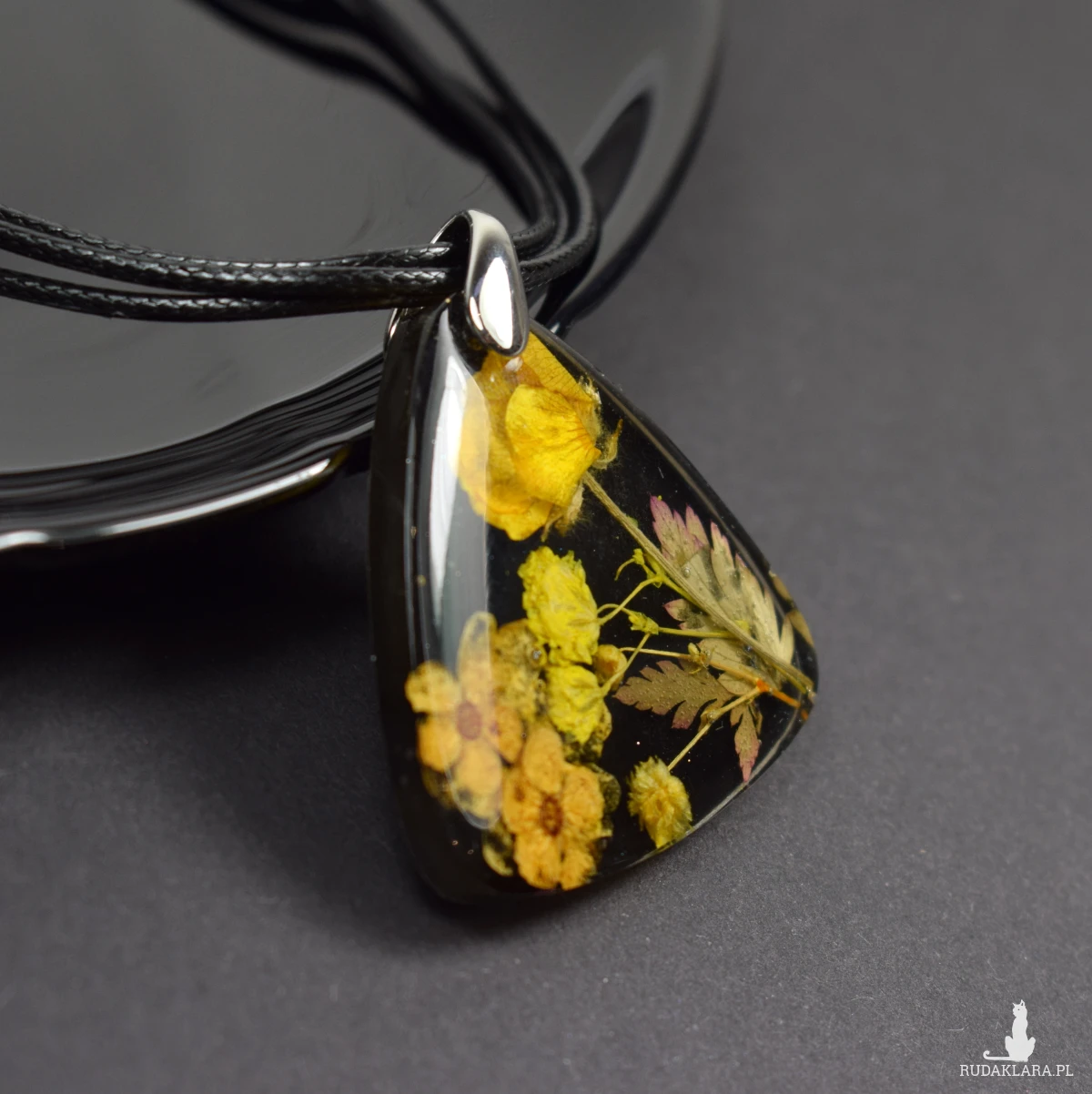 Niezwykły, ręcznie wykonany naszyjnik z żółtymi kwiatami i roślinkami zatopionymi w żywicy.